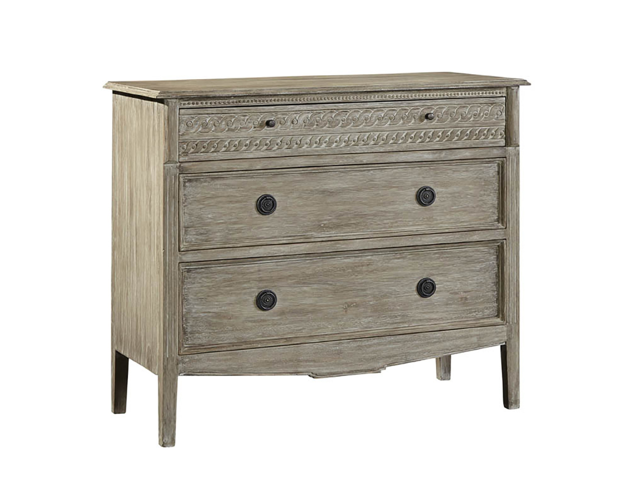 Quietly stunning, the deco lines of this graceful chest are enhanced by the beaded detailing and carved bands accenting the top rail and drawer. The soft gray finish has a dry brushed appearance and blends well with many stylish palettes.