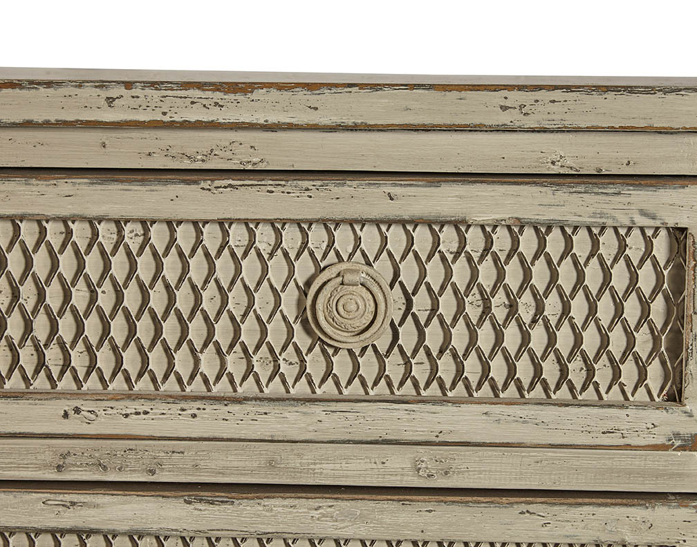 Standing on its tip toes, this well scaled chest has turned legs which lead your eye up to the rounded pilasters. The three generous drawers have an eye catching detail created by floating metal mesh just above the drawer fronts to create a subtle changing pattern which makes you do a double take. Soft natural tones blend to create a finish which plays well with others.