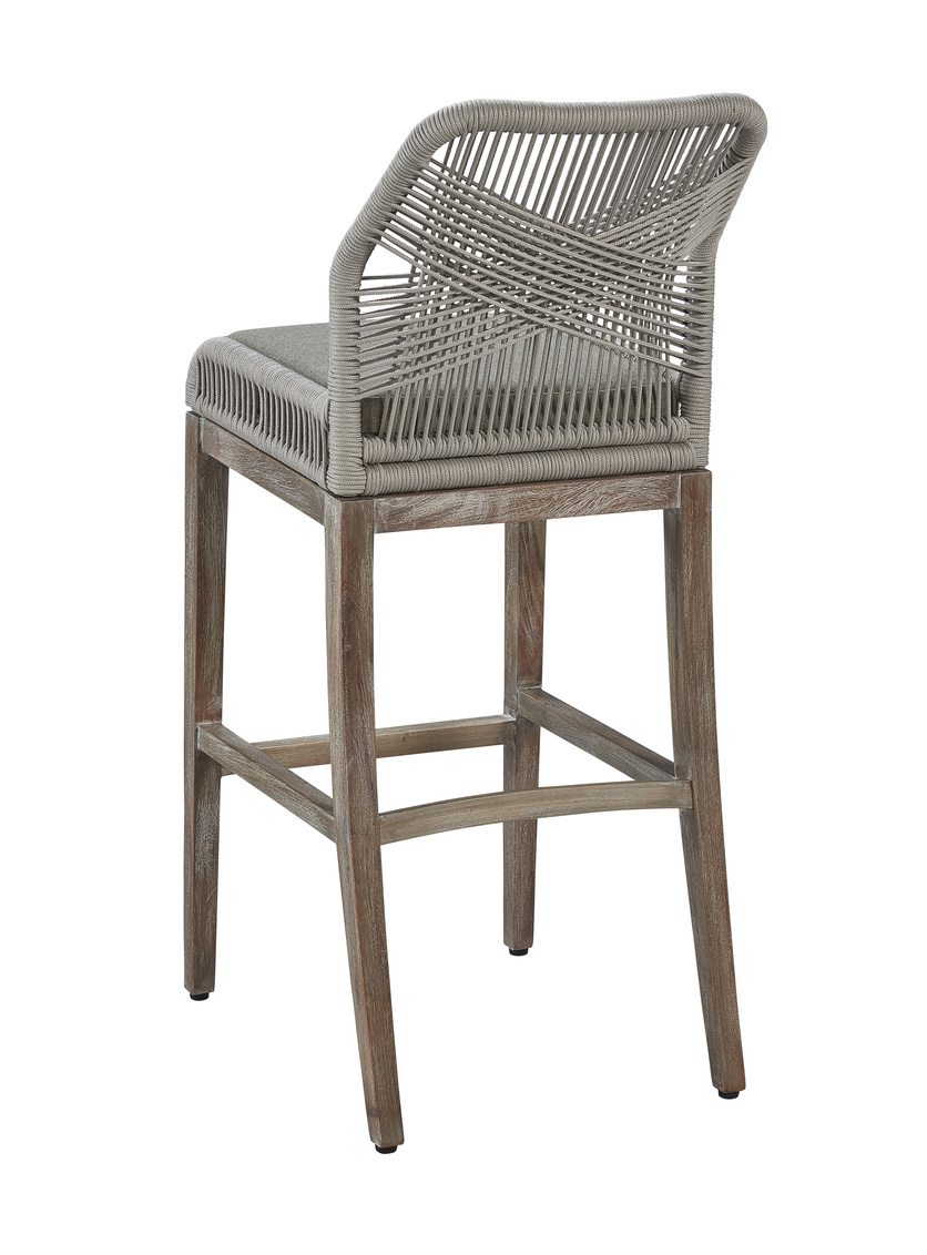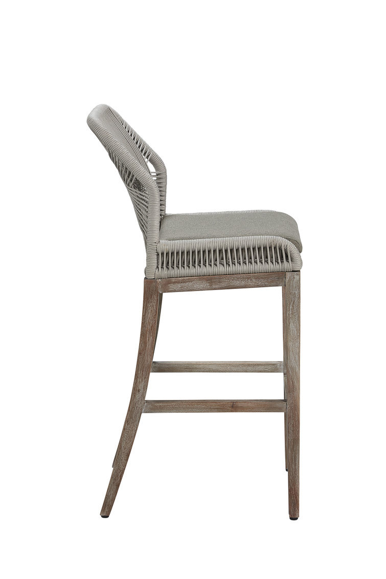 What a unique addition to your kitchen or family room! This comfortable counter stool features an aluminum frame and a light mahogany base. The frame is cunningly wrapped with a synthetic cord to create comfortable seating with a mid-century flair. Available in grey or a light buff tone.