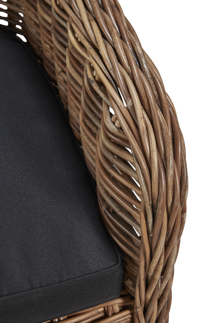 Curves and comfort abound in this well scaled rattan weave chair. The soft curves are highlighted by the flowing braided weave on the arms and back and seating comfort is provided by a removable black boxed cushion.
