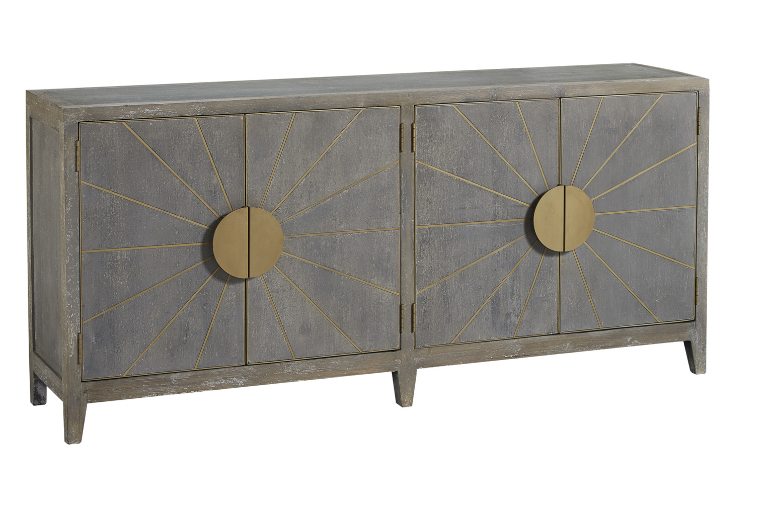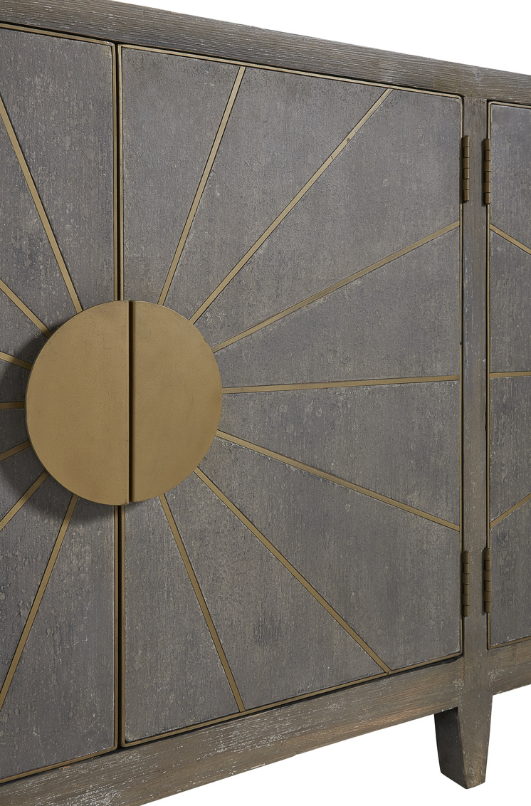 Bring sunshine and great design into your home when you chose this beauty for your stylish interior. The cool gray finish is enhanced by the warm brass inlaid sun rays, stunning circular pulls and framing on the doors. This chest also provides ample practical storage, with a removable shelf behind each pair of doors.