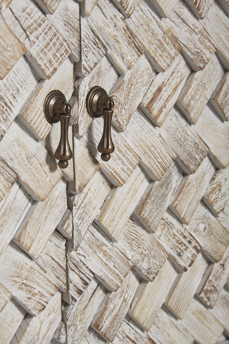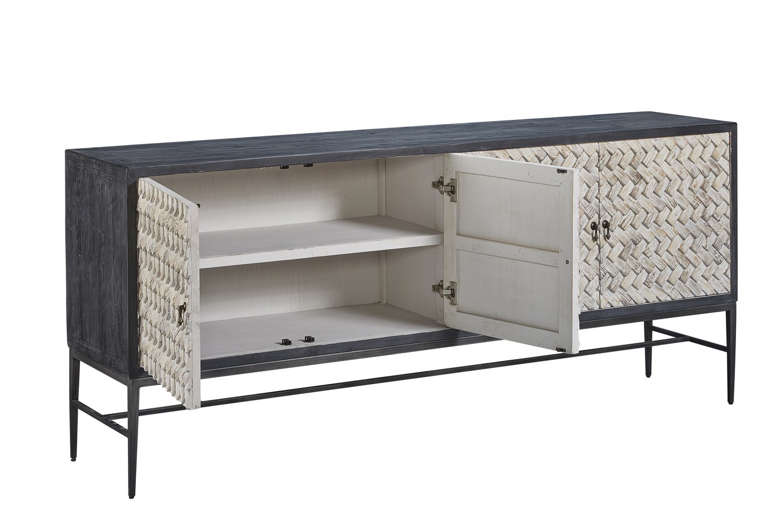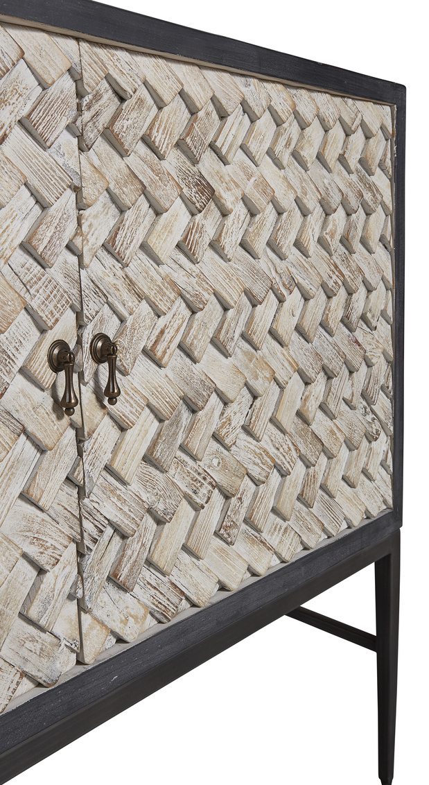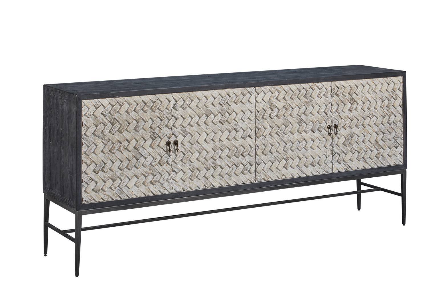 **Final Sale - All Items are sold as is, no returns unless damaged upon receipt. Simply breathtaking, this sleek sideboard features a charcoal frame and metal base, but the high point is the outstanding braided design of textured and whitewashed wood on the doors. The play of light across these fabulous doors is sure to add to your well designed interior, making this a favorite, for certain! A fixed shelf behind each of the soft close doors make this stunner practical as well as a coveted design feature.