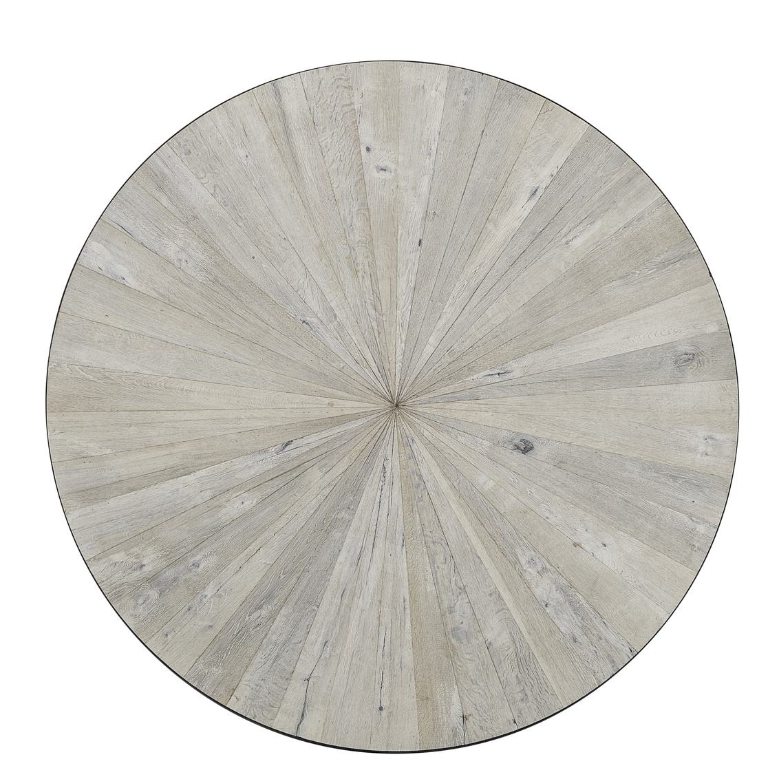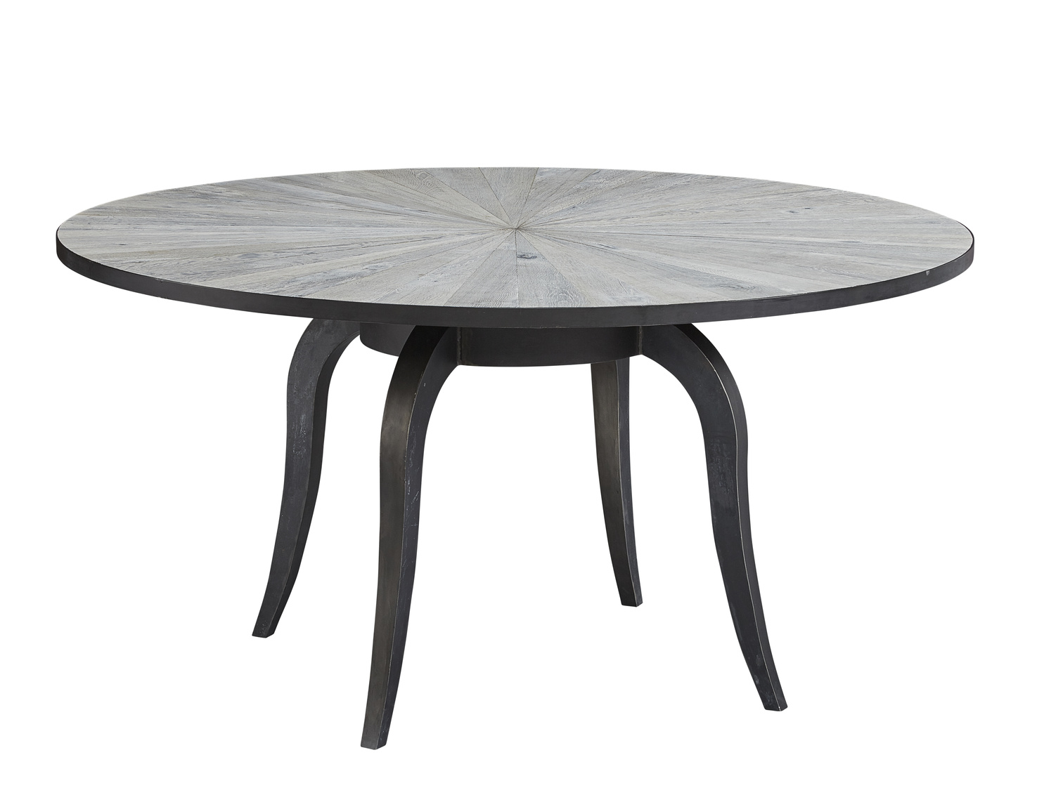 **Final Sale - All Items are sold as is, no returns unless damaged upon receipt. You can play Twenty Questions with your dinner guests while they try to guess what this distinctive table is made of. Reclaimed oak flooring is laid up in an arresting sunburst design, and given a white washed finish which contrasts beautifully with the dark iron banding and base. Well scaled for large gatherings, the table base features slightly splayed iron cabriole legs and pairs beautifully with the matching sideboard 40-173.