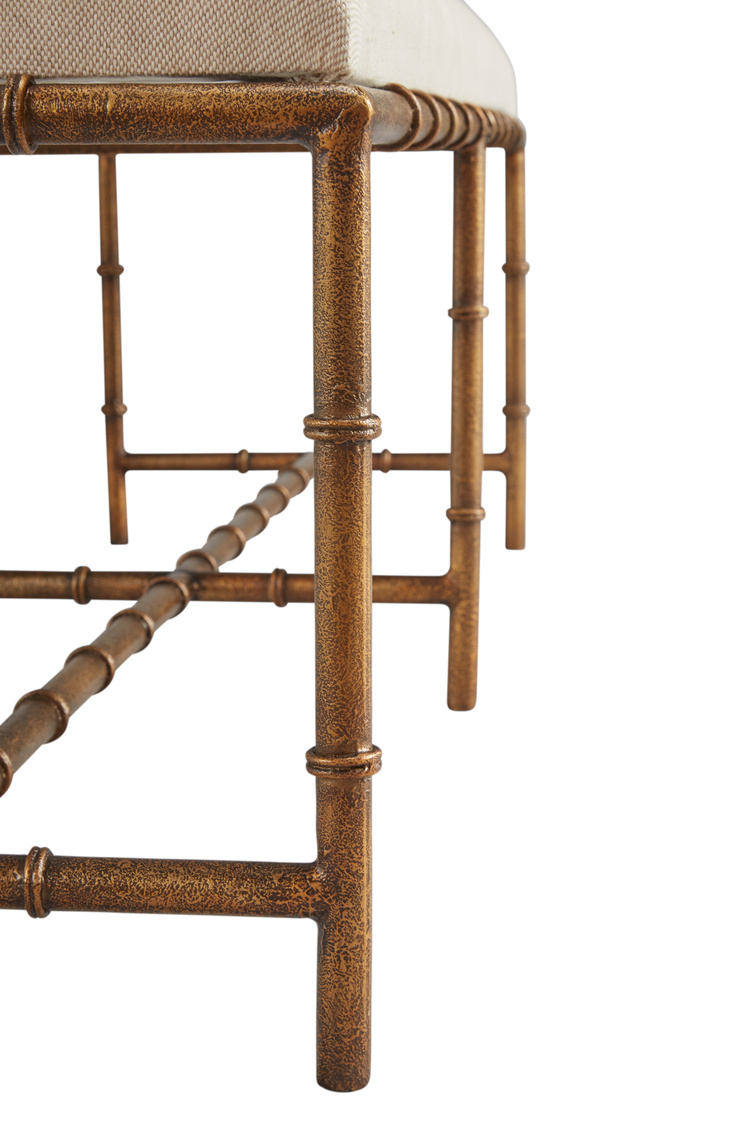 This deceptively light and refined faux bamboo bench is actually crafted of iron, making it sturdy enough for any seating need. The frame is further refined by the hand-application of an antique gold finish, adding an additional element of sophistication. The drop-in seat is a neutral performance linen, but is easily recovered as a DIY project.