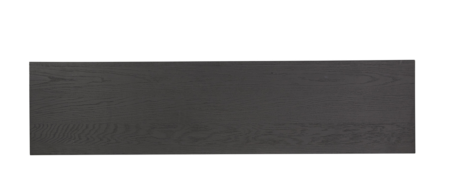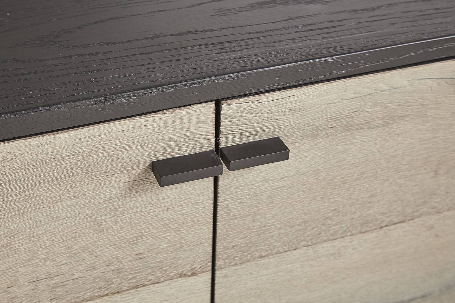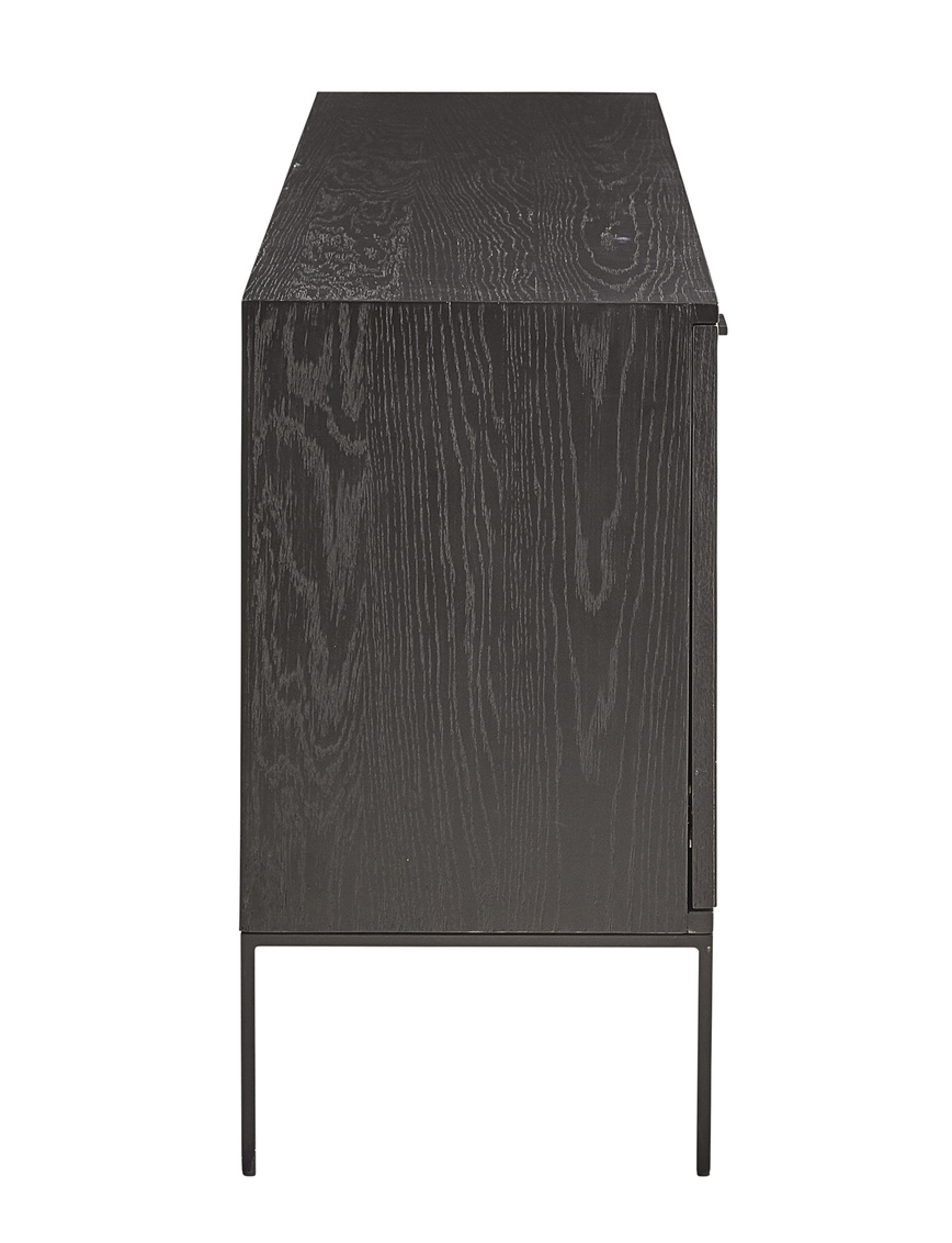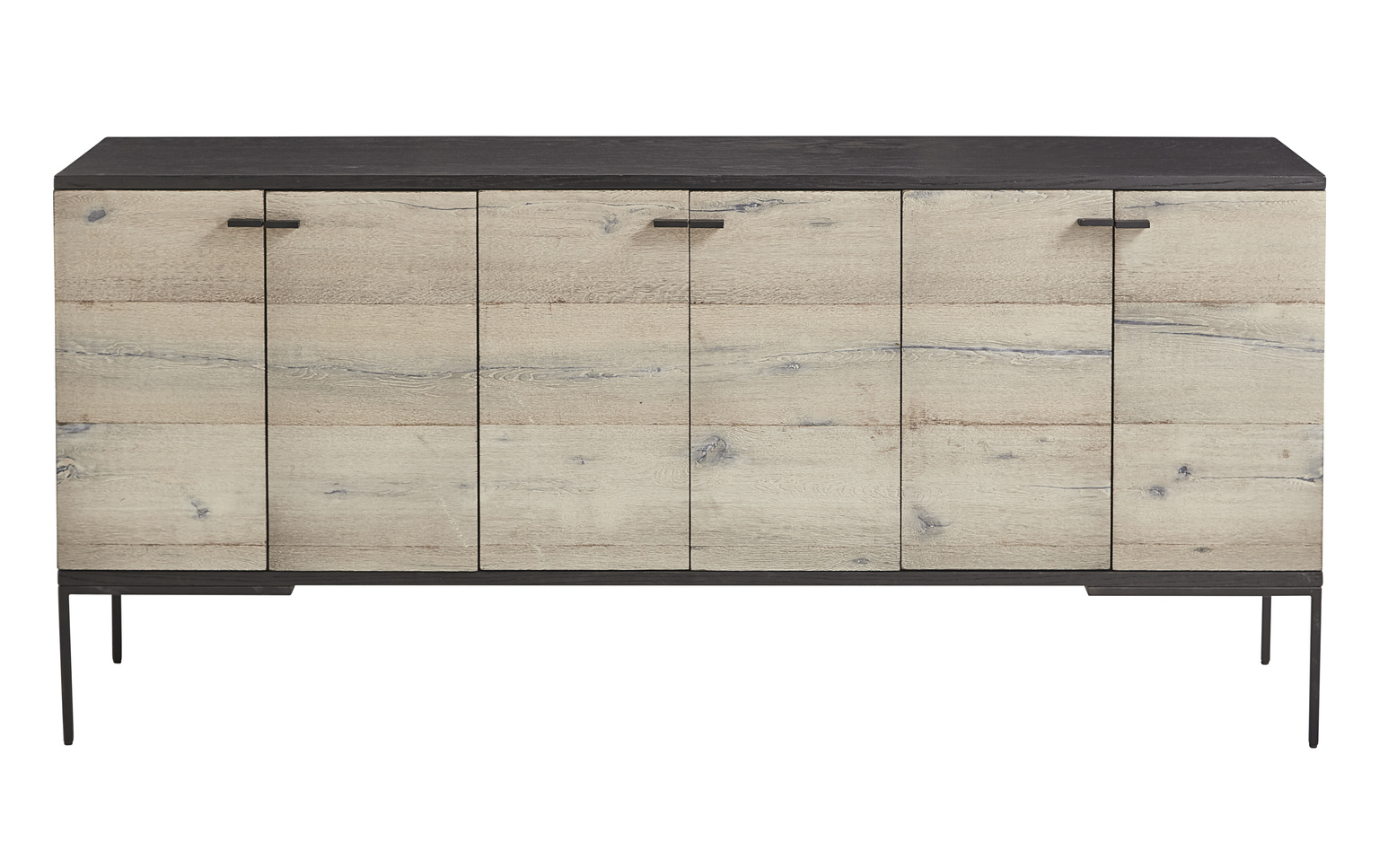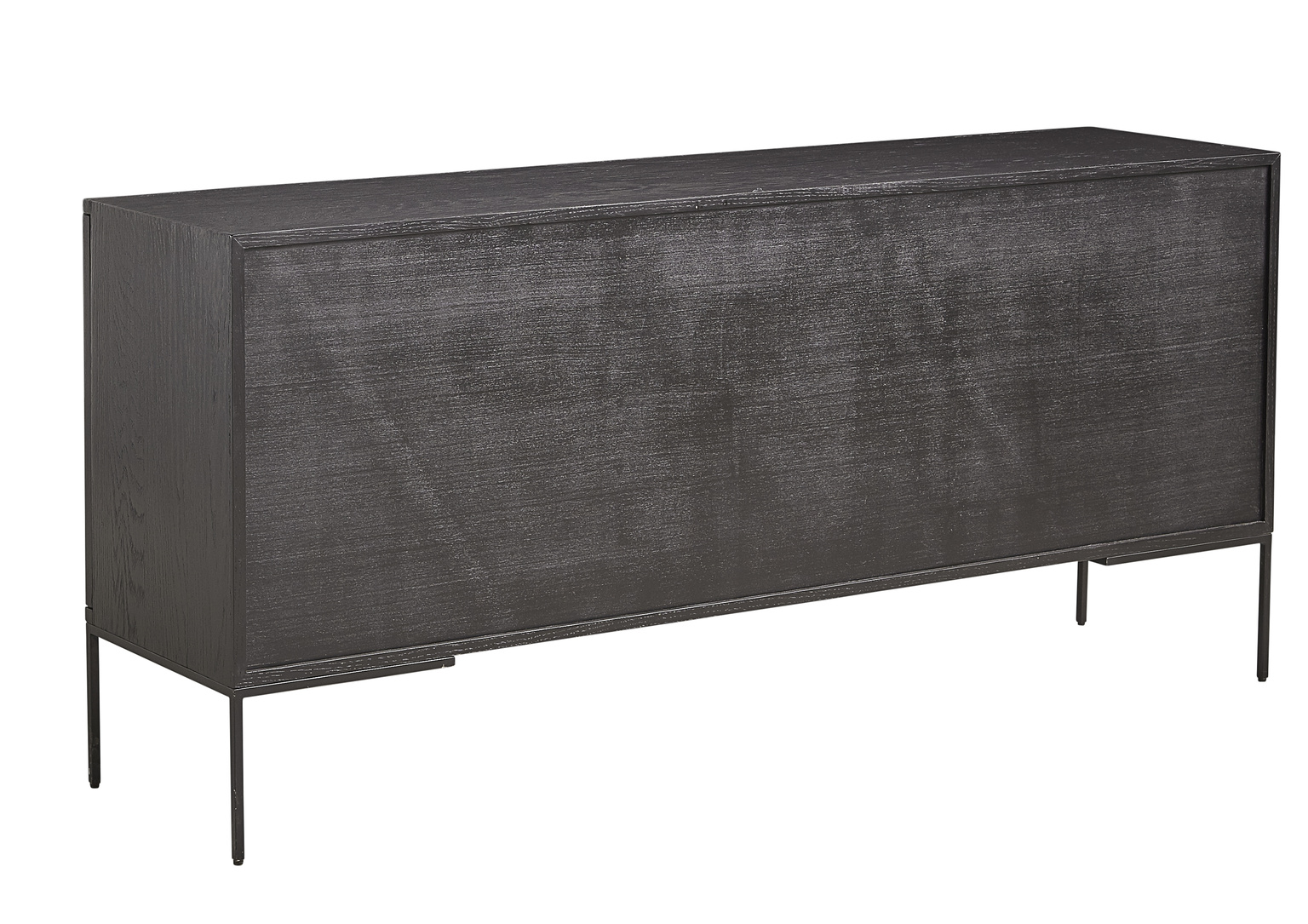 **Final Sale - All Items are sold as is, no returns unless damaged upon receipt. Simple and simply stunning! This oak cabinet is made arresting by contrasting the dark charcoal frame with white washed door fronts, and then adding unexpected iron legs and pulls. The doors open to reveal commodious storage with an adjustable shelf behind each pair. Whether used in a dining room or as the focal point in a great room, this sideboard is certain to steal the show.