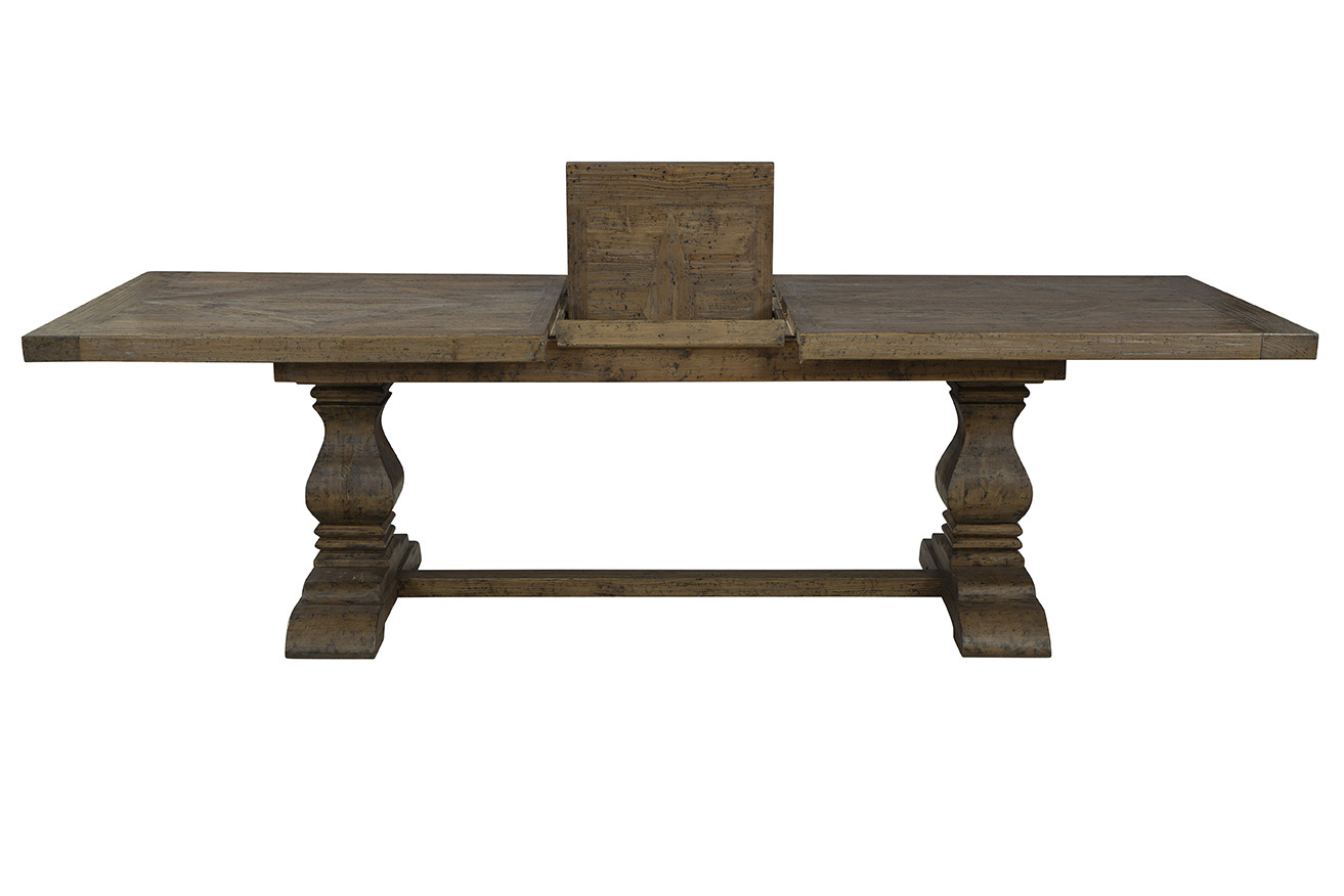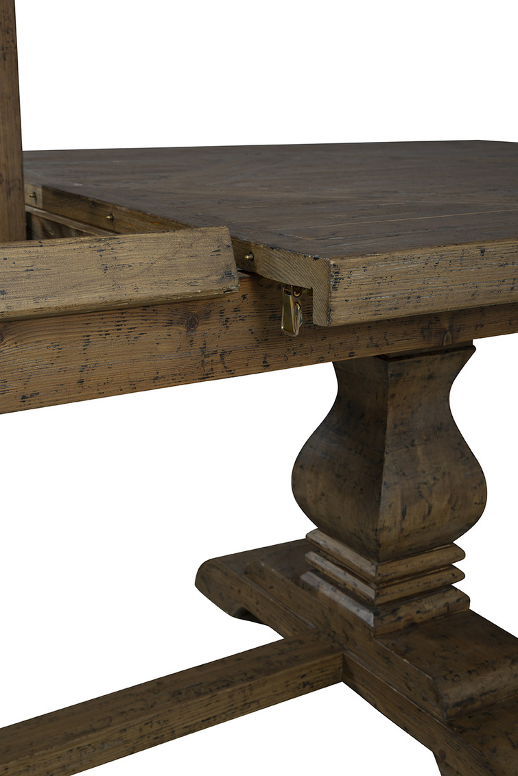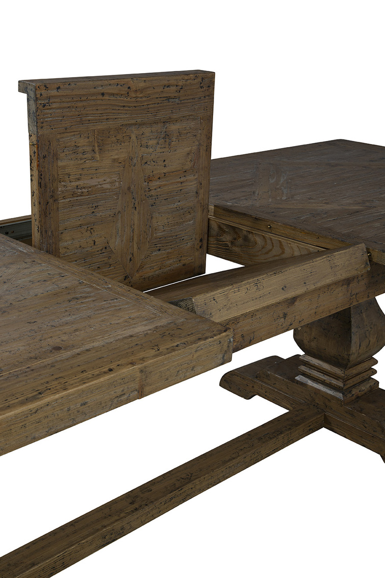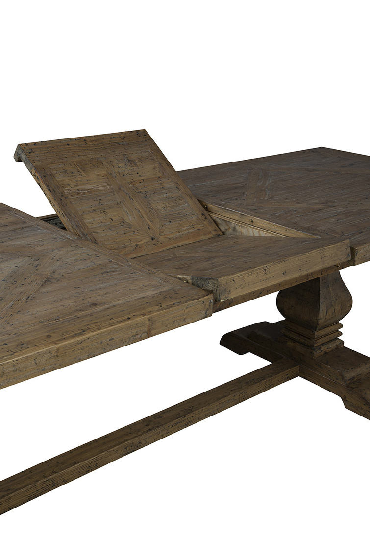 For years you've asked for it, so here it is! Based on our best selling Manor House table, this beauty has been enhanced by the addition of a self storing butterfly leaf, making it perfect for large gatherings. The reclaimed Pine top features striking geometric inlays, and is made family friendly by the application of a clear coat finish.