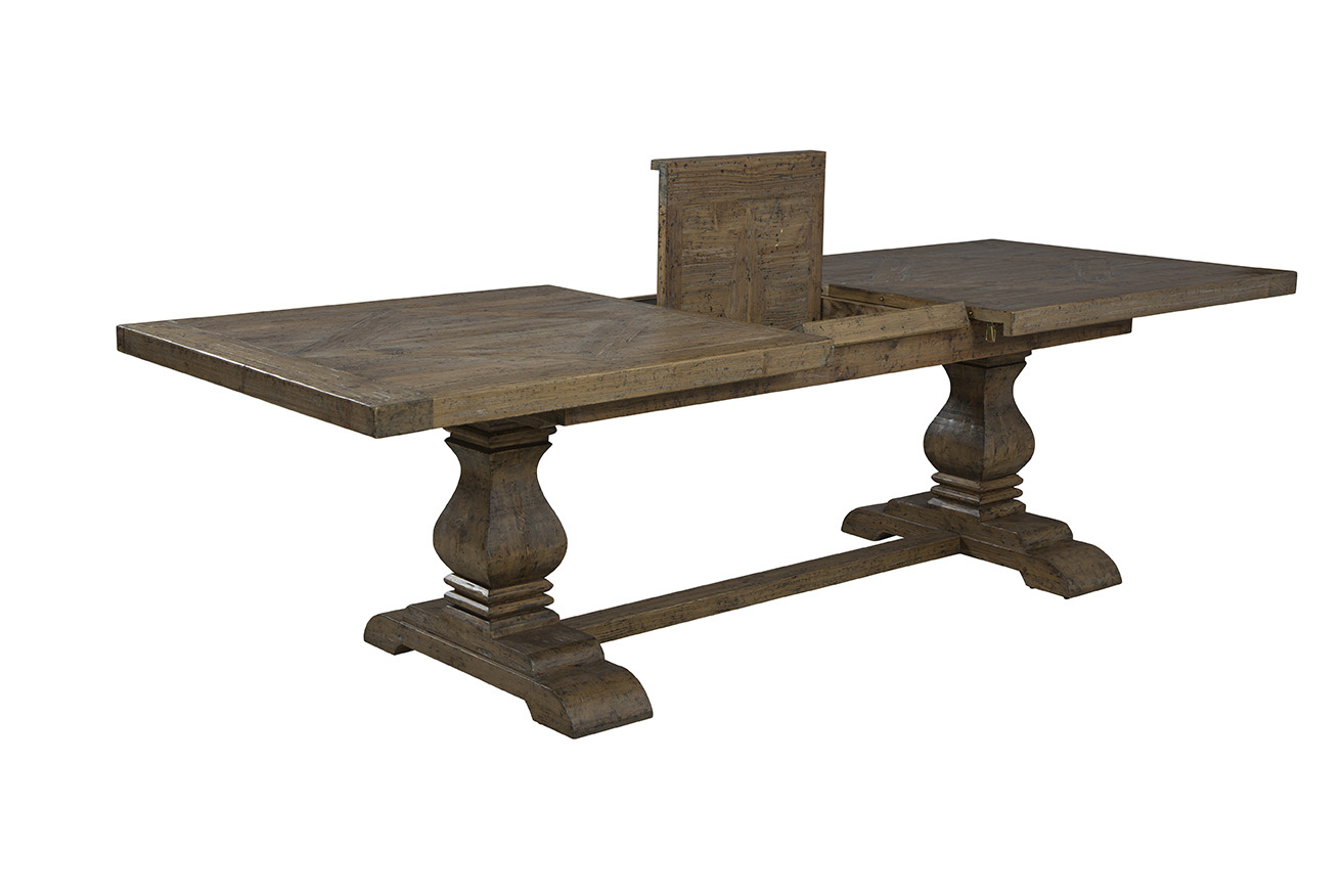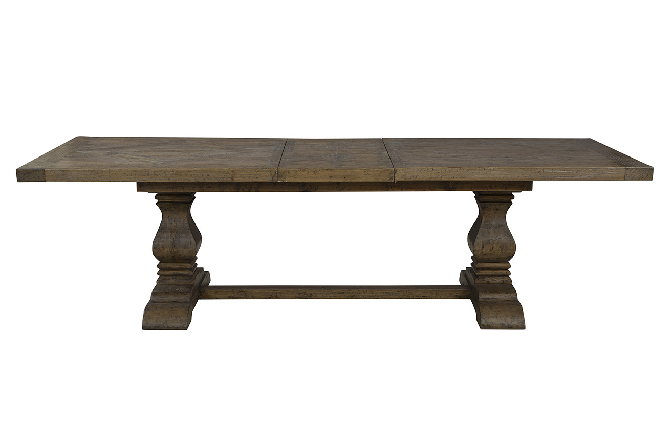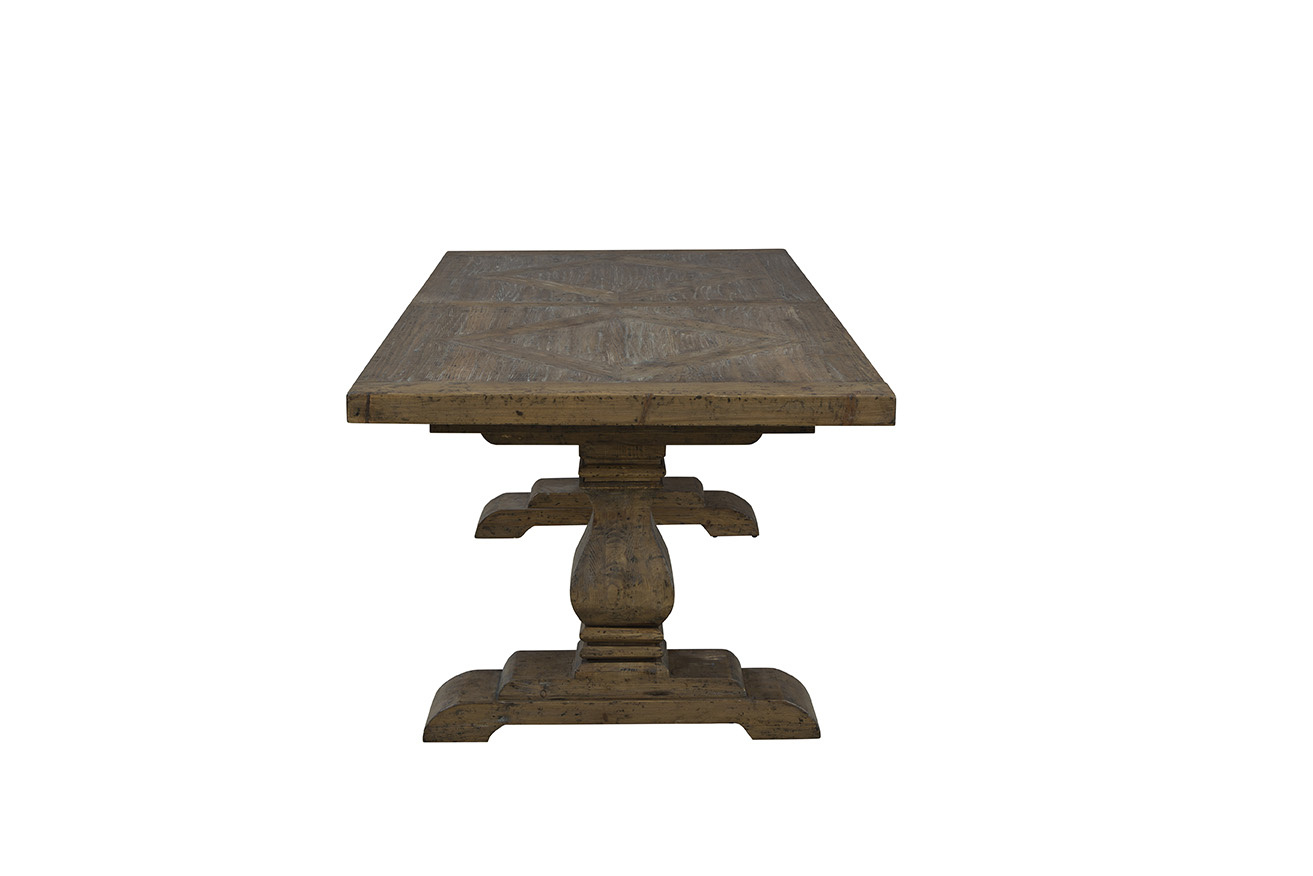 For years you've asked for it, so here it is! Based on our best selling Manor House table, this beauty has been enhanced by the addition of a self storing butterfly leaf, making it perfect for large gatherings. The reclaimed Pine top features striking geometric inlays, and is made family friendly by the application of a clear coat finish.