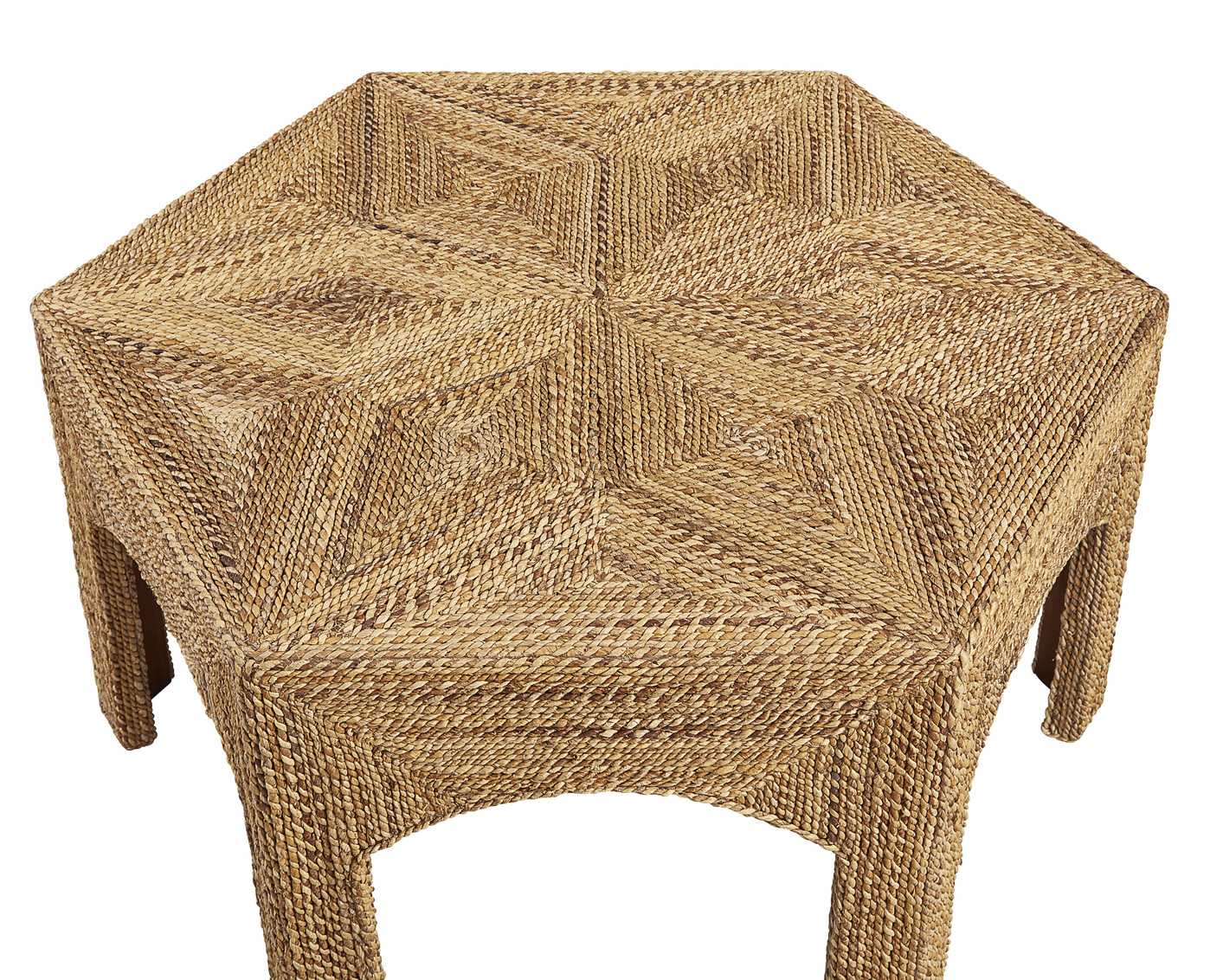 Boho chic and slightly Moroccan in feeling, this unique table is crafted from tightly woven and coiled dried natural banana fronds which is very sturdy. The hexagon design provides inspiration for the graphically arresting star design on the table top. What a unique way to bring texture into your design!