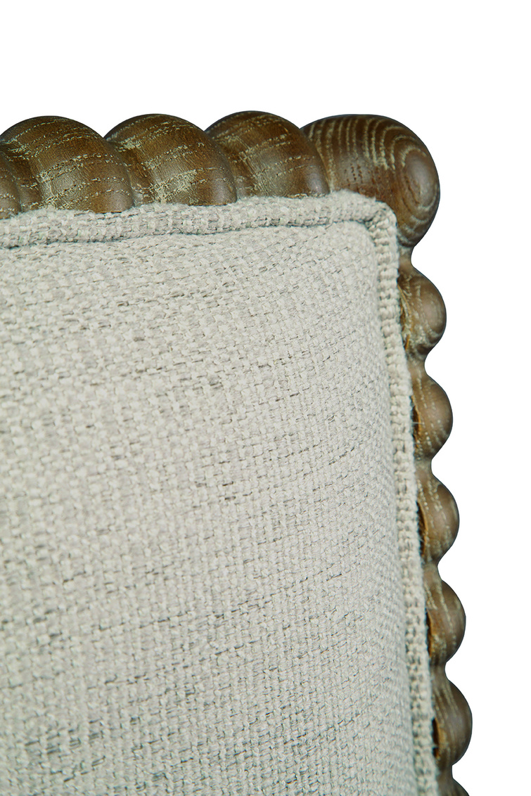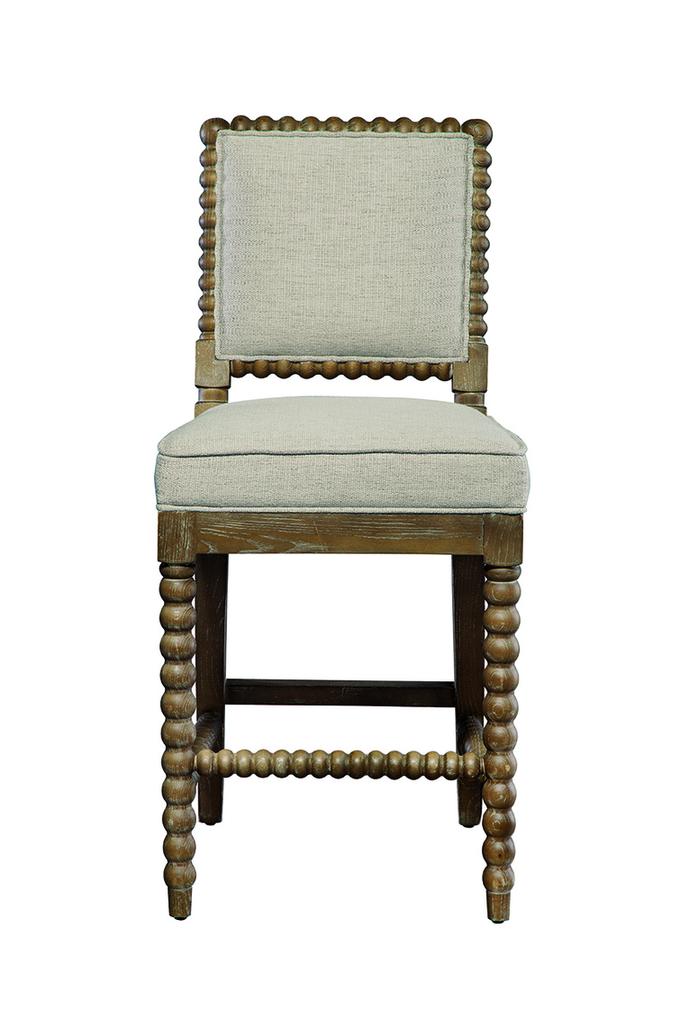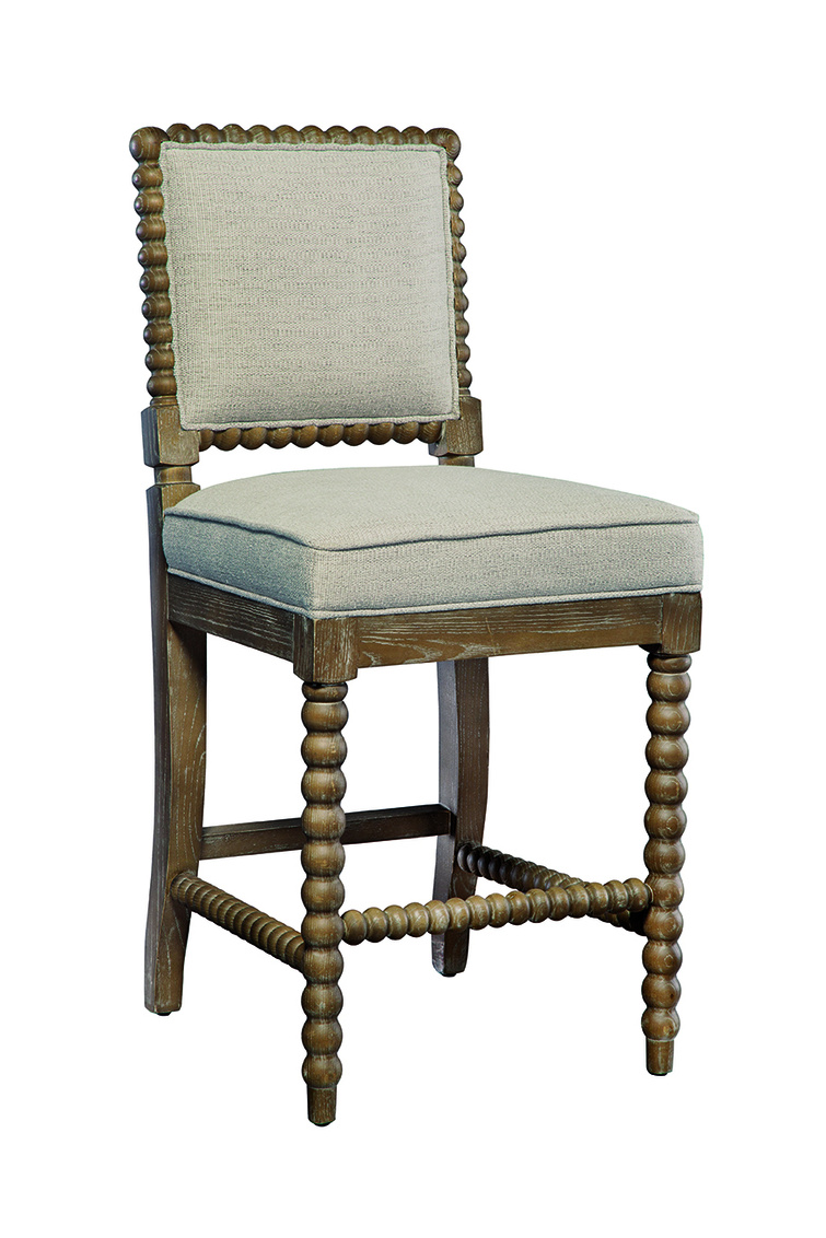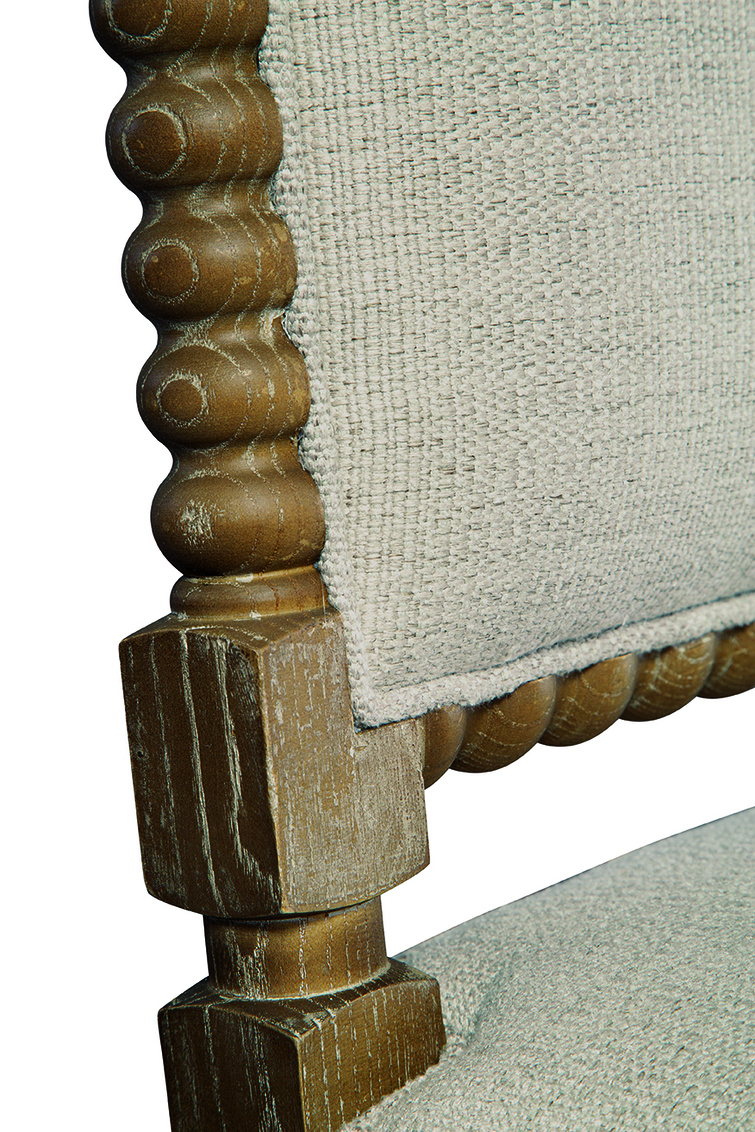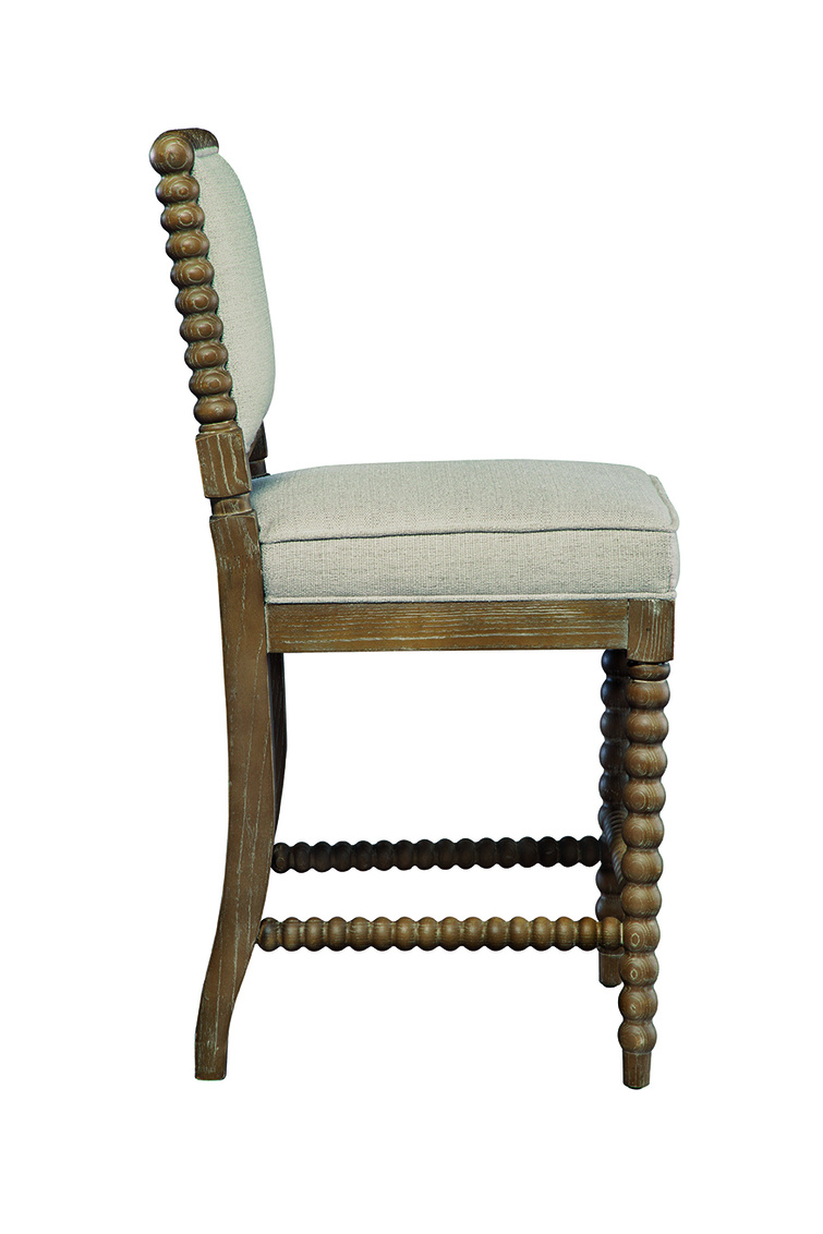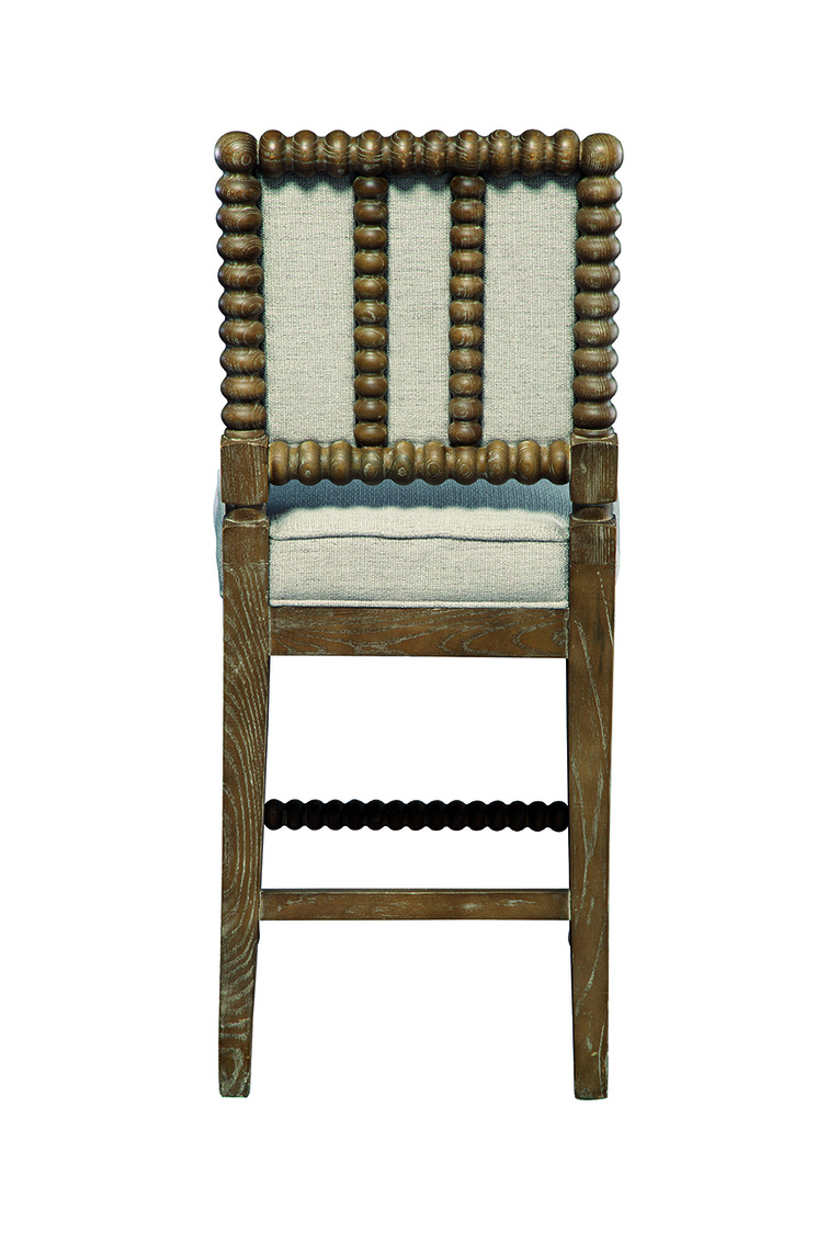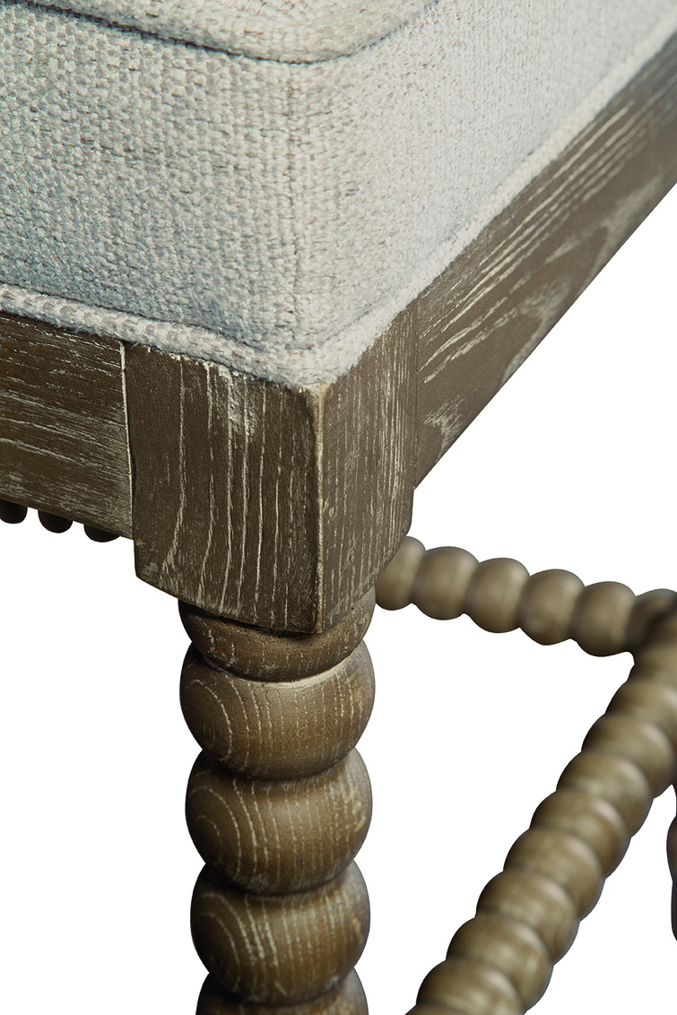 Turn, turn, turn. Whimsical bobbin legs, stretcher and back make this a charming and unique stool which will bring a sense of fun and sophistication to your home. The neutral wood tone and performance upholstery will enhance today's more neutral palettes.