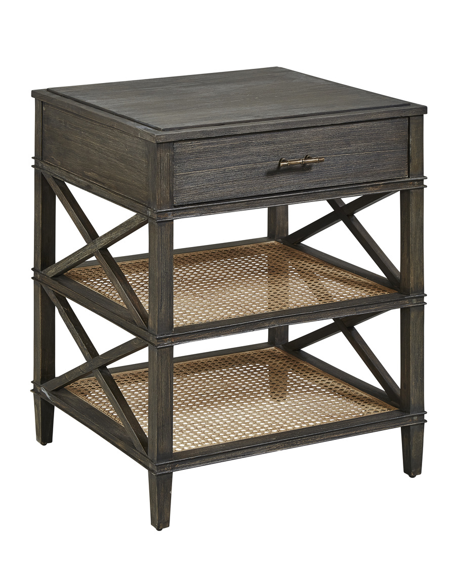Timeless neo-classic design is reinterpreted with simplified sleek lines and a charcoal finish which contrasts beautifully with the natural rattan tones of the hand woven caning. The caned shelves provide ample storage for tablets and old school reading material, and the drawer is perfect for cables, remotes, and your reading glasses!