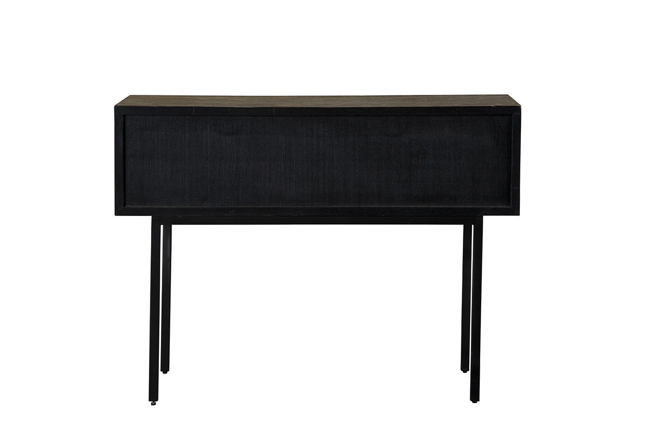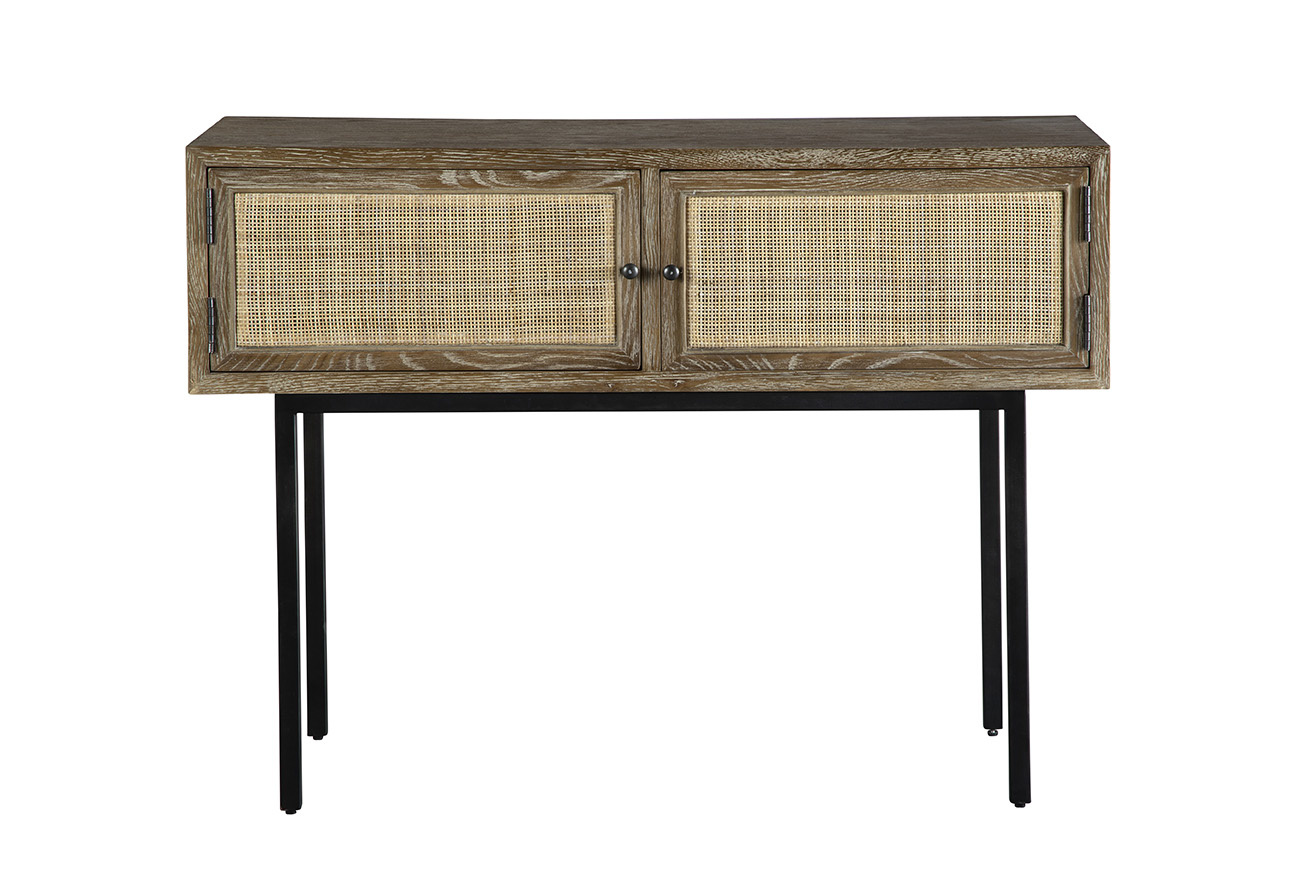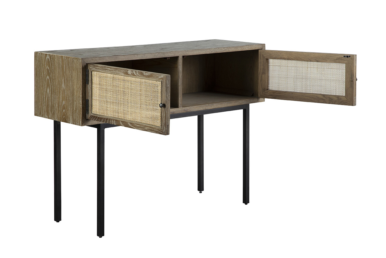 **Final Sale - All Items are sold as is, no returns unless damaged upon receipt. A stunning trifecta of elements, this exquisite console combines solid oak, finely woven caning, and strong iron all in one petite console. Petite, yes, but packing a strong design punch which is certain to enhance any space. Behind the doors, there is divided space which is perfect for storing necessary items in an orderly fashion. You know, chargers on one side, and more chargers on the other!