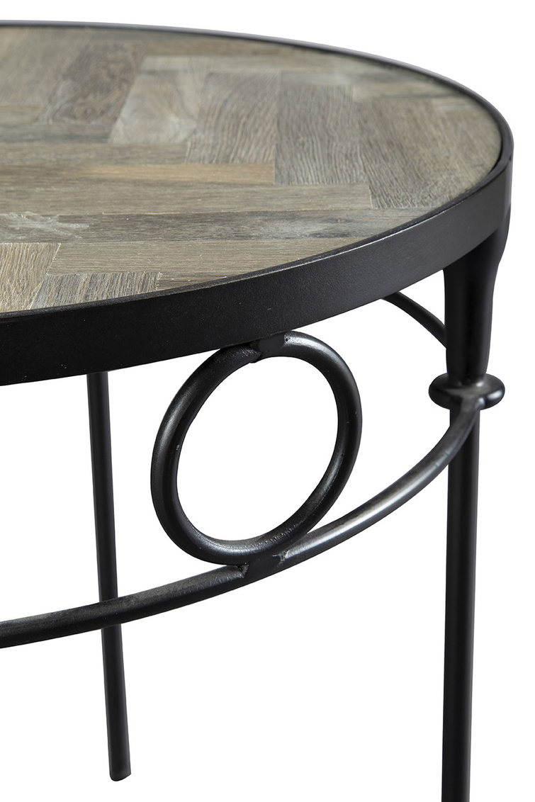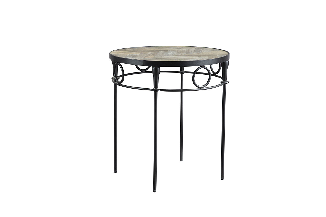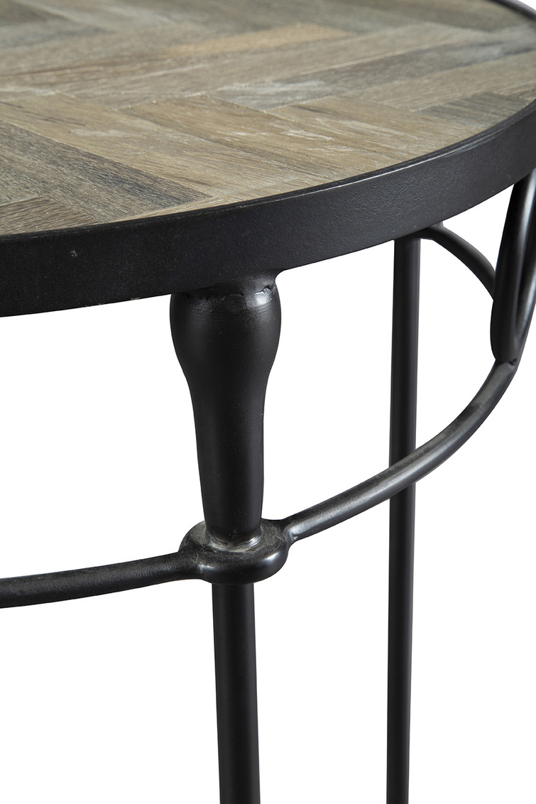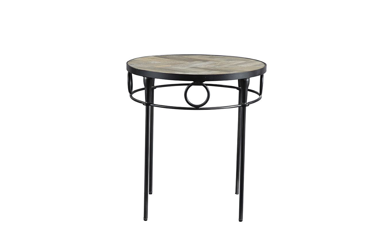 **Final Sale - All Items are sold as is, no returns unless damaged upon receipt. Simplified to the most basic of geometric shapes, this elegant accent table contrasts a sleek black metal base with a solid oak top with a gray wash. The unusual herringbone design of the top provides visual and textural interest to this beauty.