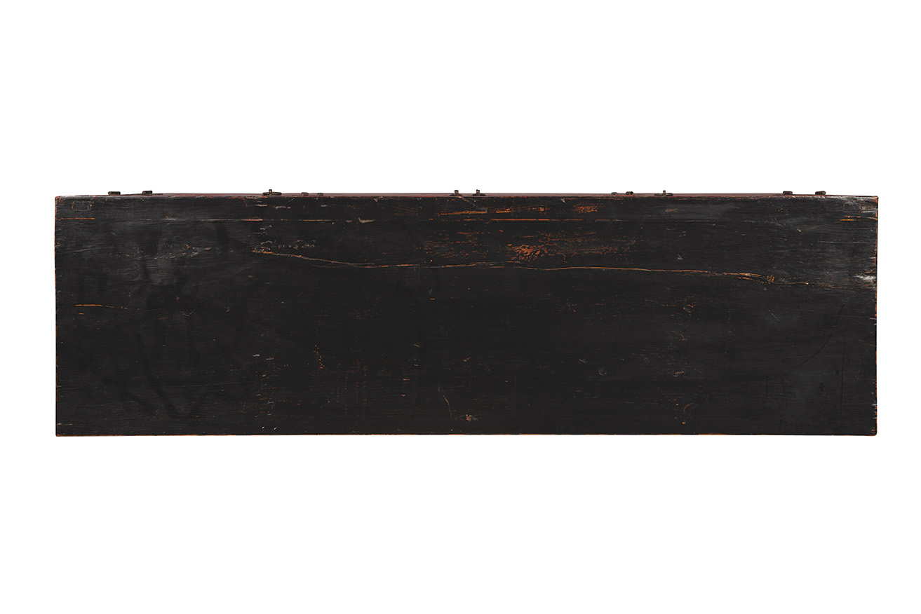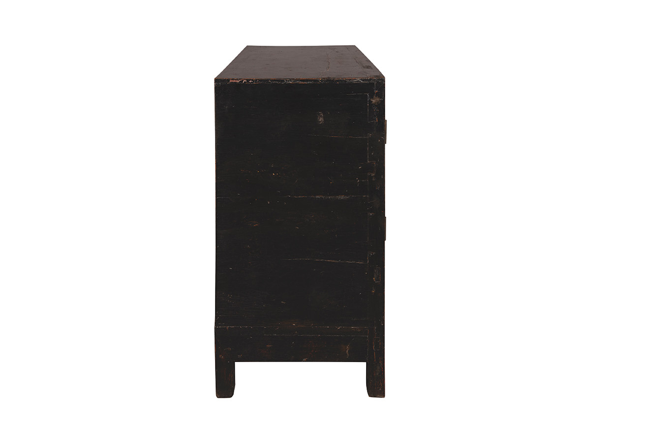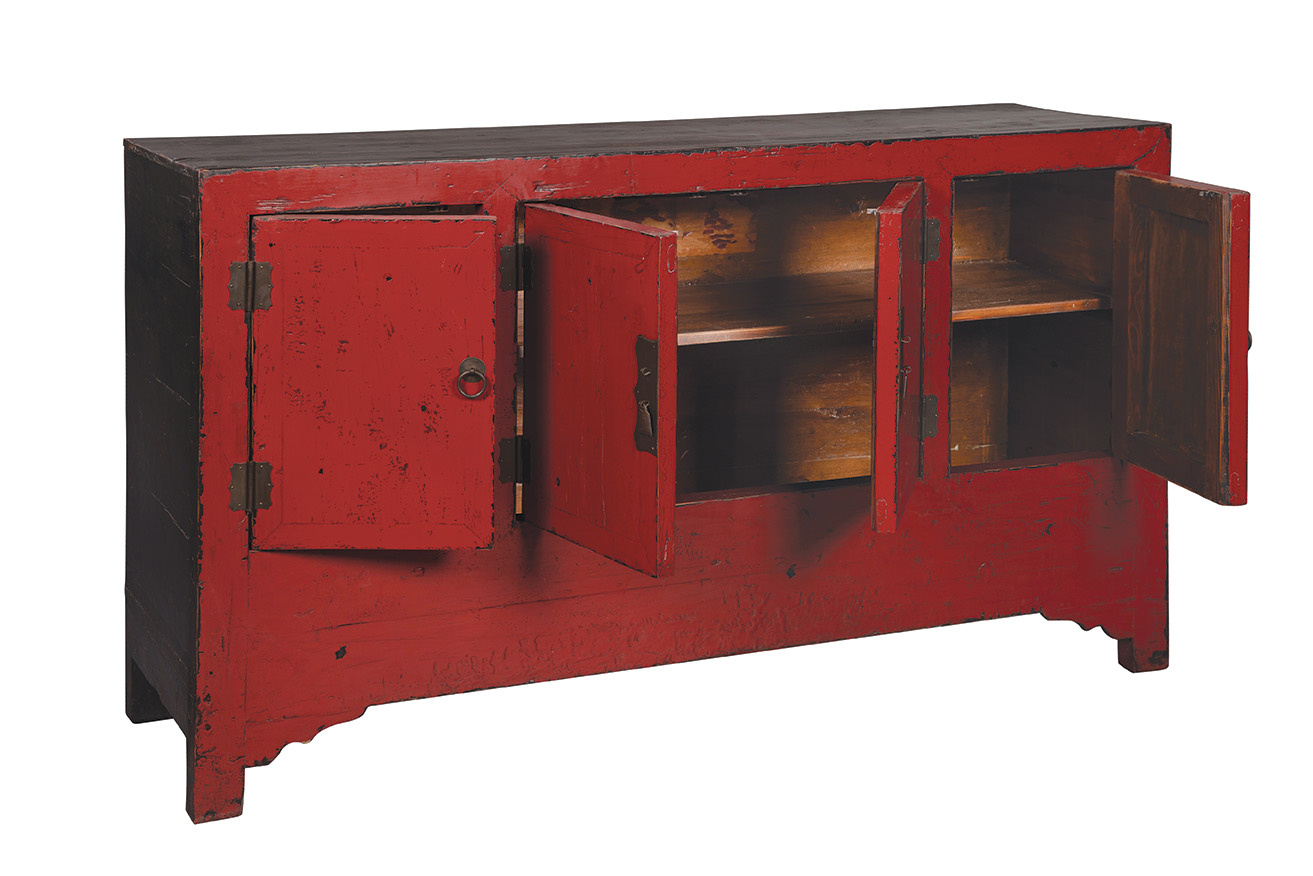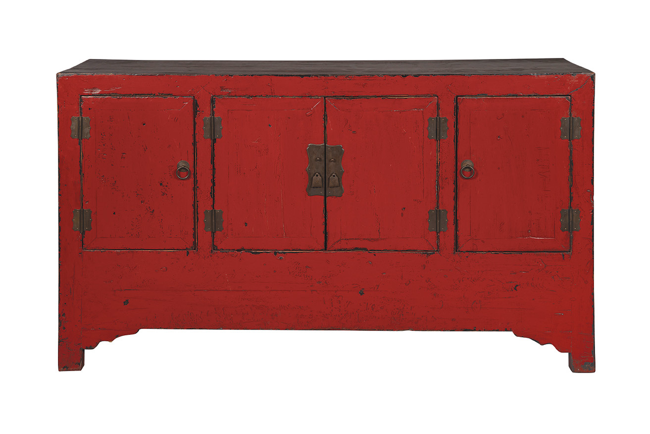 Providing ample storage, and more than ample visual impact, this handsome sideboard is one of our "found pieces" which will vary slightly in size and design. However, each will provide a stunning accent piece wherever it is placed. Painted Chinese red on the face, with contrasting ebony sides and top, this sideboard is dressed to impress.
