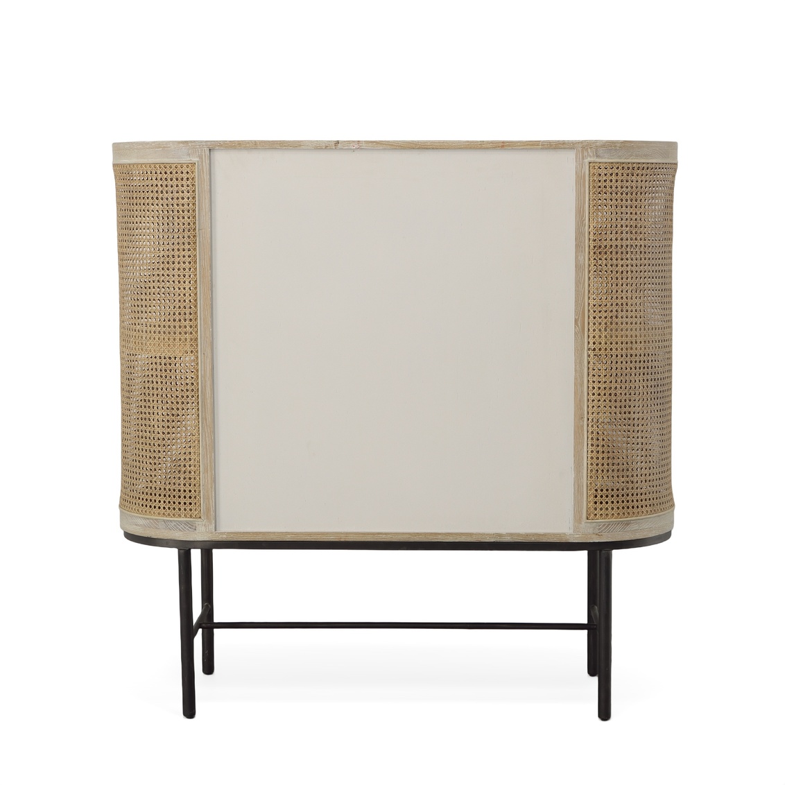 This unique bar cabinet is constructed of oak with airy woven caning on the sides and doors. To further define the light and airy nature, the cabinet rests upon slender metal legs. There is a shelf within the cabinet, and it is all ready to house your favorite libations and glassware.