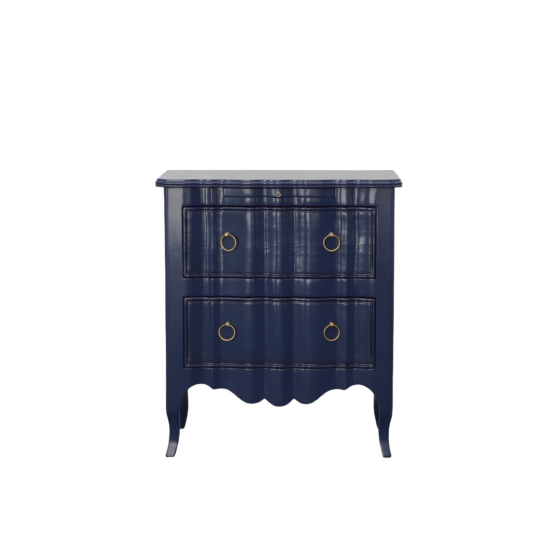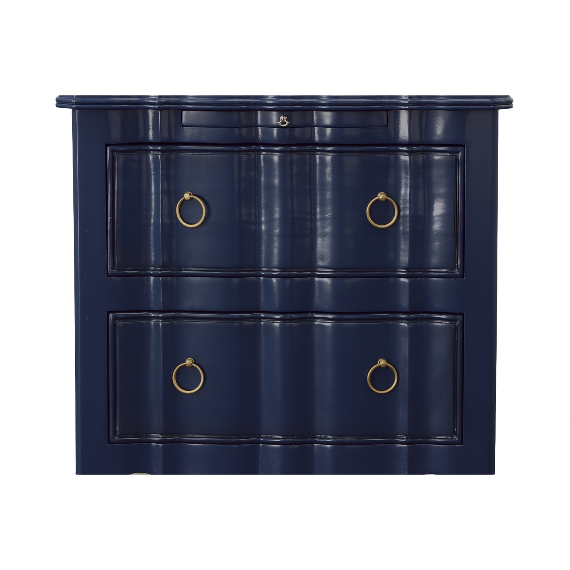 Perfectly scaled to be used in pairs, this handsome mahogany chest is finished with a lustrous satin blue paint which is highlighted by the use of solid brass ring pulls. Not just a pretty addition to any room, this chest provides easy access to items stored within its 2 side hung full extension drawers. An additional touch of practicality, a pull out writing shelf, is provided by this curvy beauty. What a stunning addition to your home!
