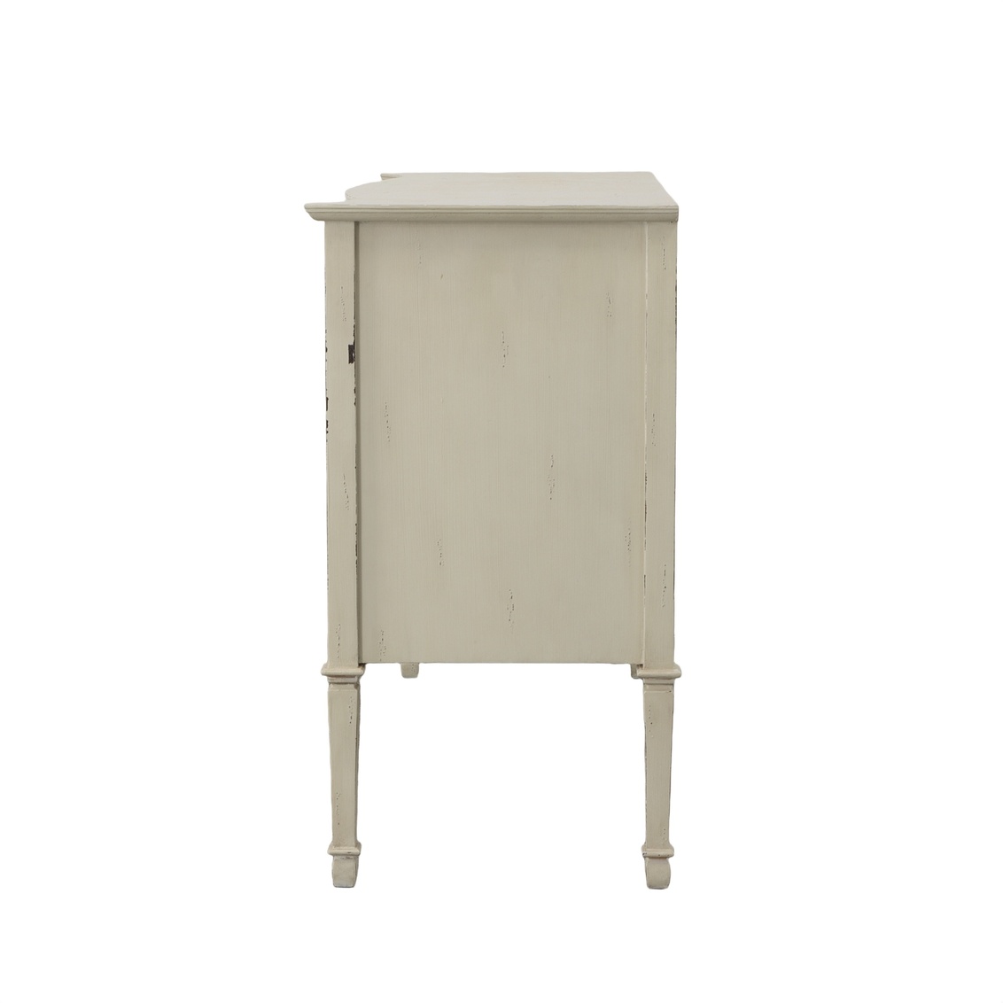 Subtly curved to add even more visual charm, this commodious sideboard features a practical adjustable shelf behind its uniquely routed doors. The solid mahogany frame is enlivened by the application of a lightly distressed cream finish. The quiet beauty of this sideboard is emphasized by the distinctive brass pulls.