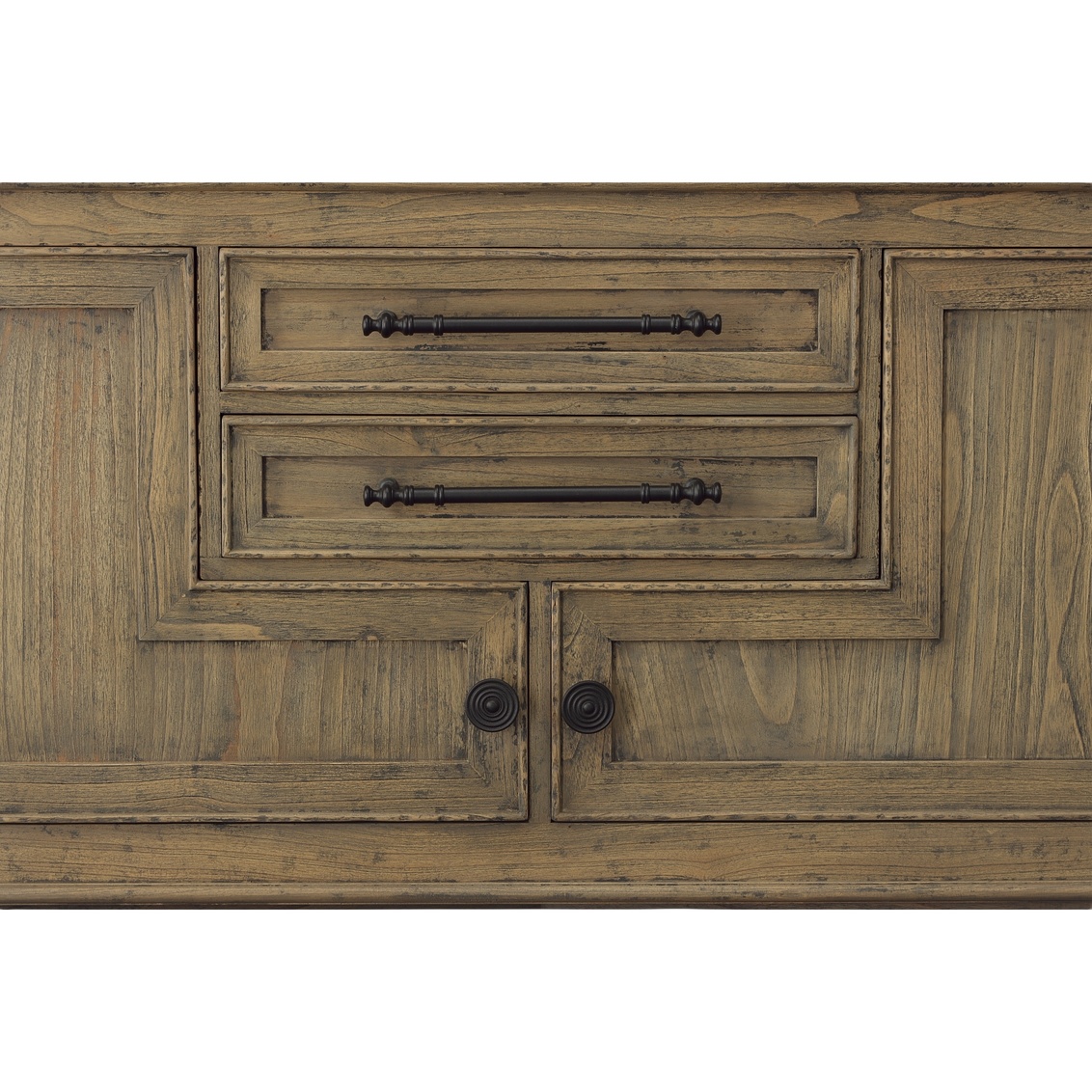 With an unusual, yet handsome, arrangement of doors and drawers, this arresting oak cabinet is certain to become the star of your home. The slightly quirky doors and drawers are further emphasized by the use of beading on their framed panel faces. Even more personality is provided by the distinctive angled base and contrasting hardware.