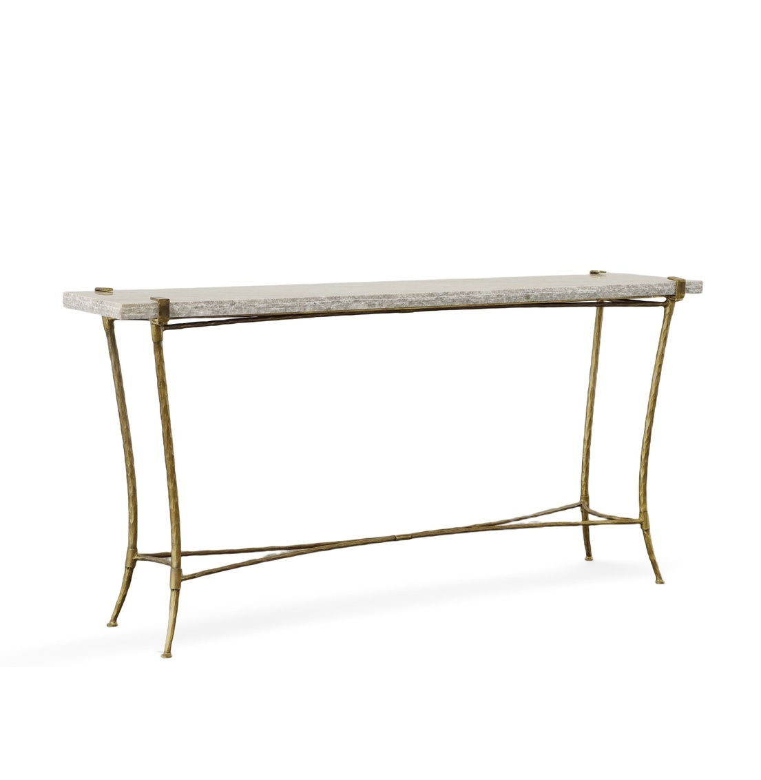 What a stunner! This handsome series of tables features a softly patterned rough edge disc of cream and gray granite supported by a golden hammered metal base. This series adds a lovely gleam to today’s neutral palettes.