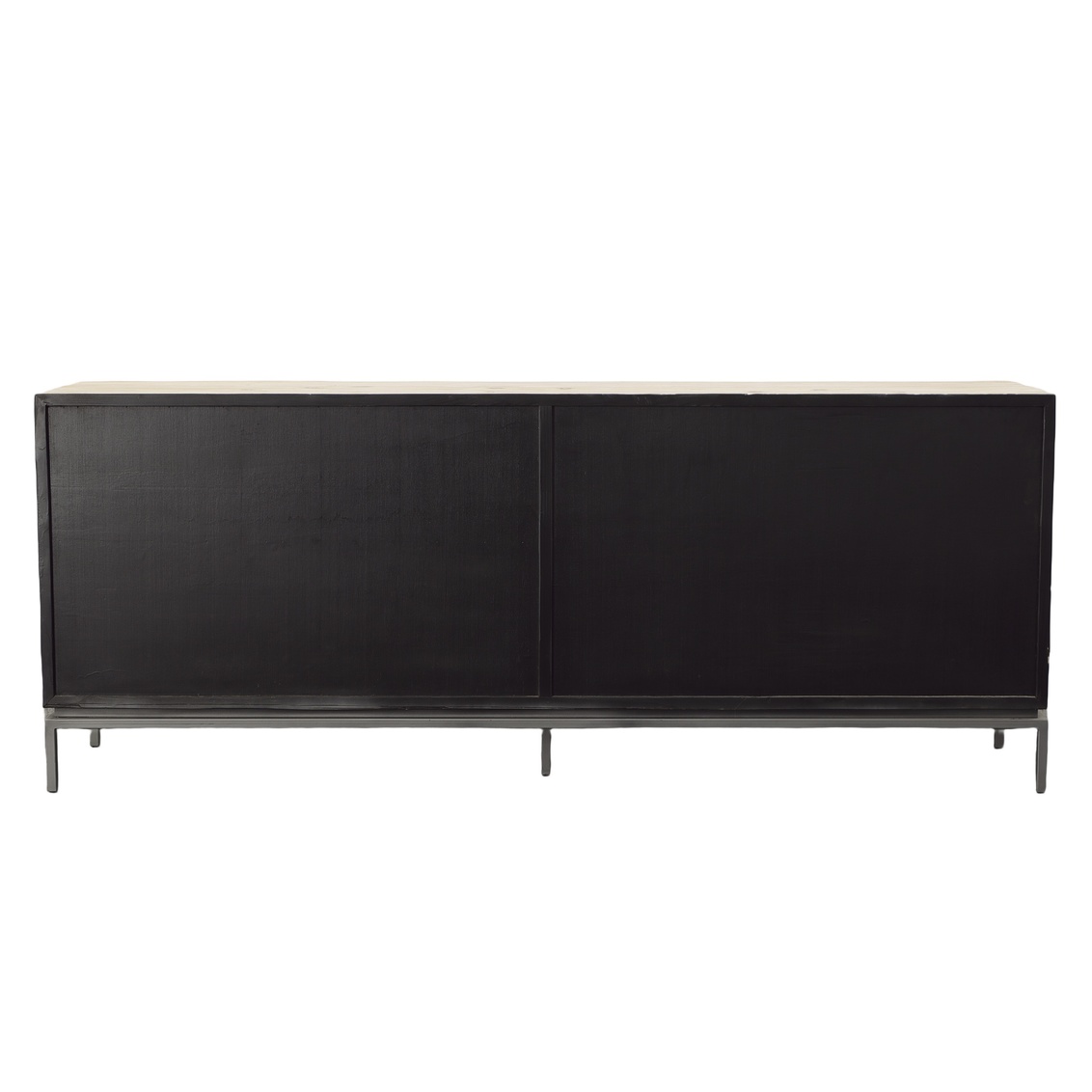 This white washed pine sideboard features a unique shingle application on the door fronts. The cabinet is raised on a metal base, while the doors also feature metal vertical pulls. Organized storage is supplied within the spacious cabinet.