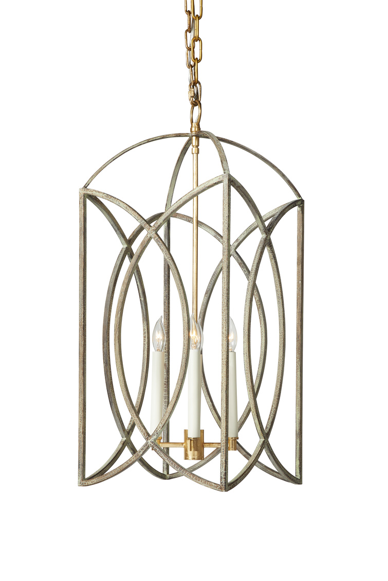 Geometrically intriguing, this lovely verdigris and brushed gold small scaled chandelier is a lovely fixture alone in a powder room,... Show more