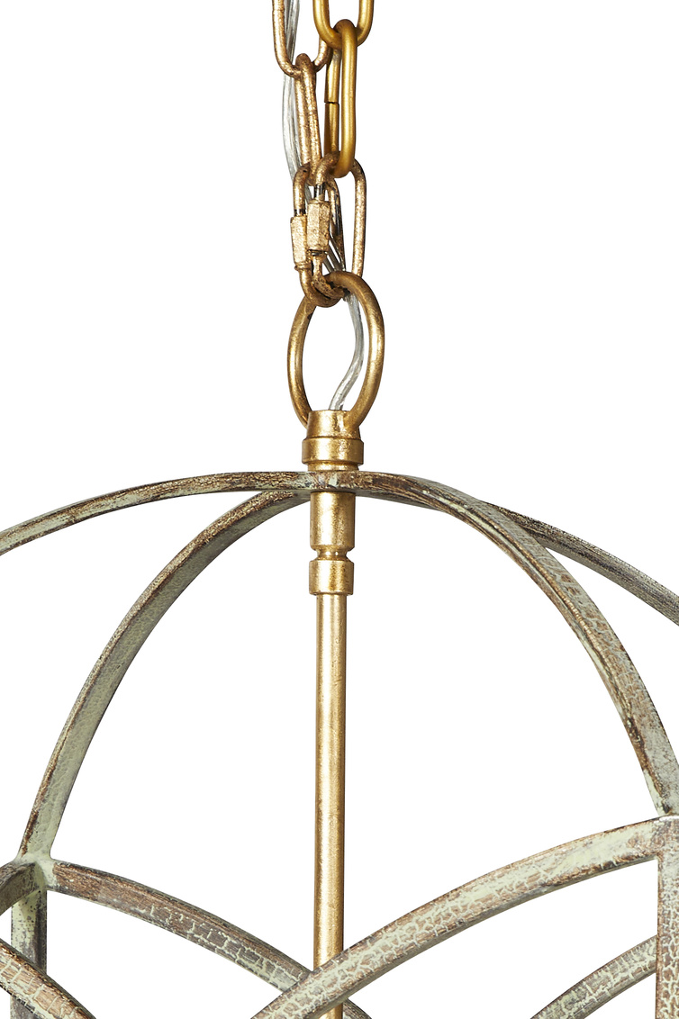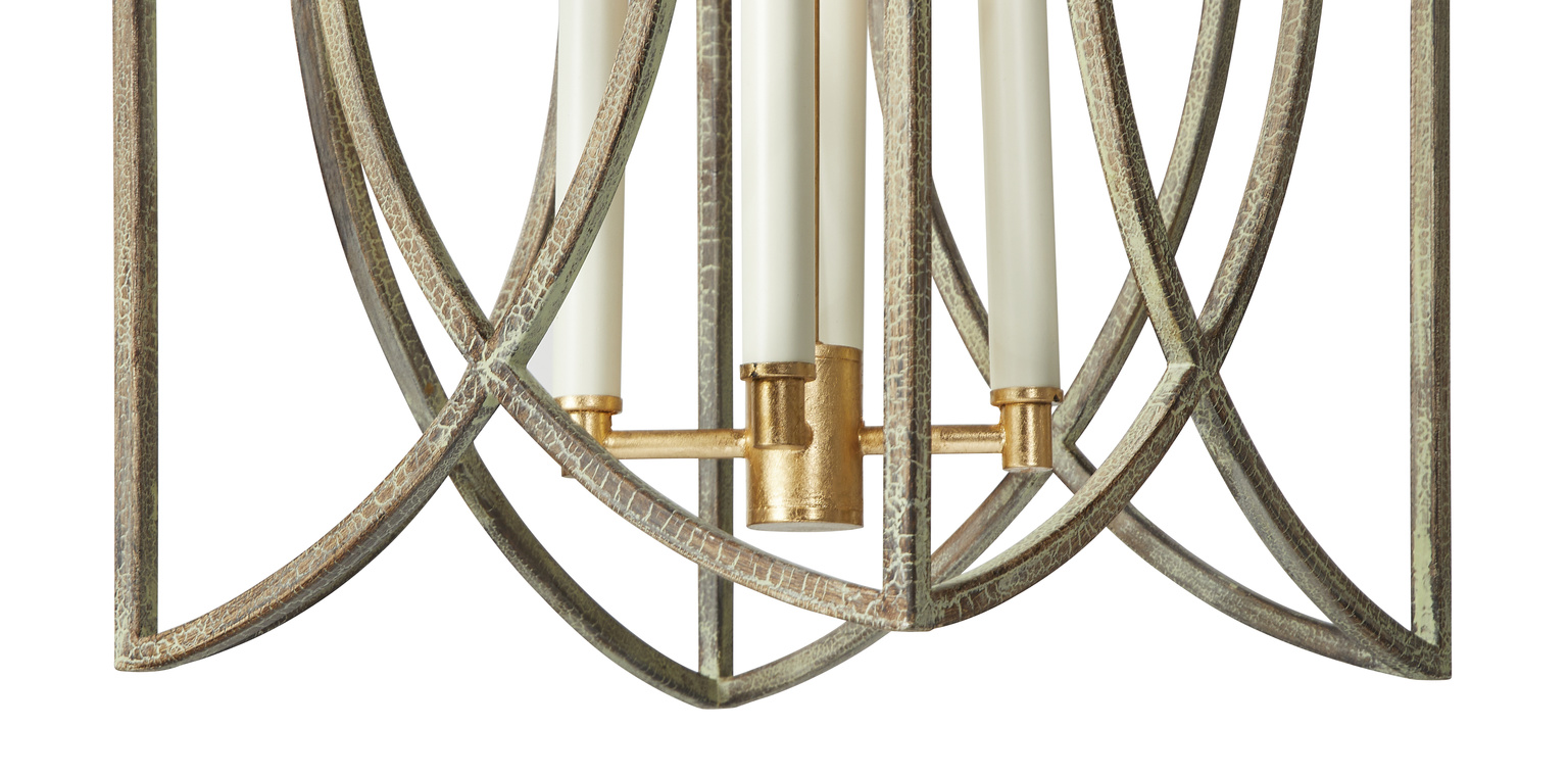 Geometrically intriguing, this lovely verdigris and brushed gold small scaled chandelier is a lovely fixture alone in a powder room, or in multiples over a dining table or island bar. With four arms, this petite beauty is sure to shine where ever it is placed.