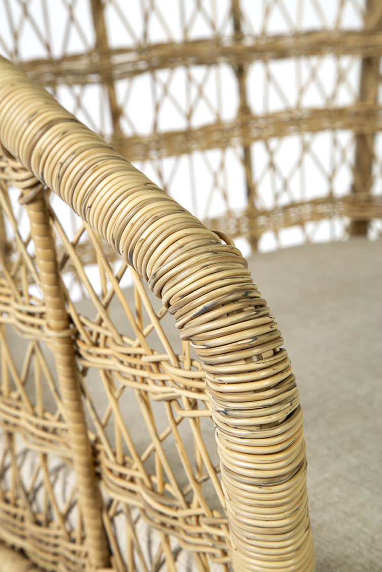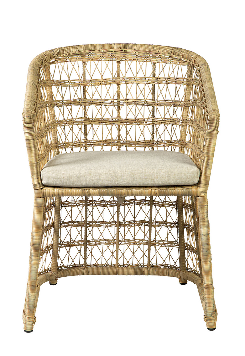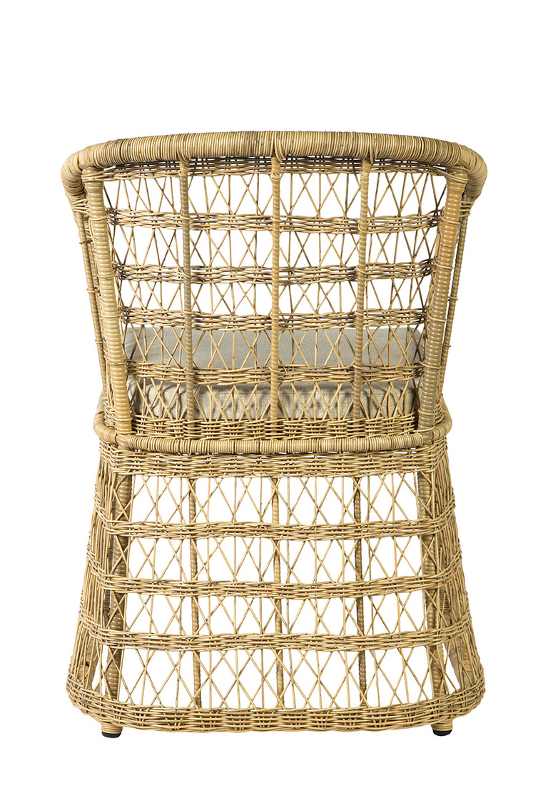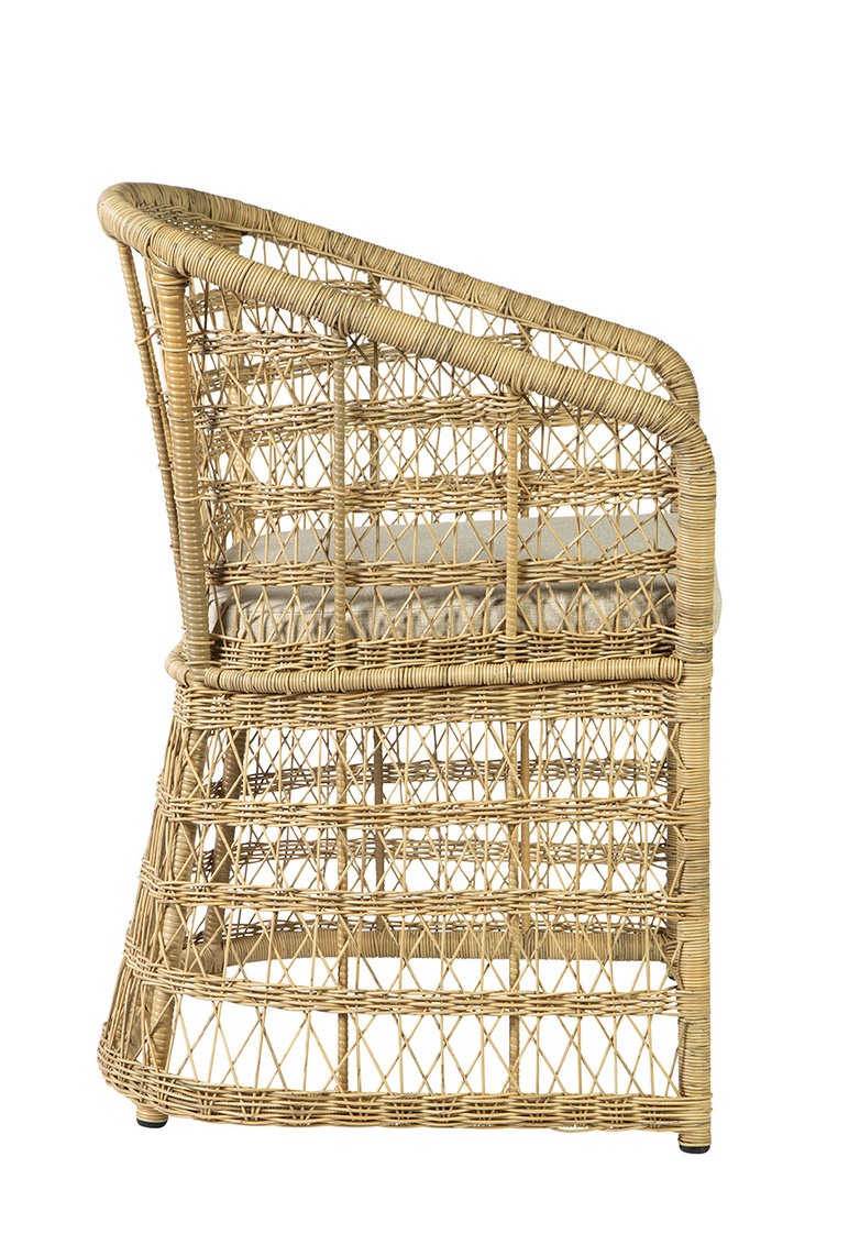 This chair features an aluminum frame with a meticulously woven synthetic weave that not only adds a touch of elegance but also ensures resilience and the ease of cleaning – making maintenance a breeze. Suitable for indoors or out.