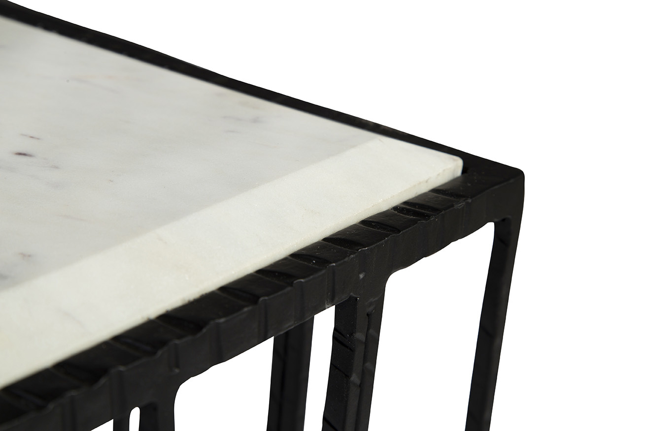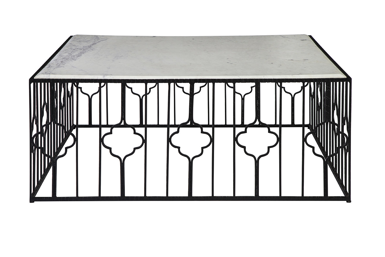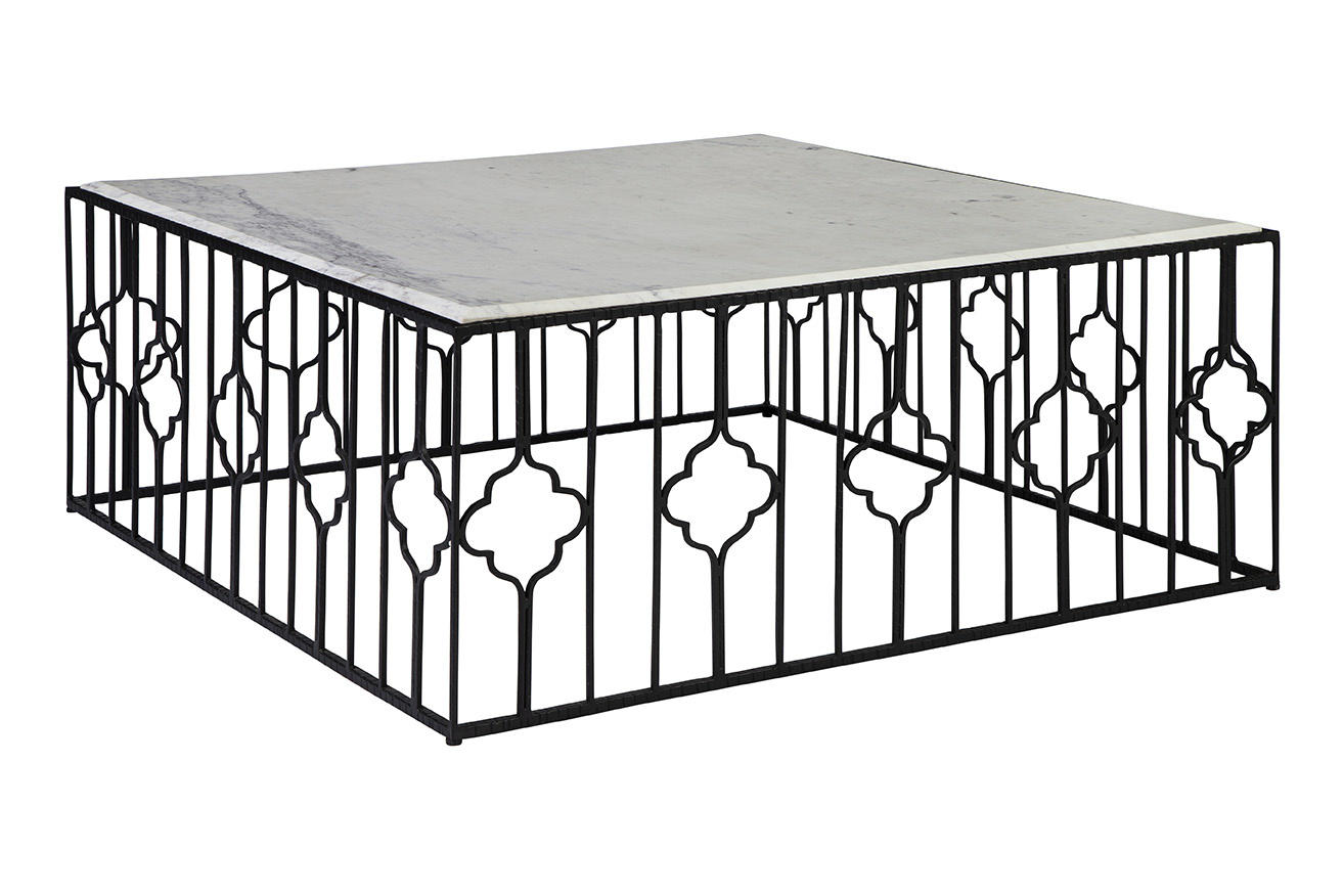 **Final Sale - All Items are sold as is, no returns unless damaged upon receipt. The table’s iron base stands as a testament to meticulous craft smanship, featuring intricate detailing and a decorative design that exudes elegance from every angle. Paired with a drop-in marble top boasting beveled edges, this cocktail table is a harmonious blend of strength, style, and sophistication.