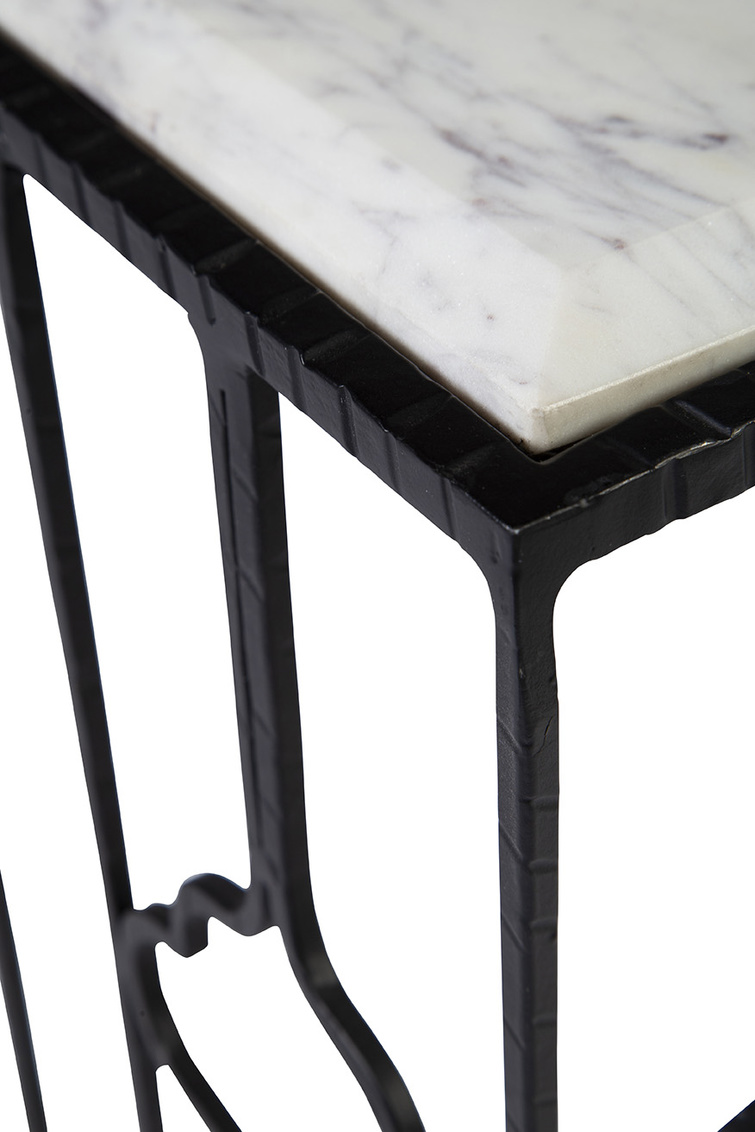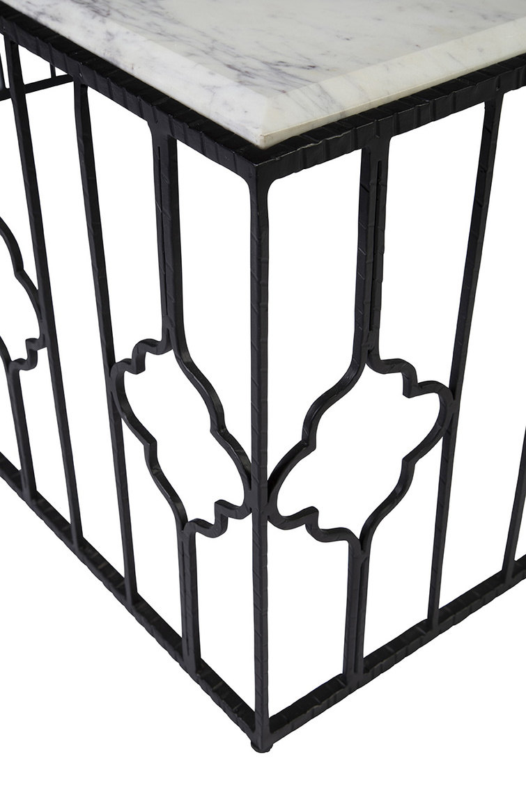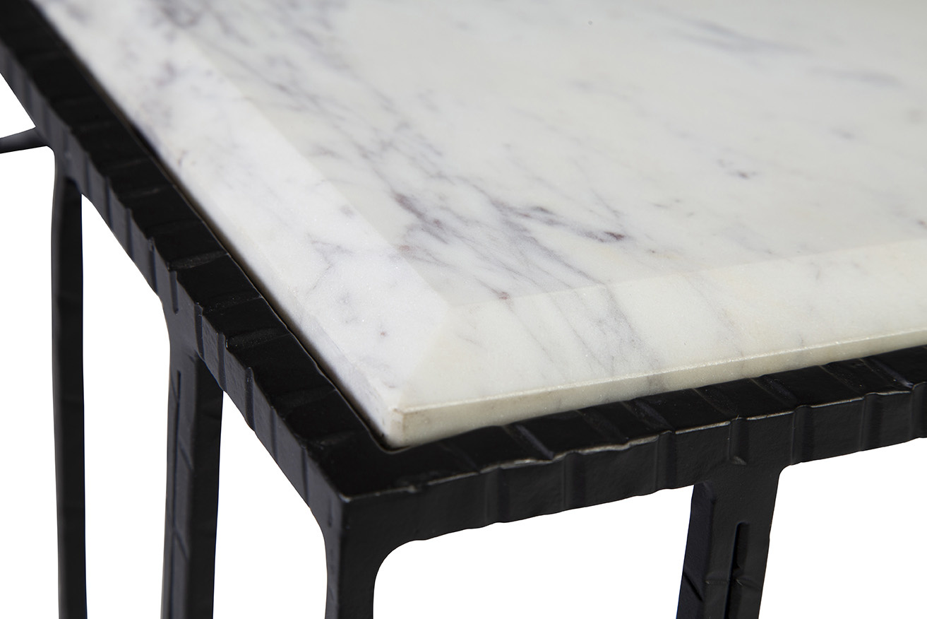 **Final Sale - All Items are sold as is, no returns unless damaged upon receipt. The table’s iron base stands as a testament to meticulous craft smanship, featuring intricate detailing and a decorative design that exudes elegance from every angle. Paired with a drop-in marble top boasting beveled edges, this cocktail table is a harmonious blend of strength, style, and sophistication.