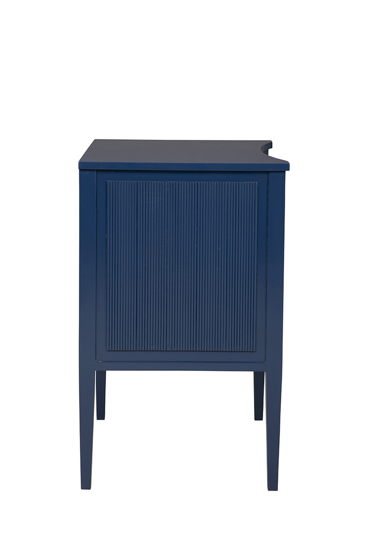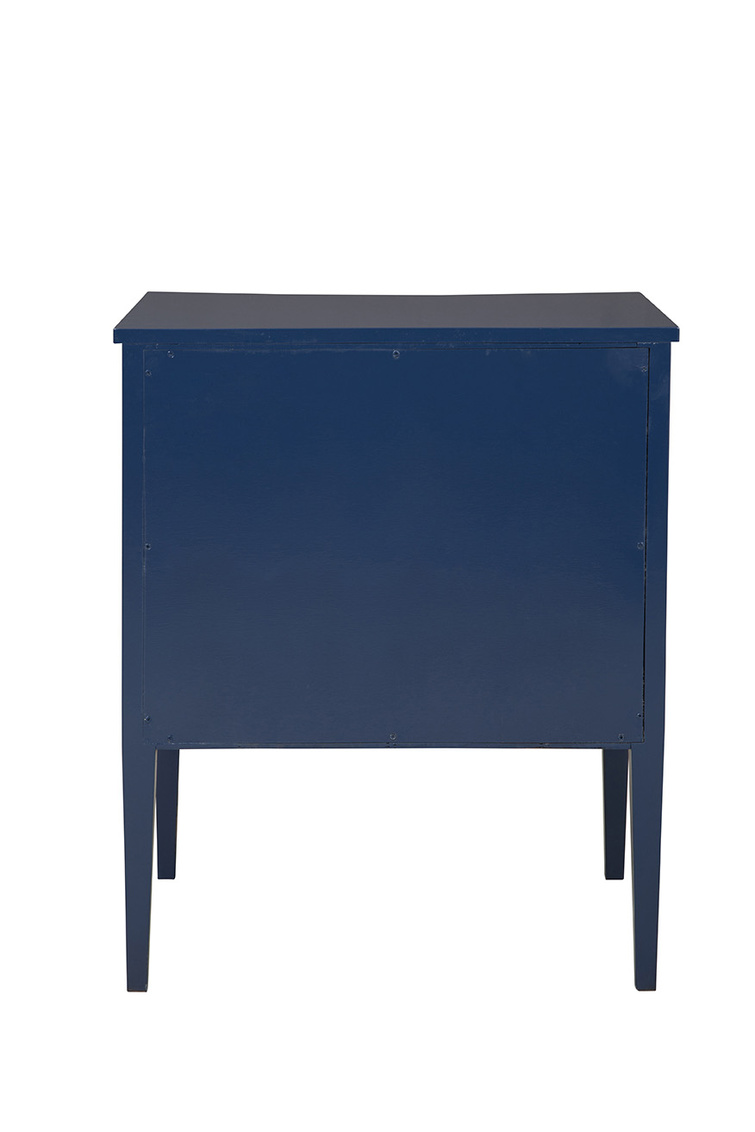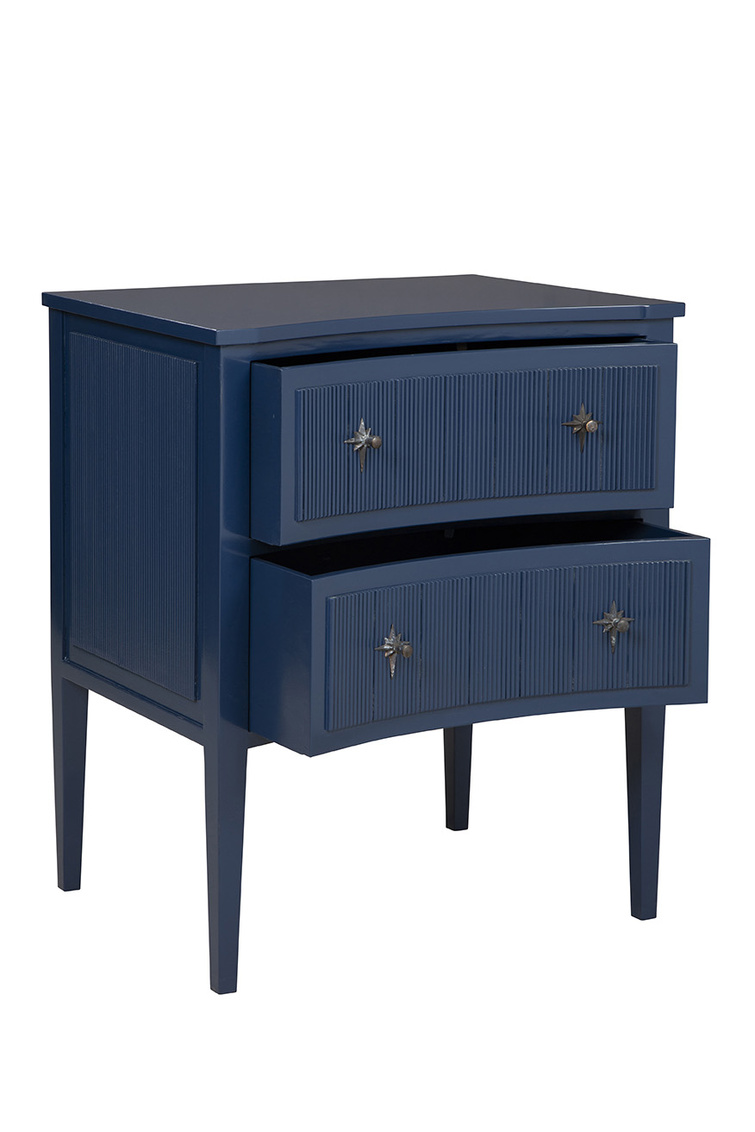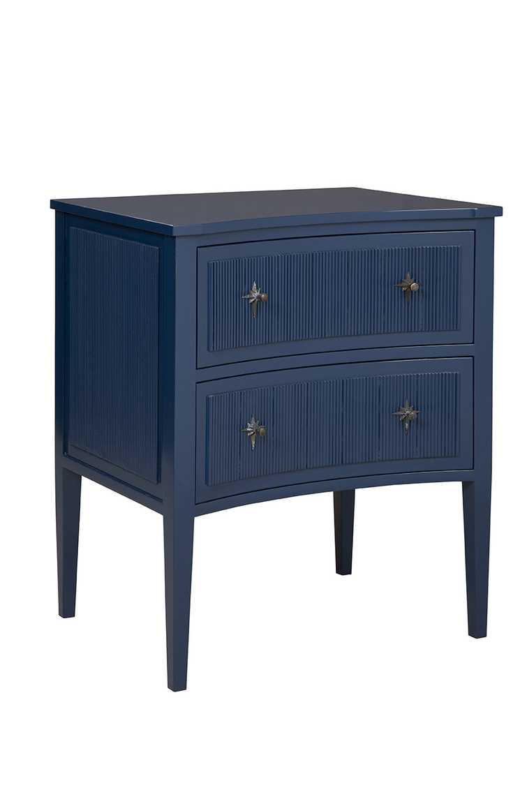 The Blue Constellation Chest is a sleek fusion of style and usability, boasting a rich blue finish on solid wood standing on slender tapered legs. Its two generous drawers are complemented by a petite and elegant structure, complete with a unique reeded design on the framed drawers and sides. The antique brass pulls add a touch of sophistication and contrast to the chest's overall aesthetic appeal. This versatile piece can shine as a standalone chest or serve as a distinctive bedside table, sure to elevate the look of any room with its charm and practicality.