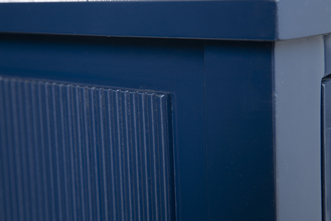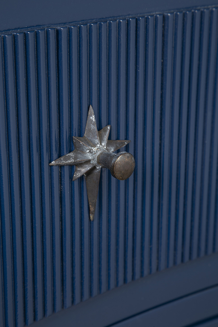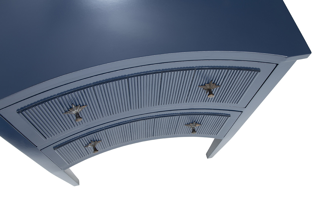 The Blue Constellation Chest is a sleek fusion of style and usability, boasting a rich blue finish on solid wood standing on slender tapered legs. Its two generous drawers are complemented by a petite and elegant structure, complete with a unique reeded design on the framed drawers and sides. The antique brass pulls add a touch of sophistication and contrast to the chest's overall aesthetic appeal. This versatile piece can shine as a standalone chest or serve as a distinctive bedside table, sure to elevate the look of any room with its charm and practicality.