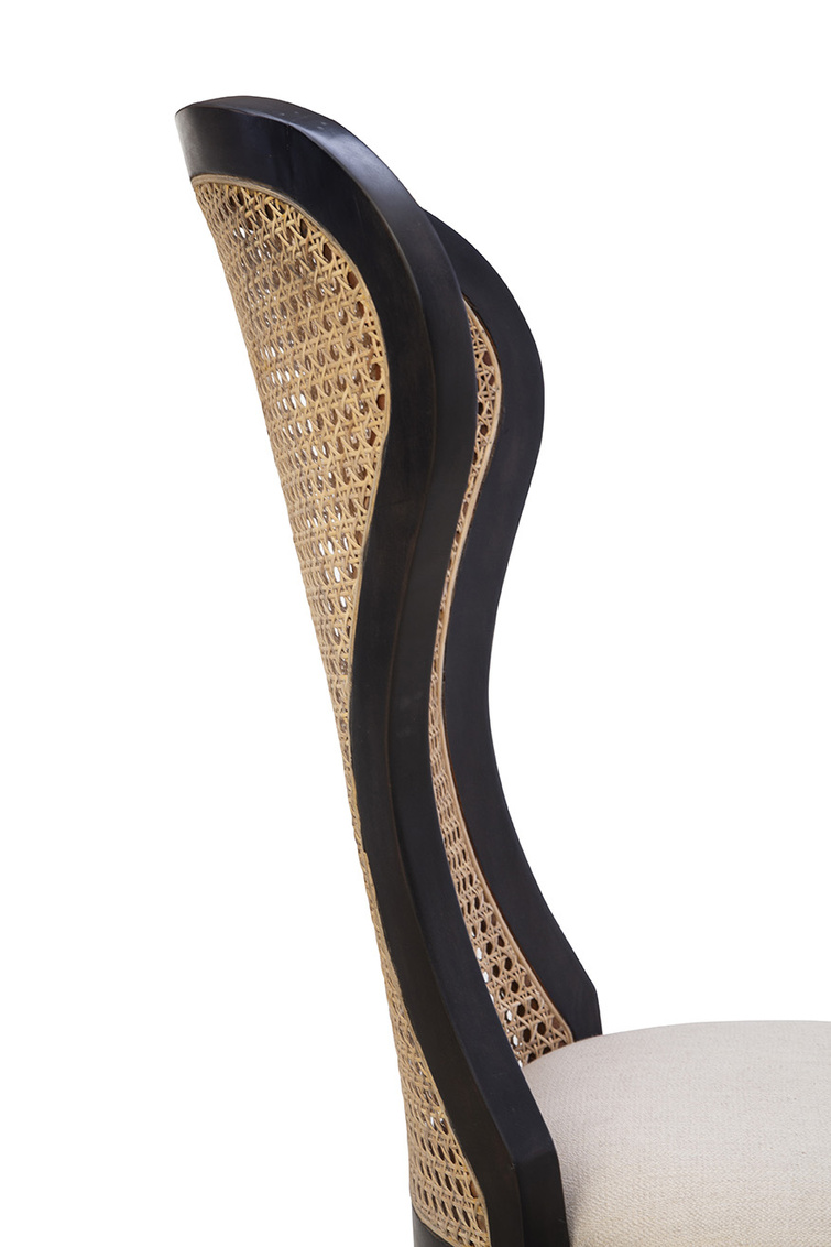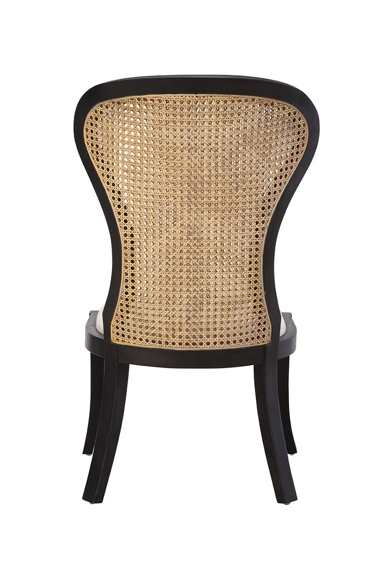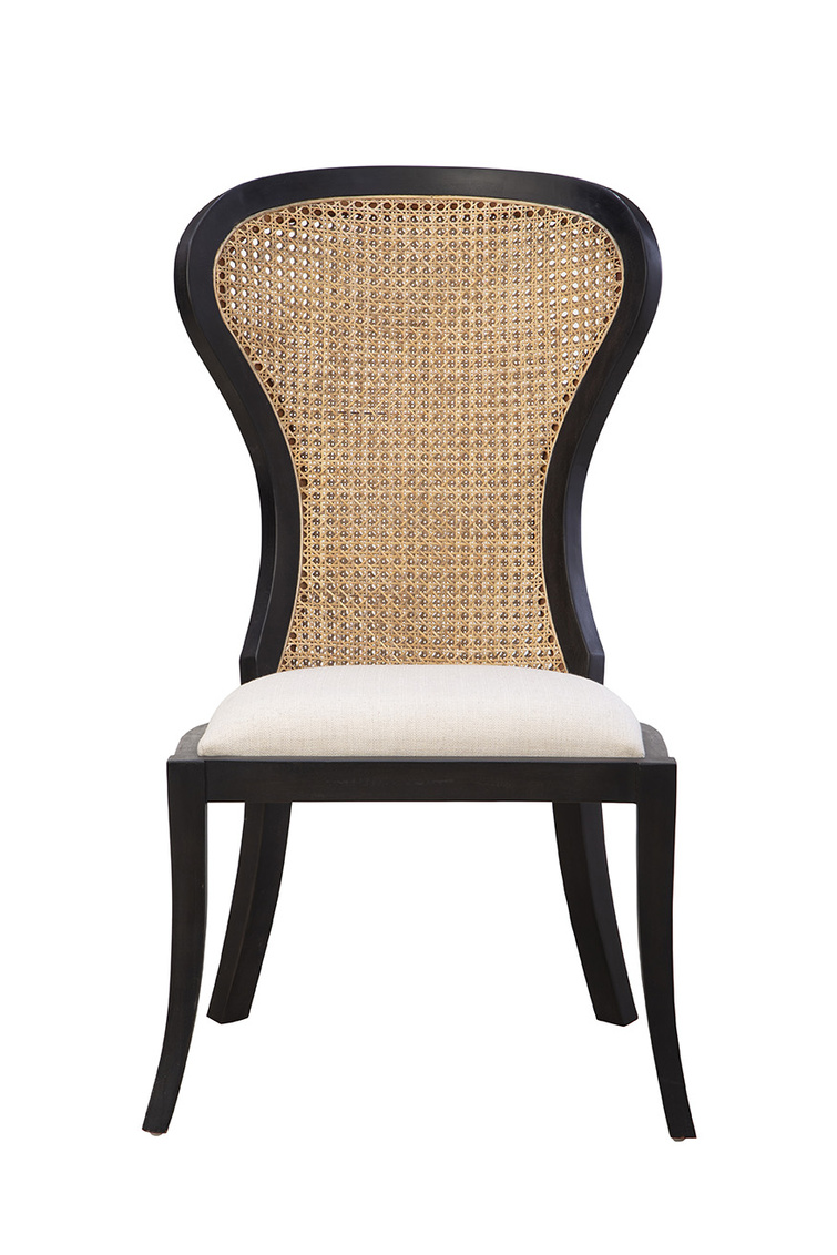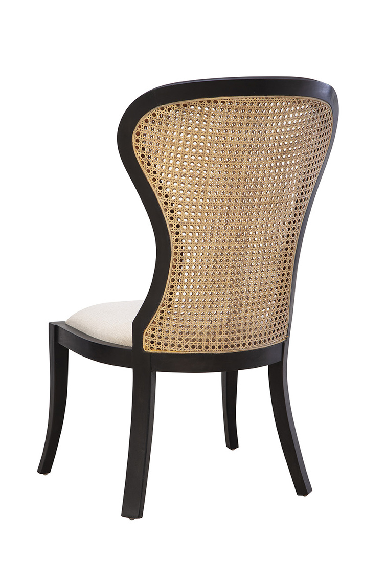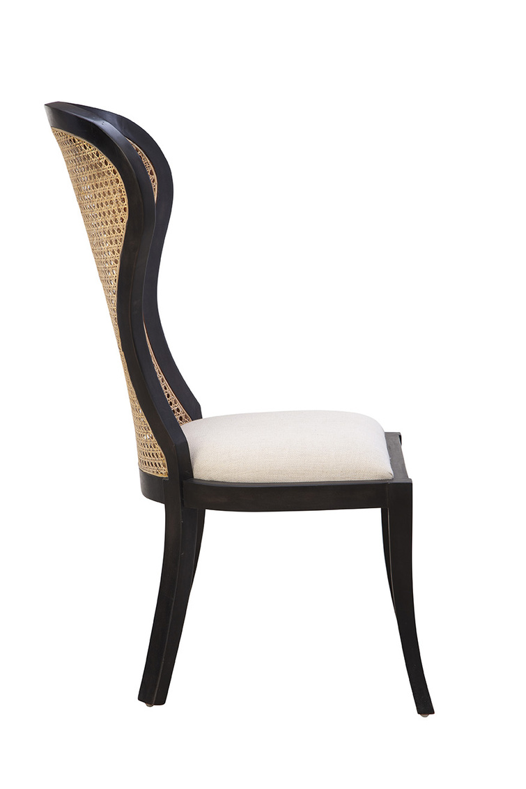 Indulge in the Black Adrina Side Chair, a chic and comfortable addition to your dining setup. Its sturdy solid wood frame shows off a smooth black finish, topped with a cozy built-in linen cushion. The standout curved high back, filled with double-sided hand caning, adds a unique touch to the design. Sitting in this chair will make you feel like royalty at your own dining table.