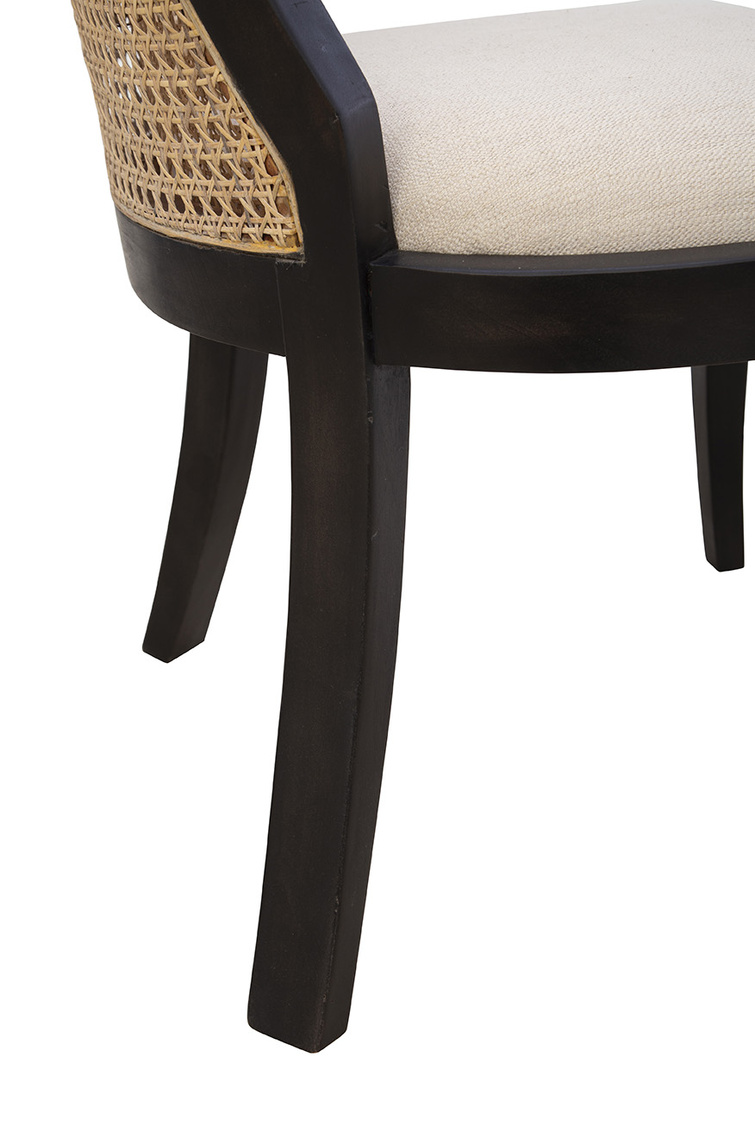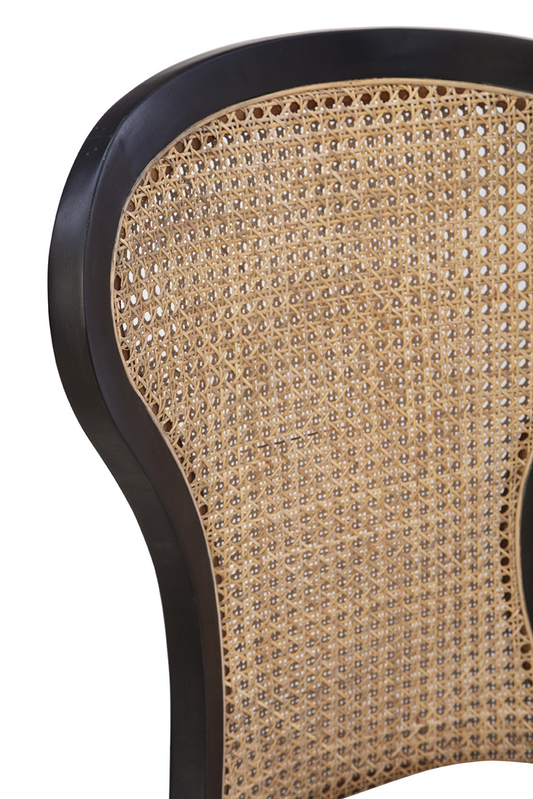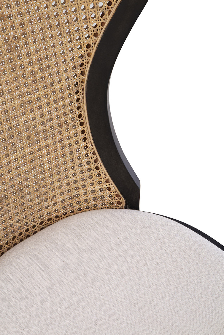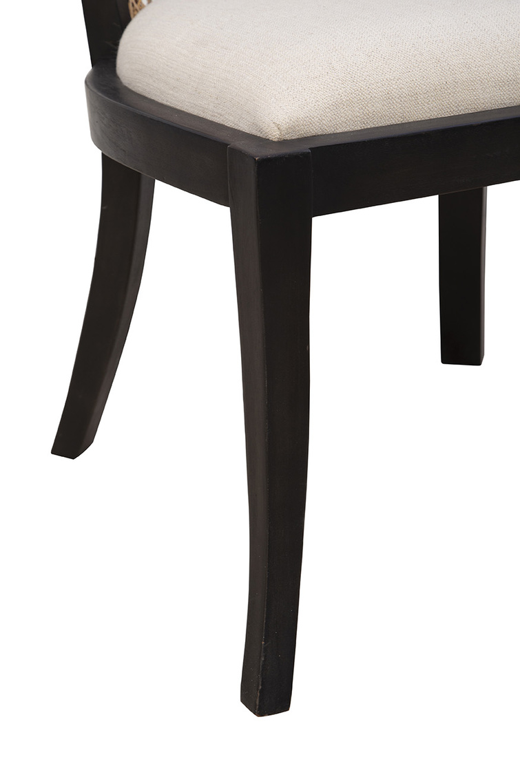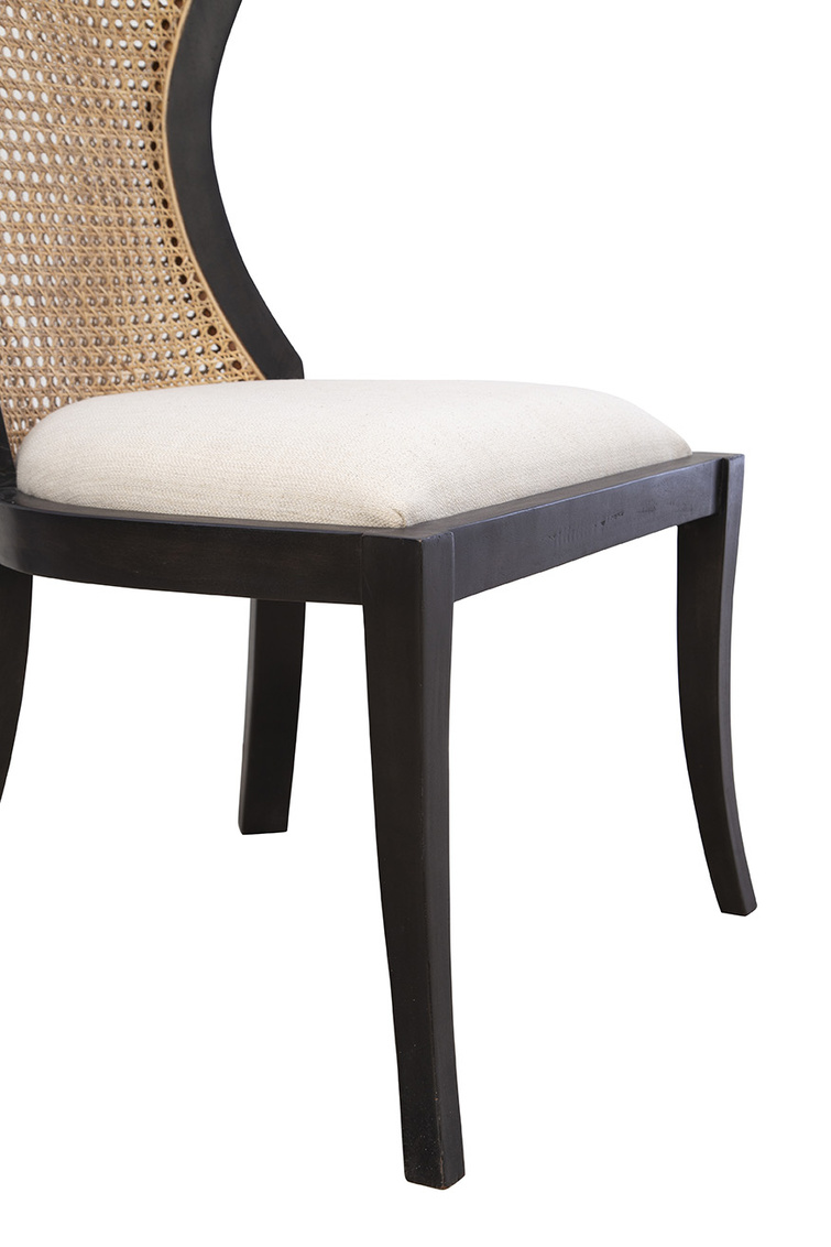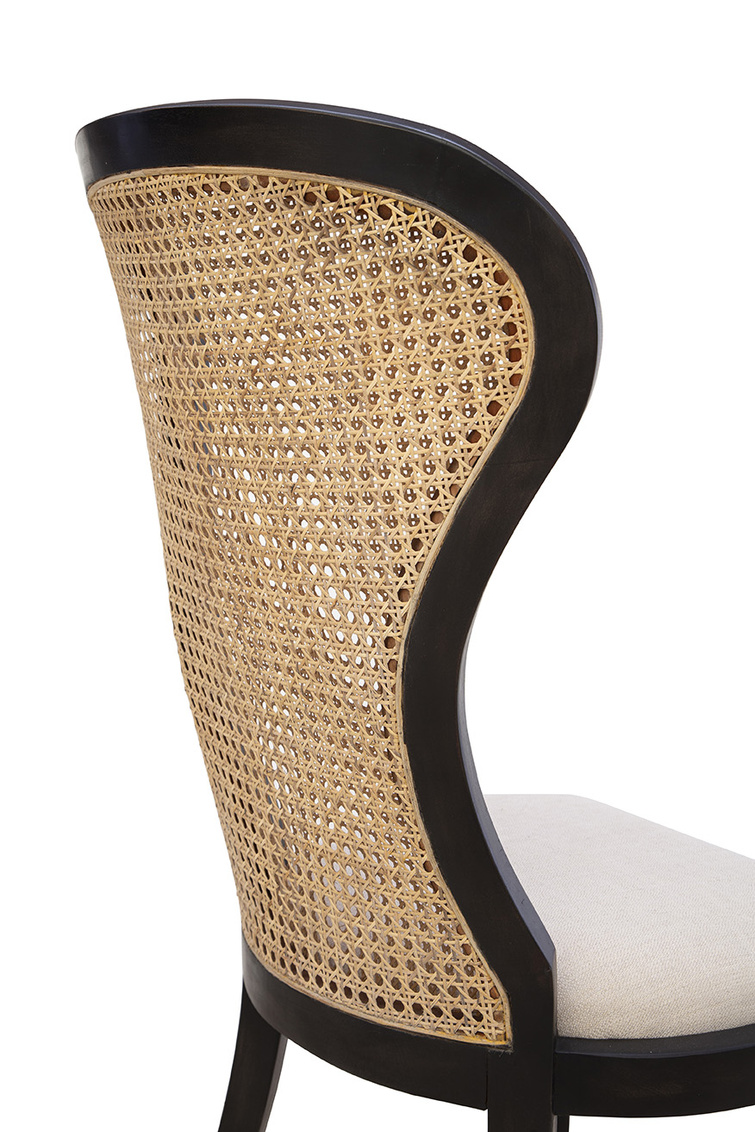 Indulge in the Black Adrina Side Chair, a chic and comfortable addition to your dining setup. Its sturdy solid wood frame shows off a smooth black finish, topped with a cozy built-in linen cushion. The standout curved high back, filled with double-sided hand caning, adds a unique touch to the design. Sitting in this chair will make you feel like royalty at your own dining table.