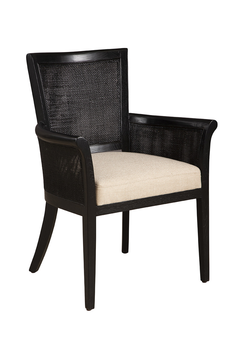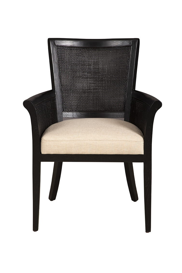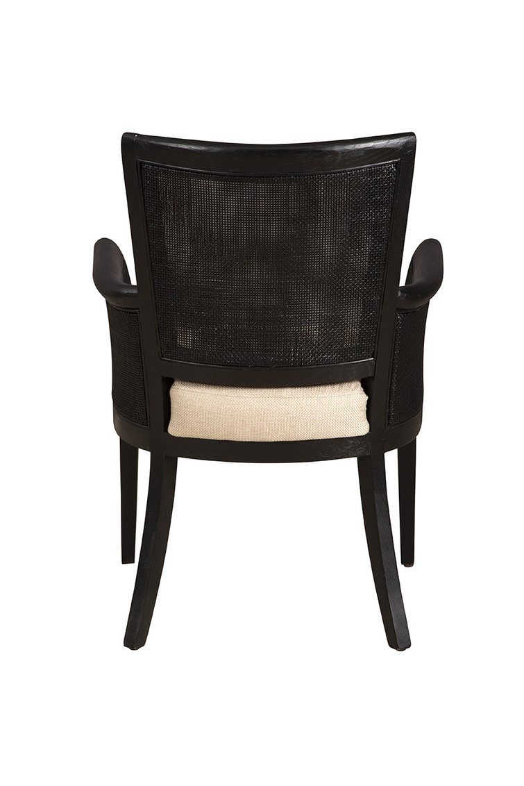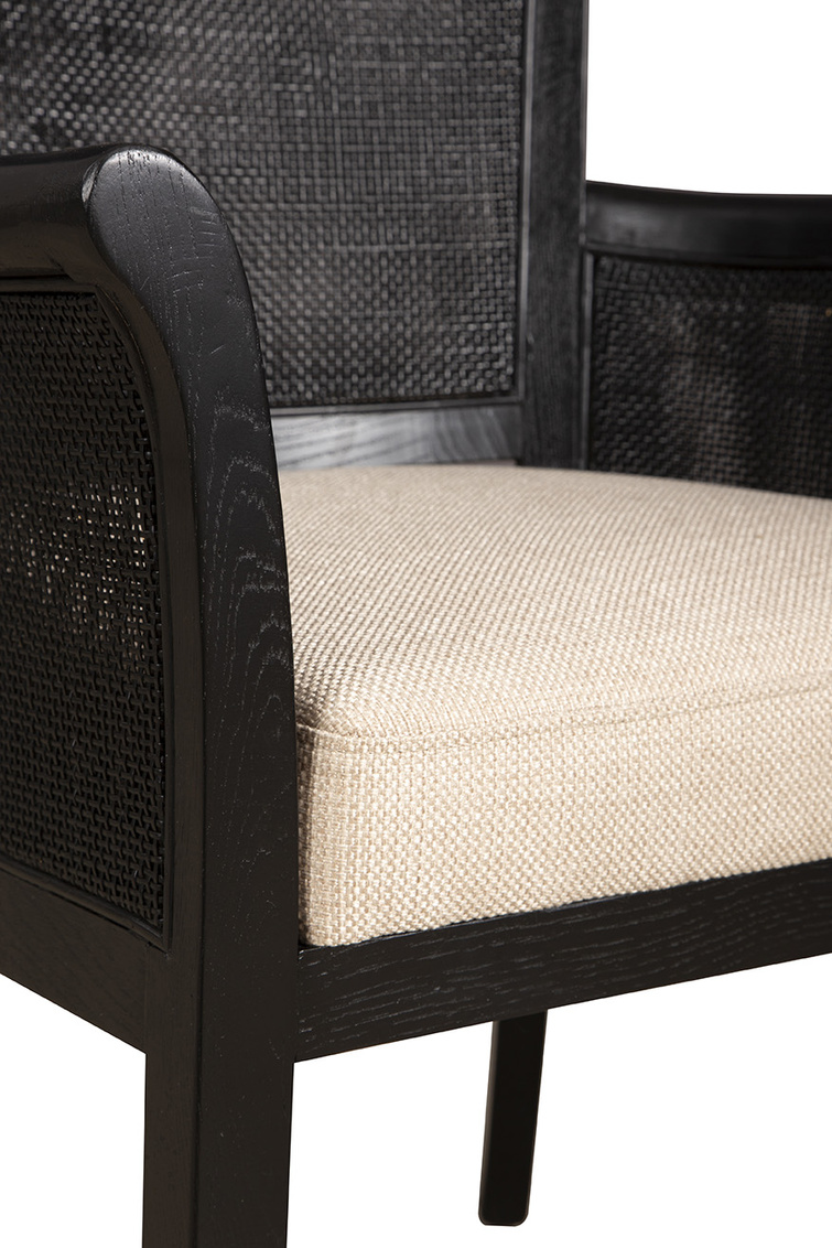 **Final Sale - All Items are sold as is, no returns unless damaged upon receipt. Introducing the Black Gimble Arm Chair, a statement piece that combines sophistication with comfort. Its smooth black frame provides a stark, elegant backdrop for the soft linen cushion, creating a look that is both classy and inviting. The chair's distinctive woven back and arms not only add layers of texture but also enhance comfort, all while preserving a sleek, streamlined appearance. Curved legs offer an additional element of visual appeal, subtly enhancing the overall design with a touch of grace.