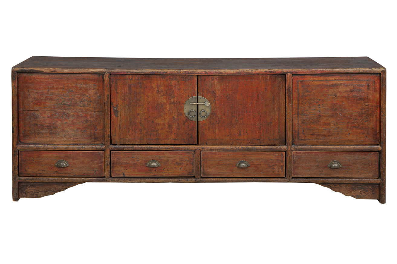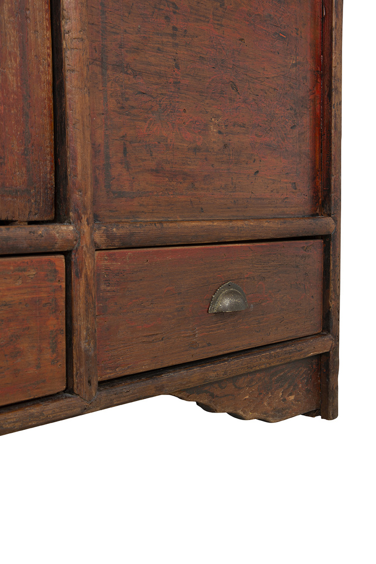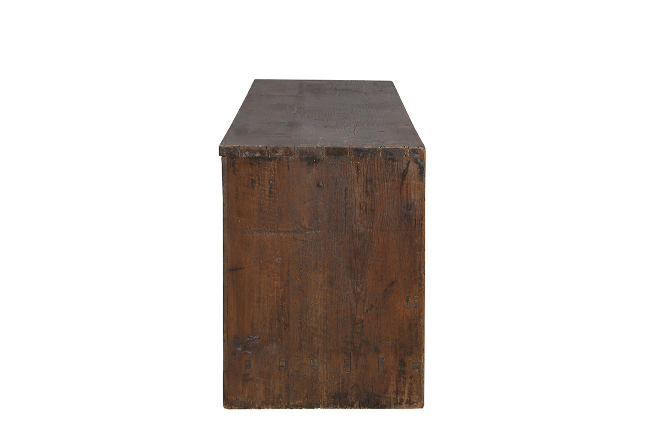 Introducing the Antique Autumn Cabinet, a wide and inviting addition to your space. This rectangular cabinet in a soothing autumn brown hue offers ample horizontal storage through its cabinet doors and four bottom drawers, ideal for organizing your essentials with ease. Embrace the old-world allure and timeless intrigue of this true antique piece, effortlessly blending functionality with vintage charm. The vintage metal hardware not only secures your belongings but also adds a touch of elegance, sealing in the antique charm that defines this exceptional cabinet.