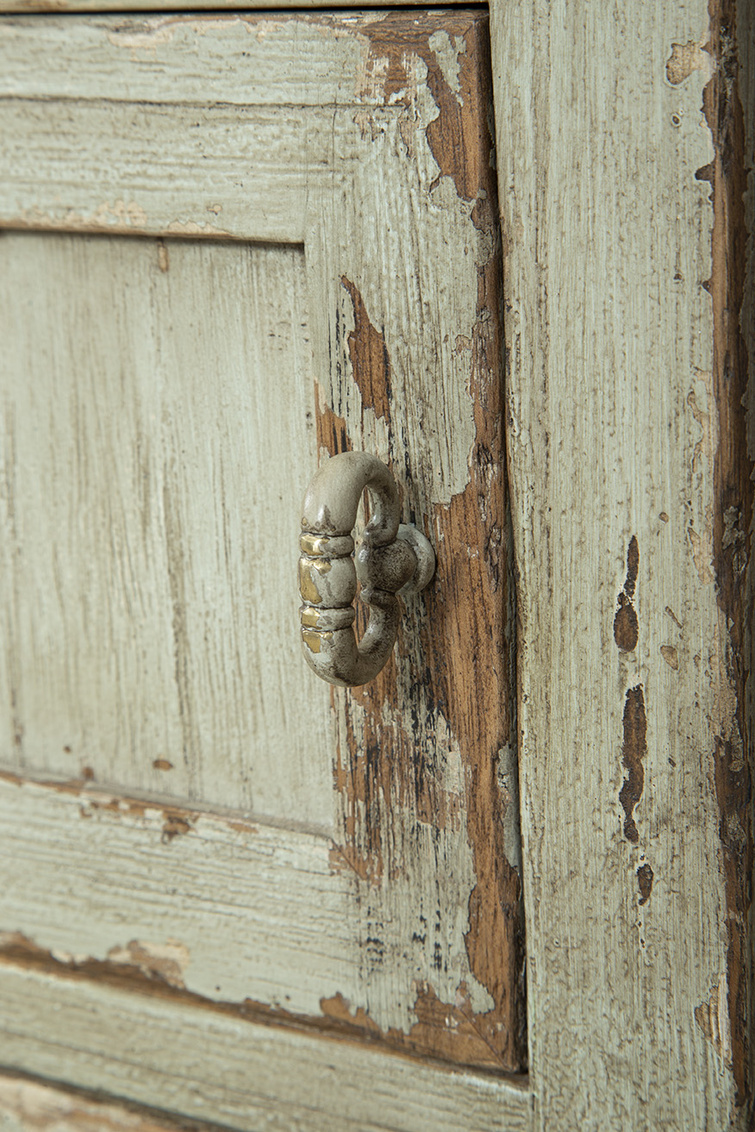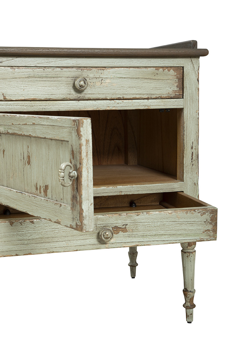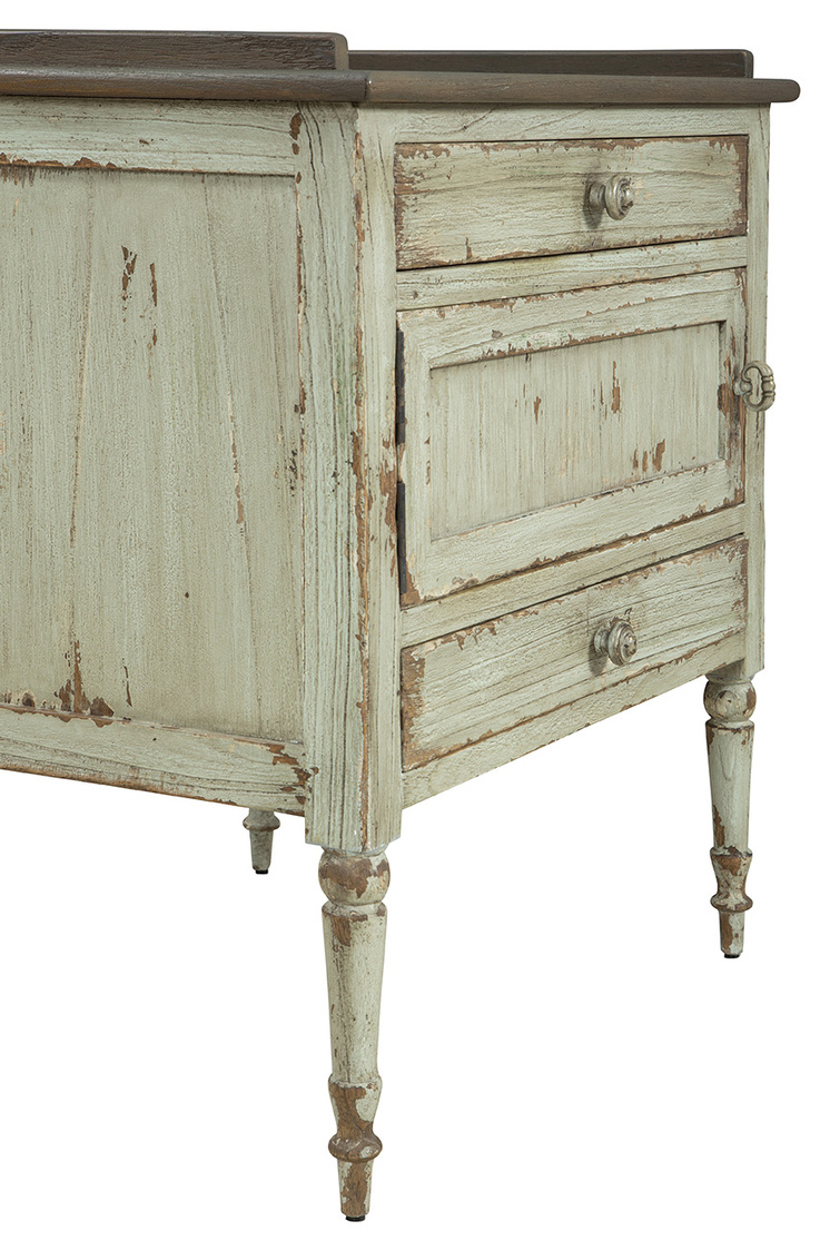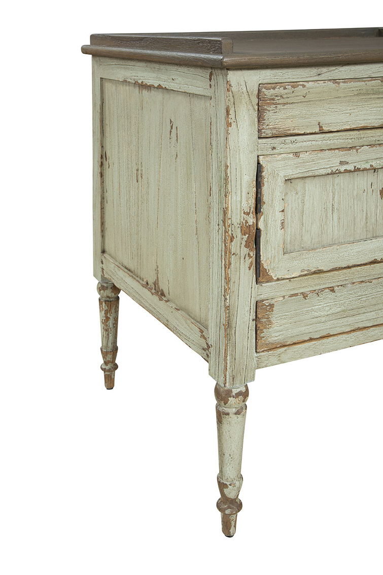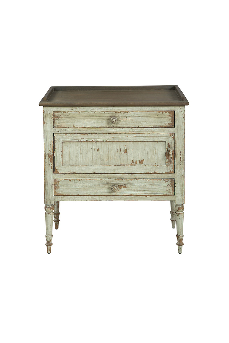 **Final Sale - All Items are sold as is, no returns unless damaged upon receipt. Introducing the Thatcher End Table - a timeless piece crafted from solid mindi wood with a subtle light green hue and a highly distressed finish for that vintage appeal. This end table boasts classic carved legs and is designed with two shallow drawers - one at the top, one at the bottom, with a cabinet space in between for additional storage. The hardware perfectly matches the distressed finish, but it's the standout cabinet key that adds a unique and stylish touch to the overall design. Complete with edging that enhances its vintage charm, the Thatcher End Table is a perfect blend of elegance and functionality for any living space.
