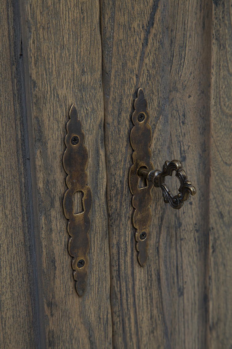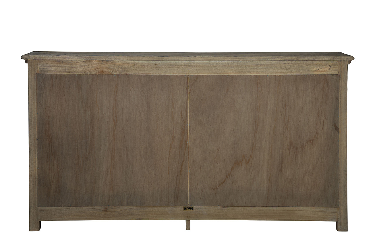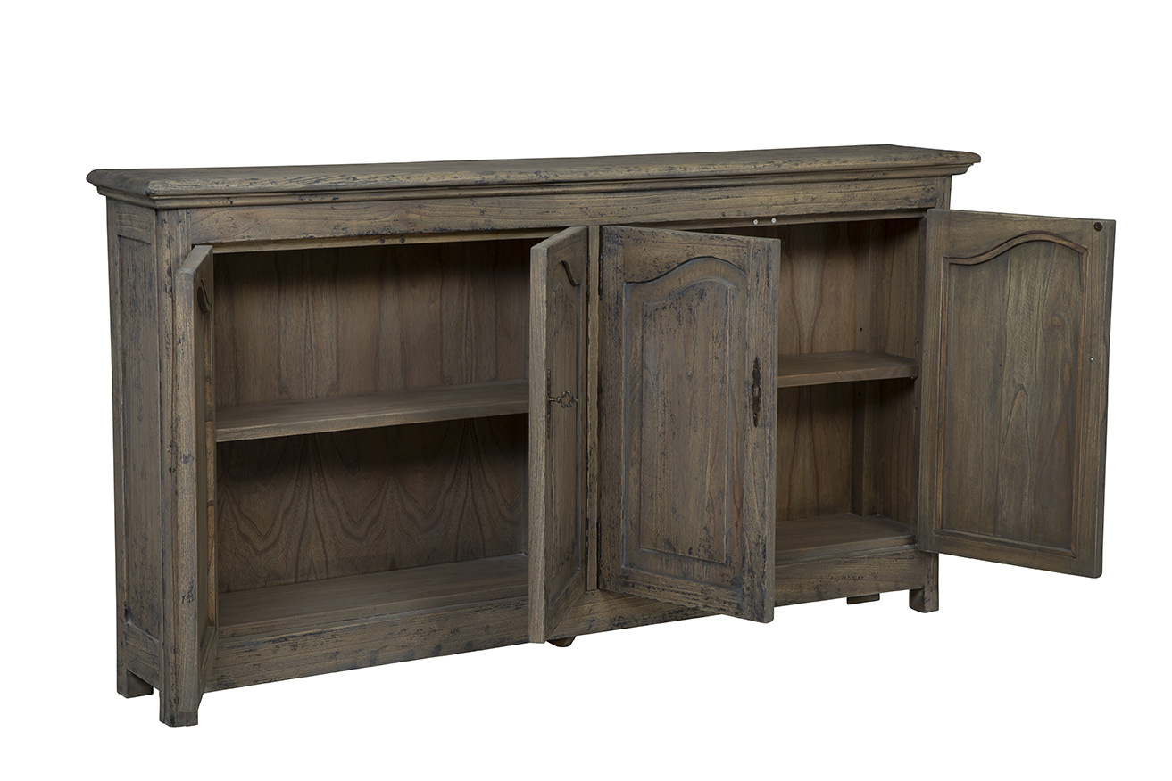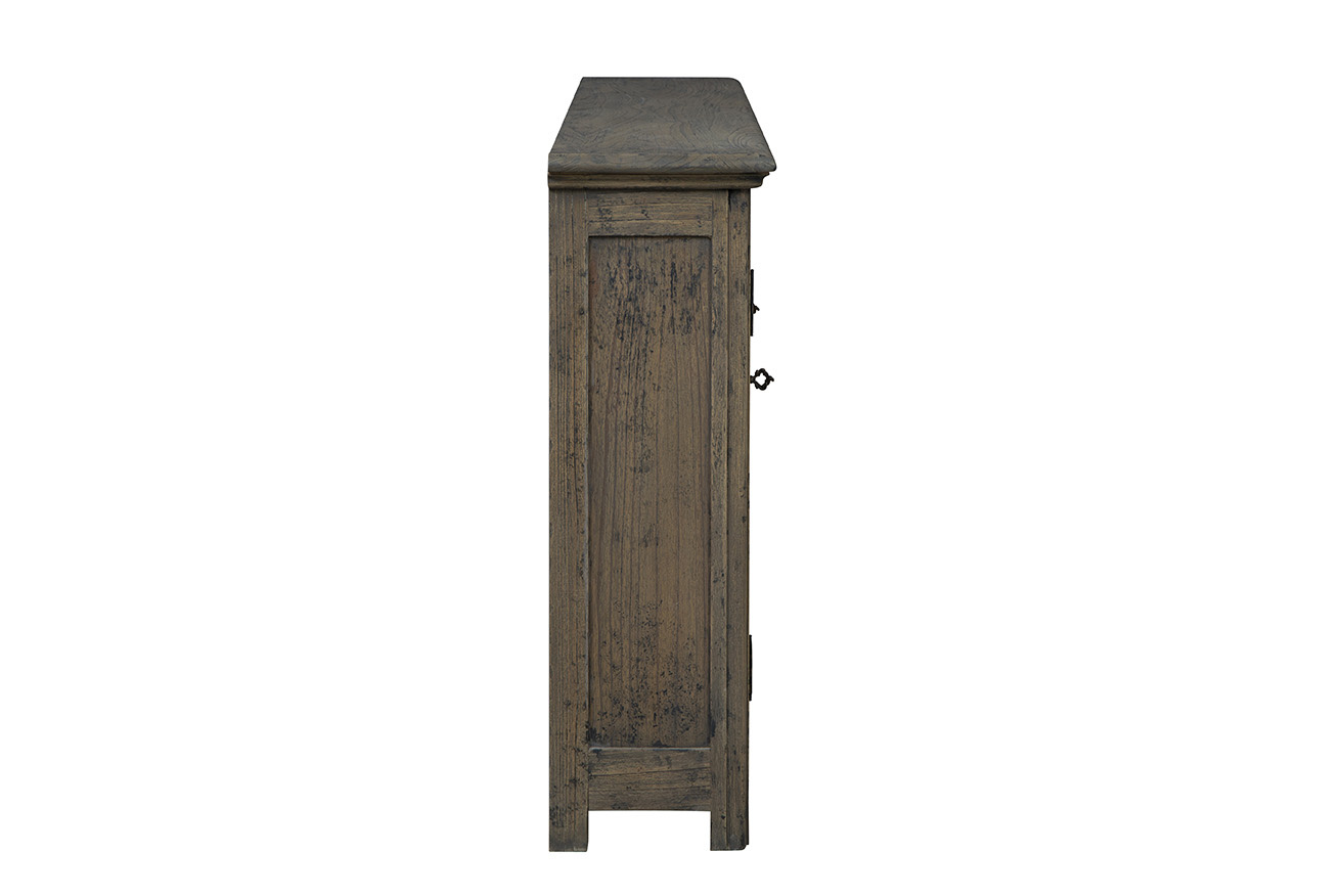 Introducing the Hughes Server, a timeless piece crafted from solid wood that emanates vintage charm. The distressed gray-brown finish gives it an old-fashioned appeal, perfect for adding character to any space. Adorned with subtle yet distinctive key-turn vintage hardware, this server showcases carvings on the front that further enhances its classic aesthetic. Ideal for storage, the Hughes Server is not only practical but also adds a touch of nostalgia to your home decor.