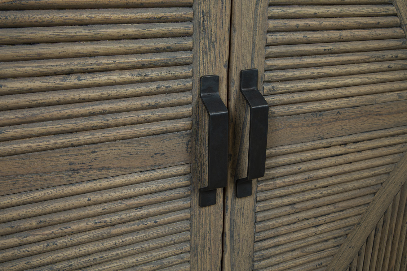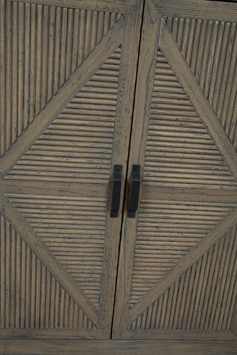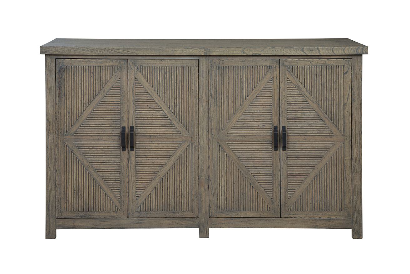 The versatile Blakely Sideboard effortlessly combines classic and modern elements, making it a perfect addition to various interior styles. Crafted from solid wood with a neutral grayish-brown finish, it exudes timeless charm. The double cabinet doors open to reveal separate internal storage shelves for organized storage. Intricate triangular carvings on the doors add texture and visual interest, while black industrial handles provide a sleek addition to this piece