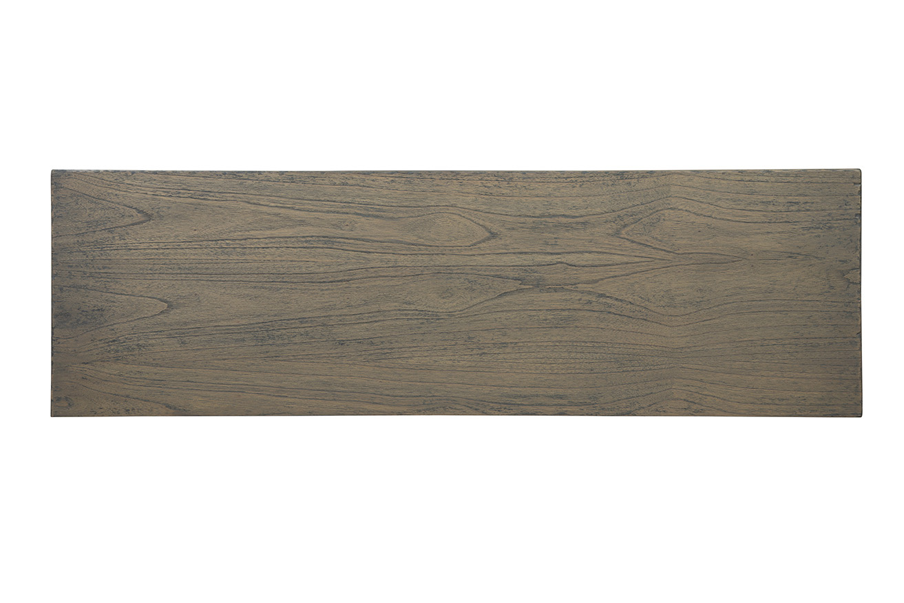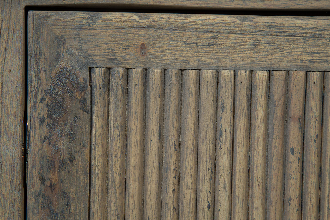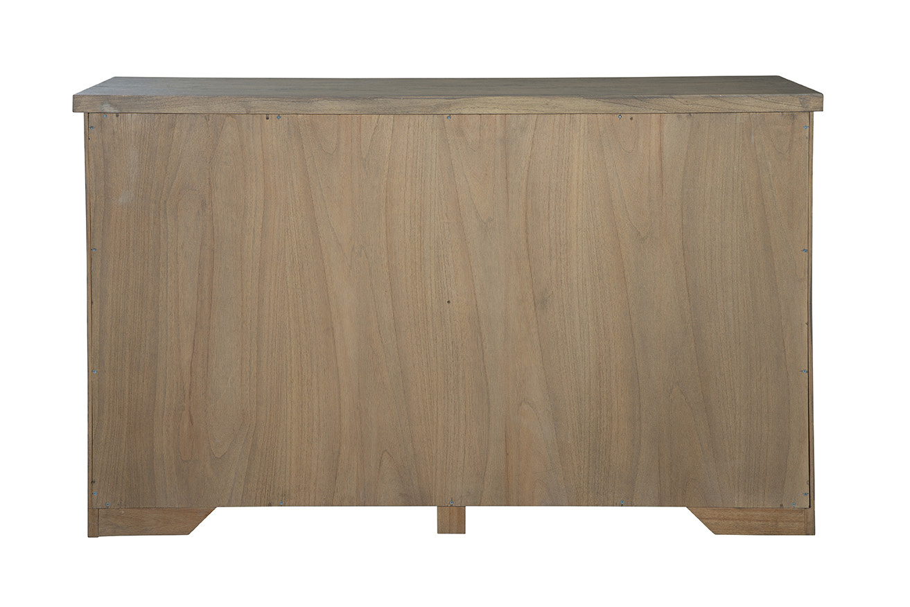 The versatile Blakely Sideboard effortlessly combines classic and modern elements, making it a perfect addition to various interior styles. Crafted from solid wood with a neutral grayish-brown finish, it exudes timeless charm. The double cabinet doors open to reveal separate internal storage shelves for organized storage. Intricate triangular carvings on the doors add texture and visual interest, while black industrial handles provide a sleek addition to this piece