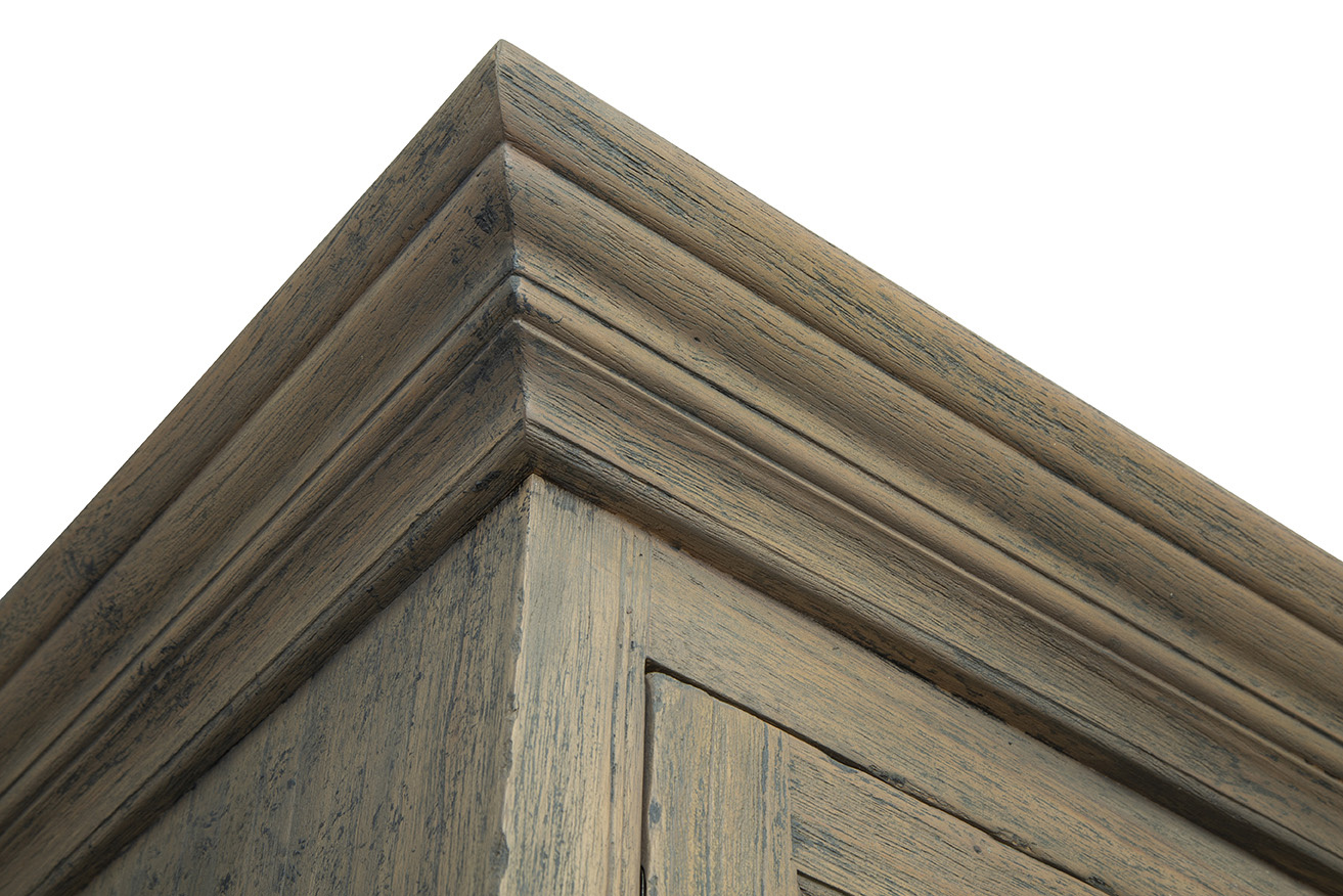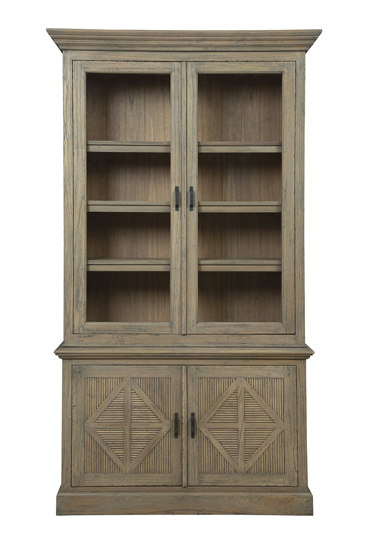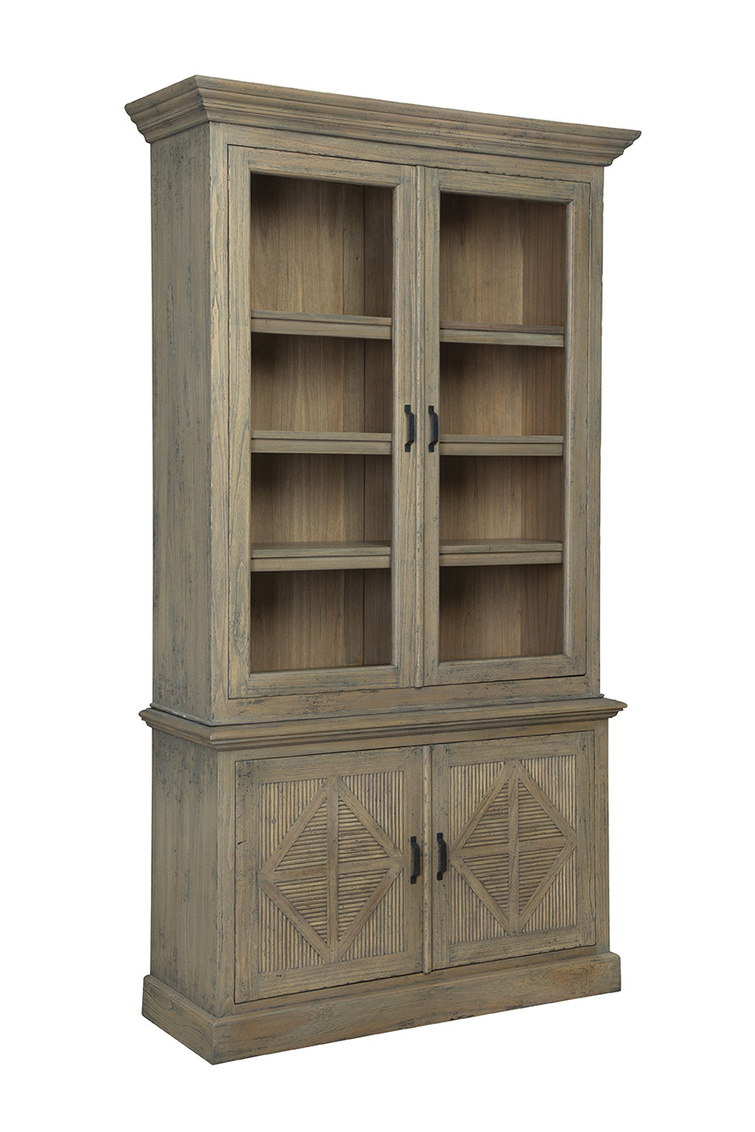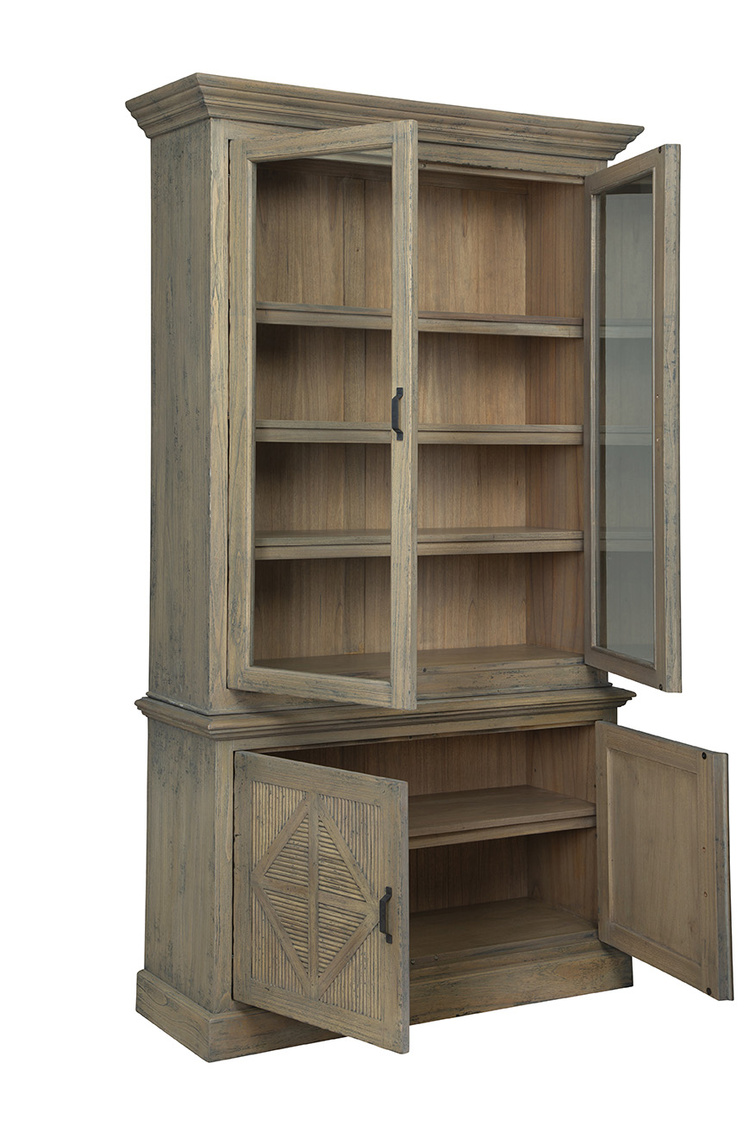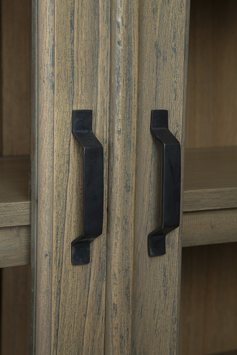**Final Sale - All Items are sold as is, no returns unless damaged upon receipt. The Blakely Cabinet effortlessly merges classic and modern design elements, making it a good choice for various interior styles. Constructed from solid wood with a neutral grayish-brown finish, this cabinet pairs perfectly with the Blakely Sideboard for a cohesive look. The glass cabinet doors at the top, framed by wood, offer a stylish display option, while the bottom features solid wood doors for discreet storage. Intriguing triangular carvings on the bottom doors add texture and visual interest, complemented by black industrial handles for a contemporary touch.