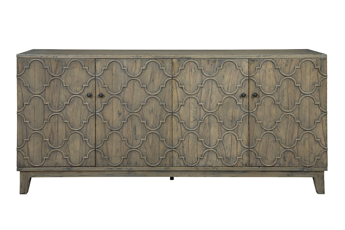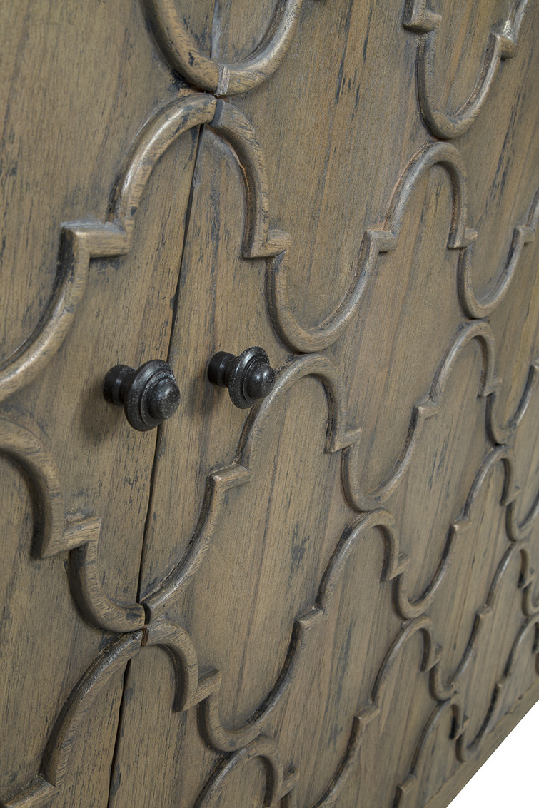 **Final Sale - All Items are sold as is, no returns unless damaged upon receipt. Introducing the Pearl Sideboard, where modern convenience meets antique charm! This spacious sideboard is a storage powerhouse with a nod to the past in its exterior design. Crafted from sturdy solid wood, it boasts a modern shape peppered with a distinctive distressed brownish-grey finish, adding a touch of character and history to your space. The interior is all about sleek storage solutions, providing ample space for all your organizational needs. But it's the exterior that steals the show, with intricate door carvings that evoke a sense of old-world elegance.