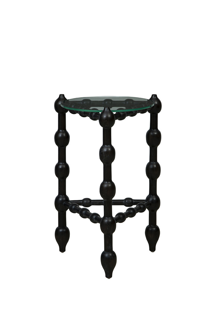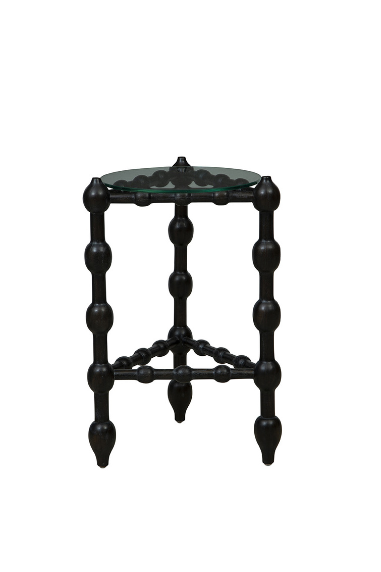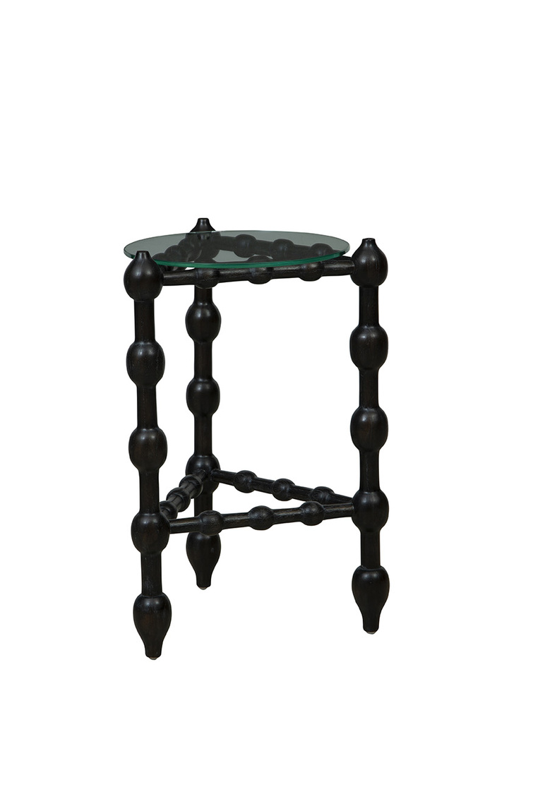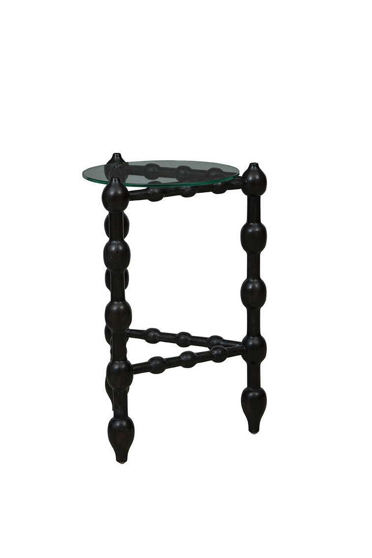 Introducing the Black Marcos End Table, a stunning distinctive design. This unique end table is crafted with a base made of solid wood in a sleek black finish, featuring a captivating triangular shape with bulb-like details intricately carved throughout. Topping off this exquisite piece is a petite glass table top that adds a touch of sophistication and elegance. Small in size yet big on style, the Black Marcos End Table is sure to be a conversation starter in any space, bringing a modern and artistic flair to your interior decor.