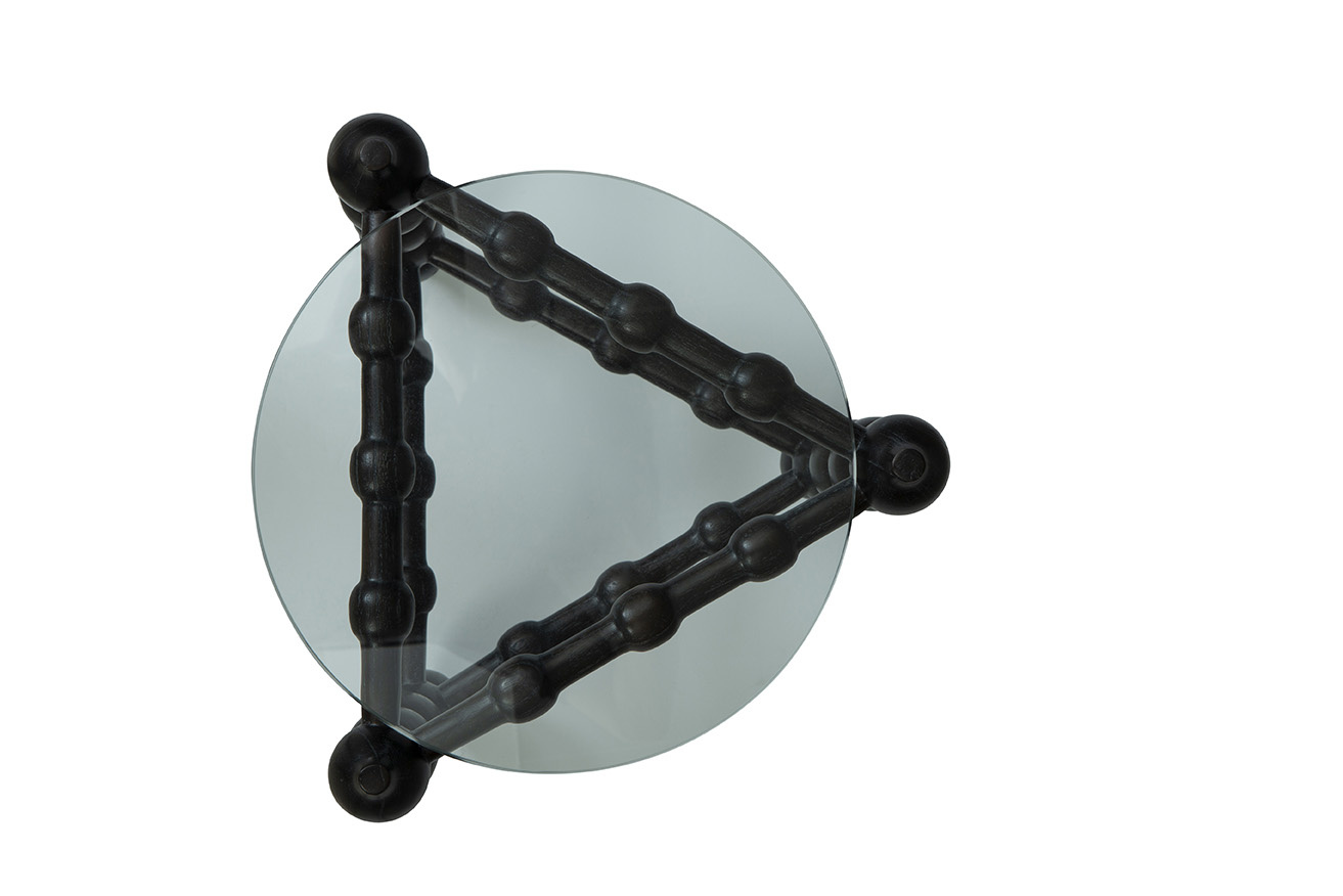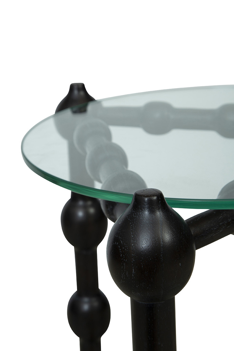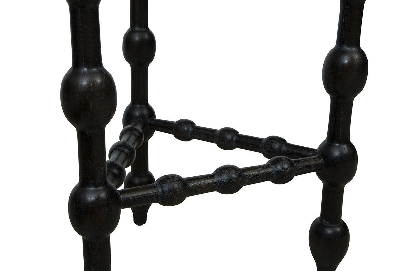 Introducing the Black Marcos End Table, a stunning distinctive design. This unique end table is crafted with a base made of solid wood in a sleek black finish, featuring a captivating triangular shape with bulb-like details intricately carved throughout. Topping off this exquisite piece is a petite glass table top that adds a touch of sophistication and elegance. Small in size yet big on style, the Black Marcos End Table is sure to be a conversation starter in any space, bringing a modern and artistic flair to your interior decor.