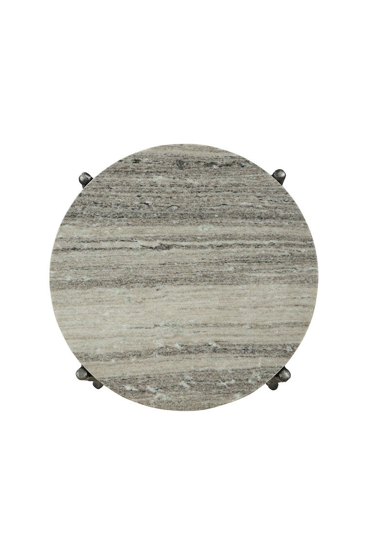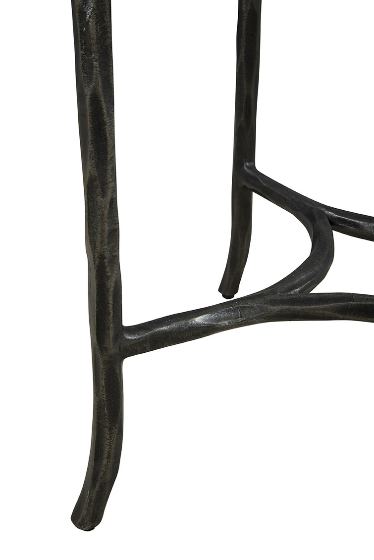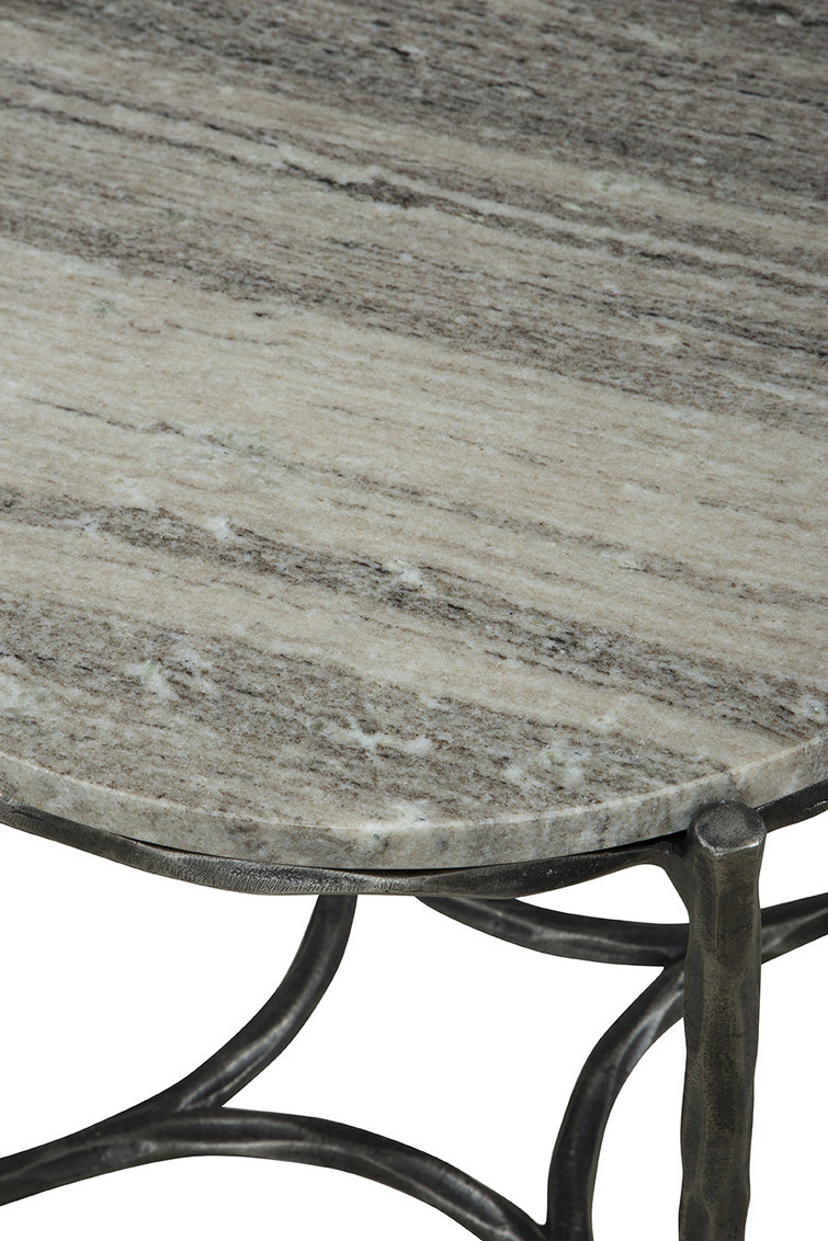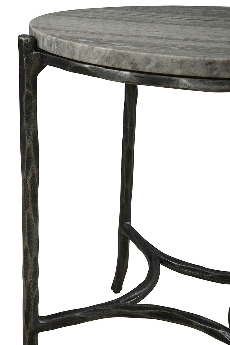 Meet the Stonewall End Table, a modern and subtly refined piece. The table showcases a black hand-hammered metal base, adding texture and a touch of craftsmanship to its design. Topping off the base is a sleek marble tabletop, providing a perfect surface for resting your essentials like drinks, phones, or books. Enhance your living space with the stylish and practical elegance of the Stonewall End Table.