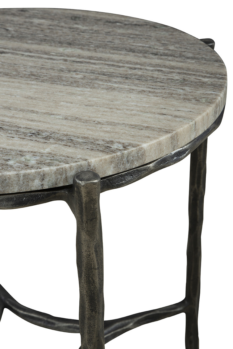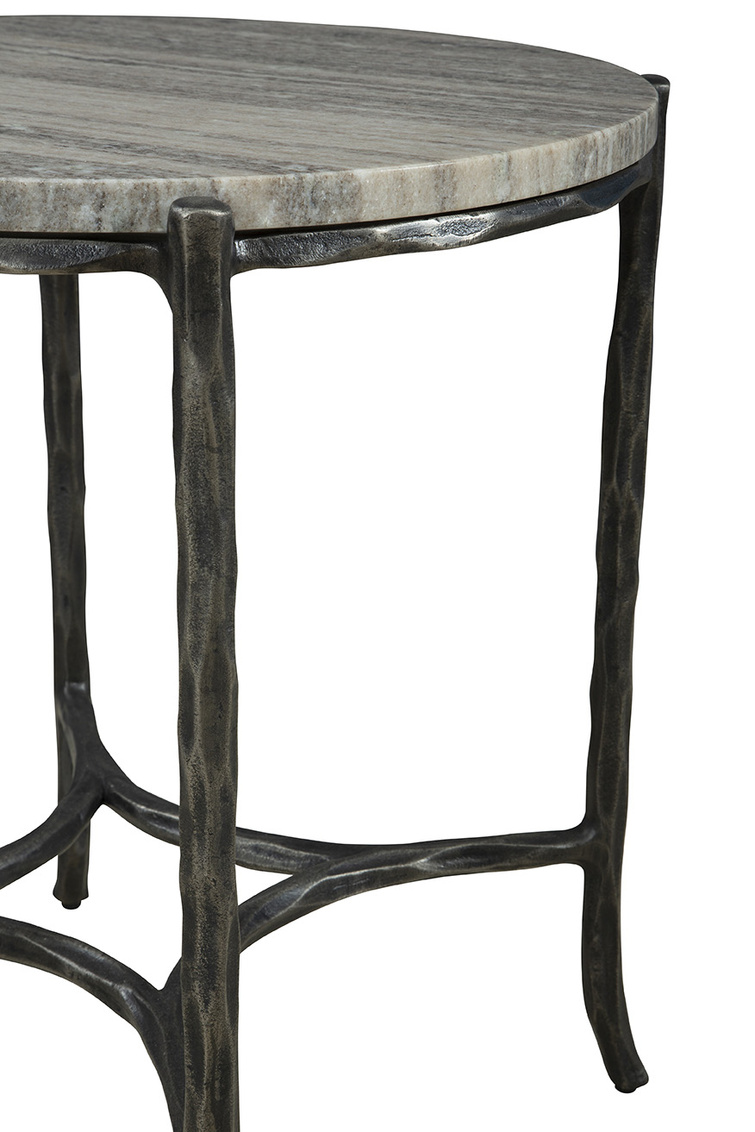 Meet the Stonewall End Table, a modern and subtly refined piece. The table showcases a black hand-hammered metal base, adding... Show more