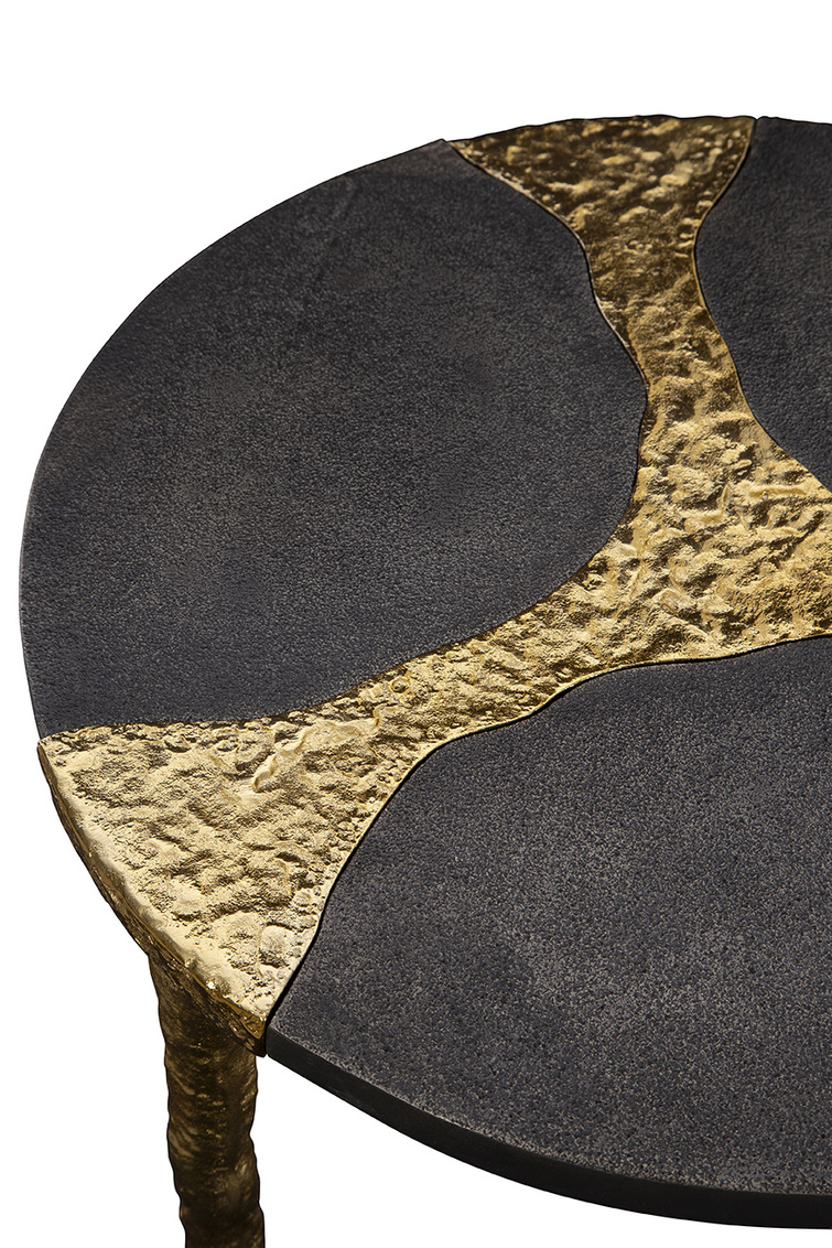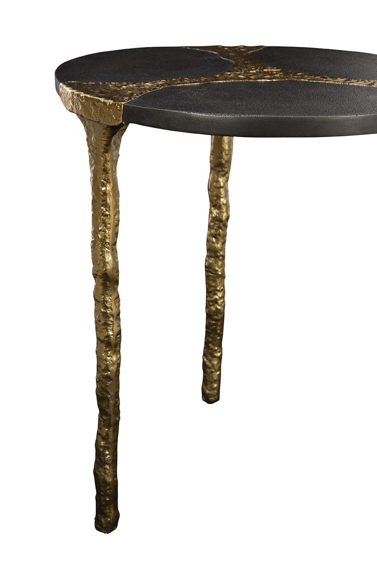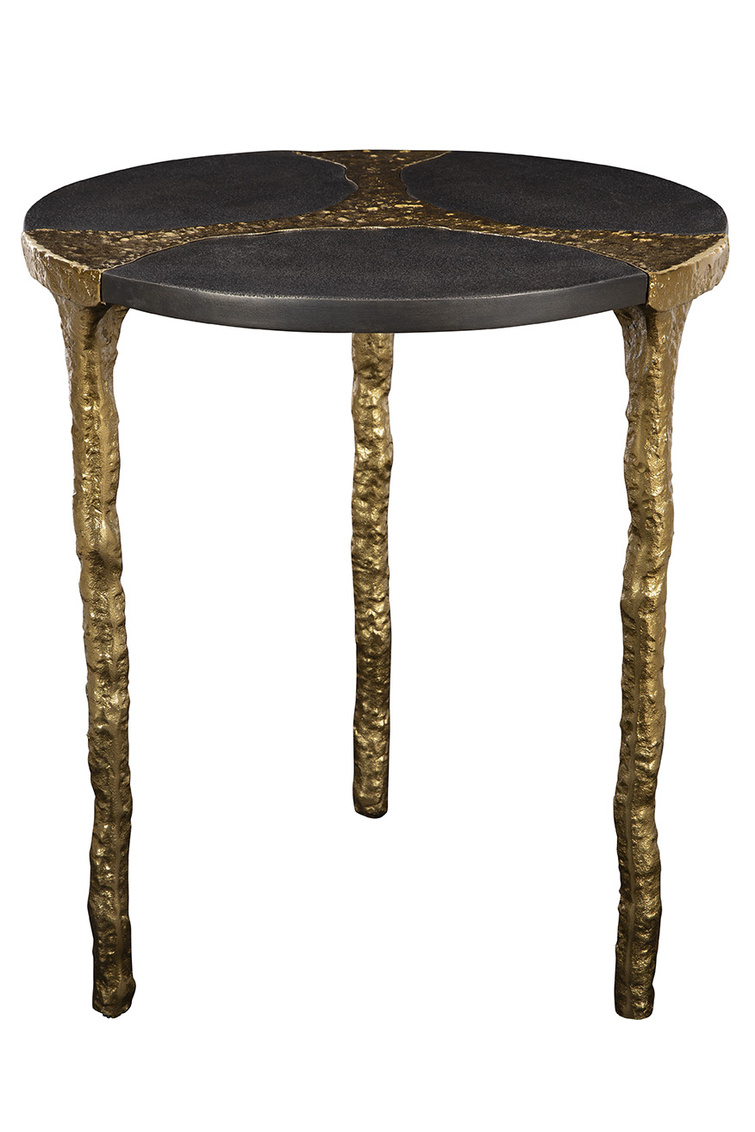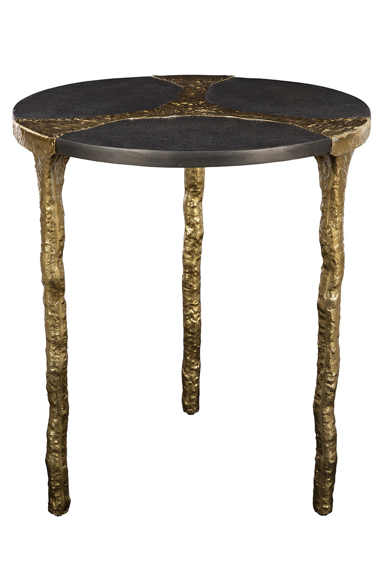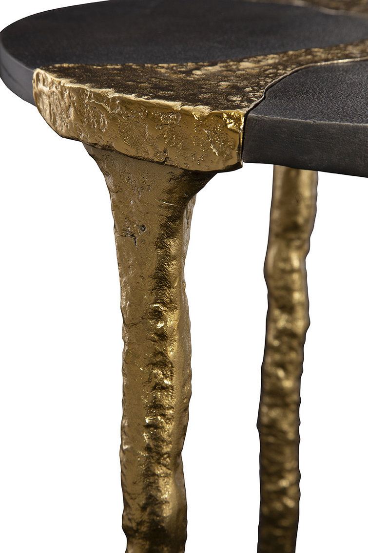 **Final Sale - All Items are sold as is, no returns unless damaged upon receipt. Introducing the Thompson End Table, a small yet artful addition to your living space. The table features shimmering gold metal cascading from the center into the legs that support the tabletop. The natural gold finish lends an elegant and organic touch, beautifully complementing the black stone tabletop. Elevate your decor with the unique and sophisticated design of the Thompson End Table, blending luxurious aesthetics with natural elements for a striking visual impact.