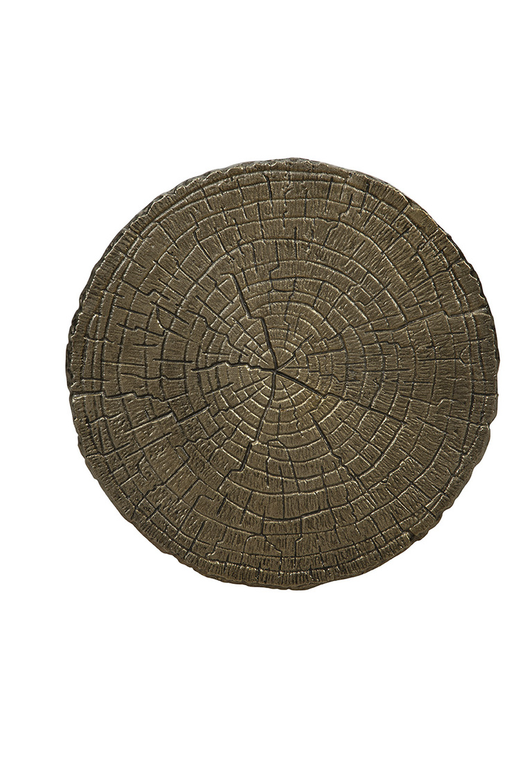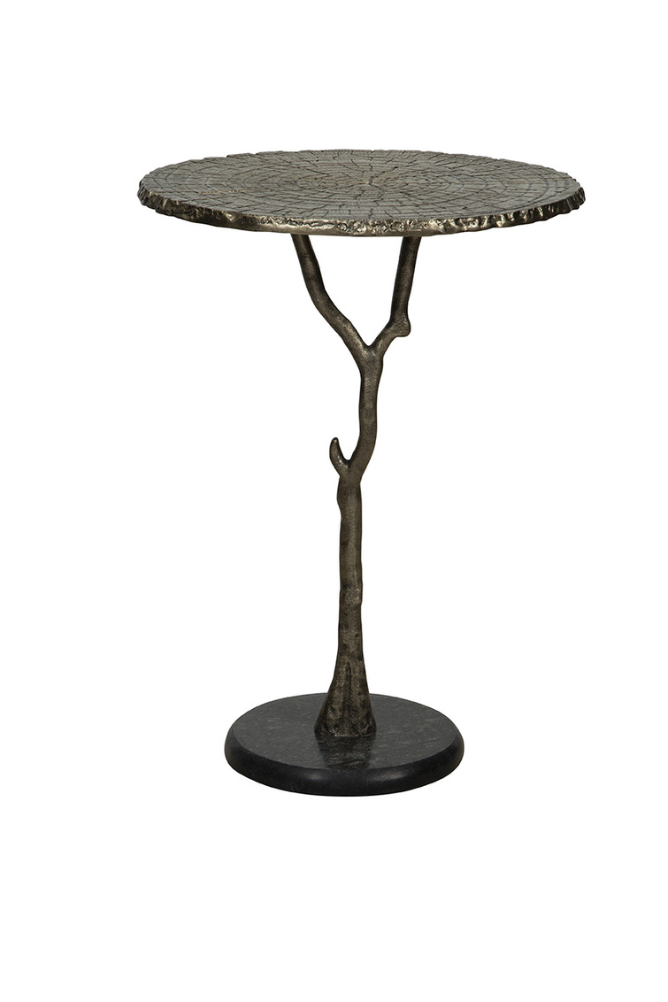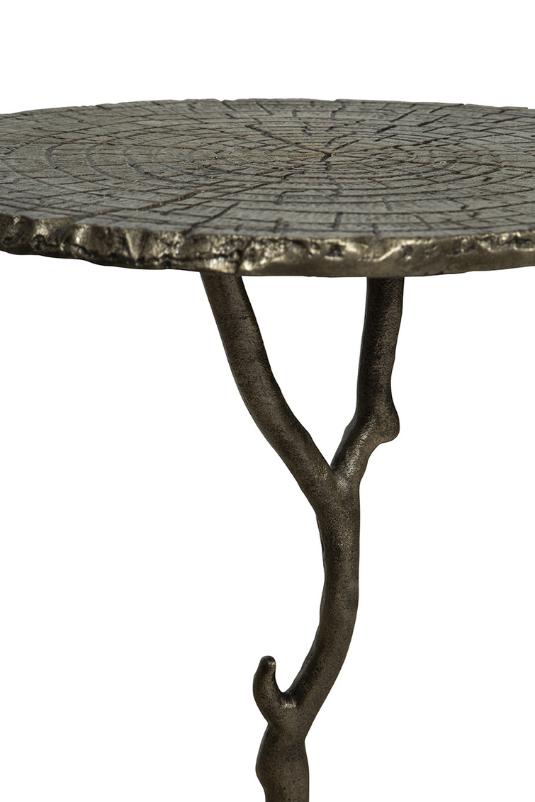 **Final Sale - All Items are sold as is, no returns unless damaged upon receipt. Introducing the Twigs End Table, a stunning blend of artistry and nature-inspired design. Crafted from cast aluminum brushed in gold, the table's base mimics the graceful shape of a tree branch, while the top emulates a natural tree slice. This piece beautifully combines form and function, drawing inspiration from the beauty of nature to create a unique and practical artistic statement.