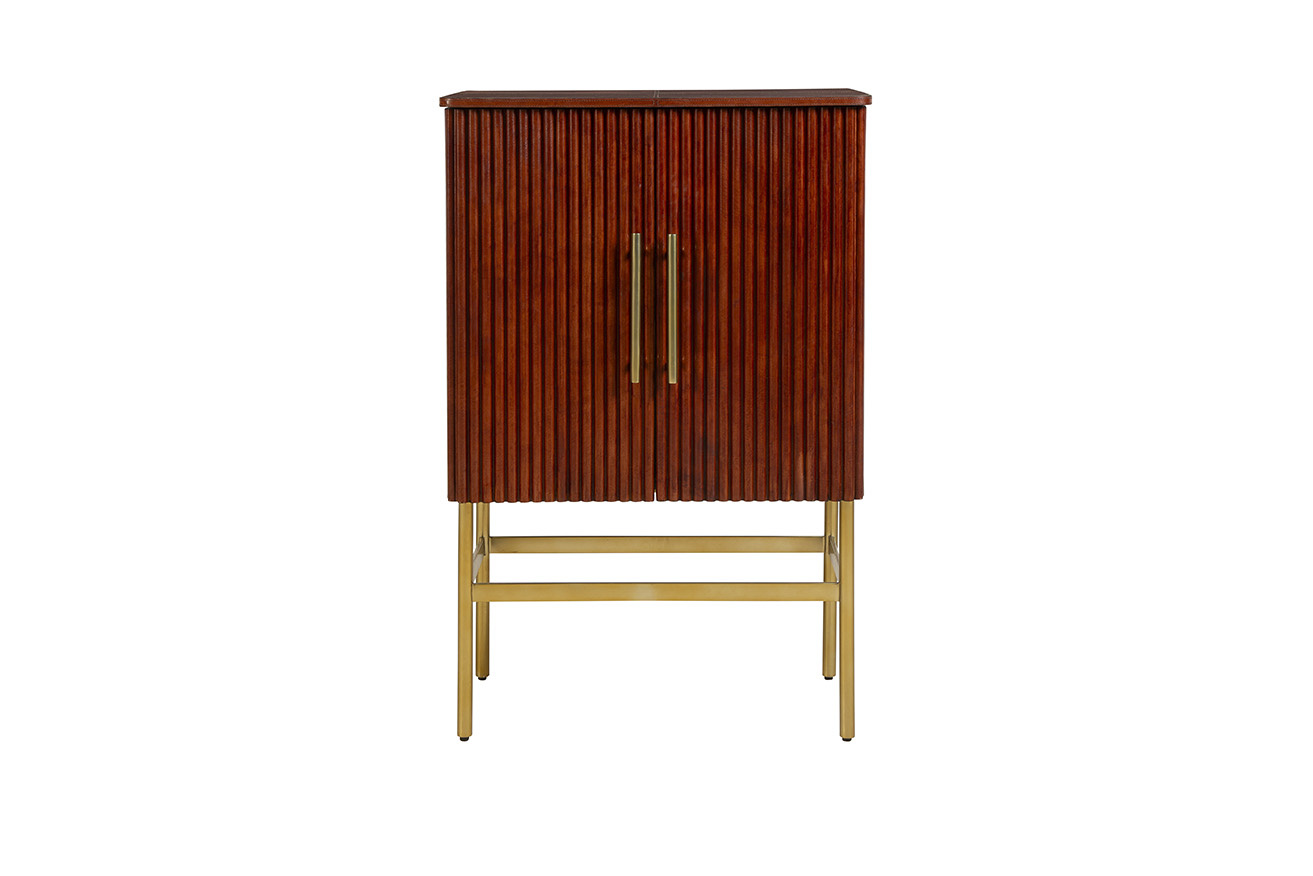 Introducing the Ricky Bar Cabinet, a true standout piece that redefines elegance and sophistication. Its rich wood exterior, featuring striking ridges, exudes a radiant glow that captivates the eye. The gold legs and handles create a beautiful contrast against the wood finish, adding a touch of luxury to the design. Inside, the cabinet boasts a sleek matte black finish accented by gold hardware and leather strapping, offering both style and functionality. To create a cohesive and elegantly impressive look, pair the Ricky Bar Cabinet with our Milo Hanging Mirror for a stunning impact that will leave your guests in awe.