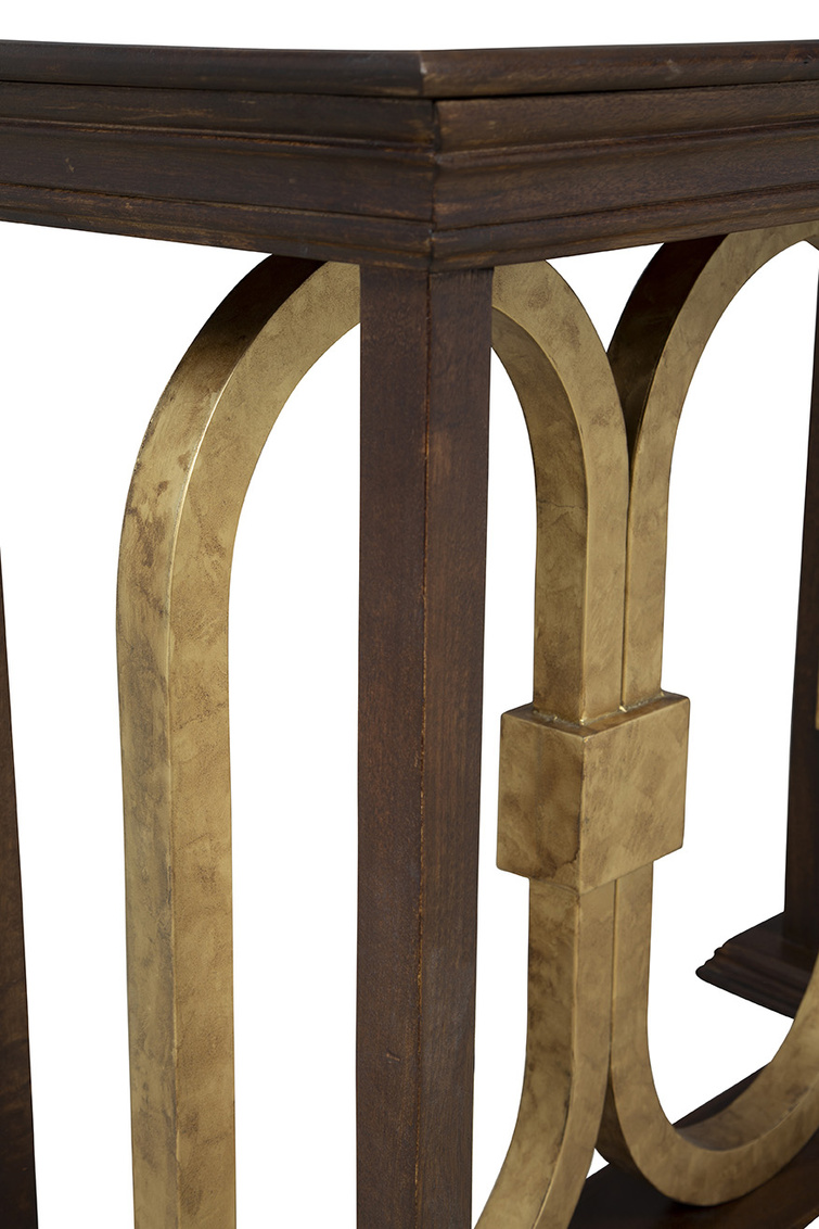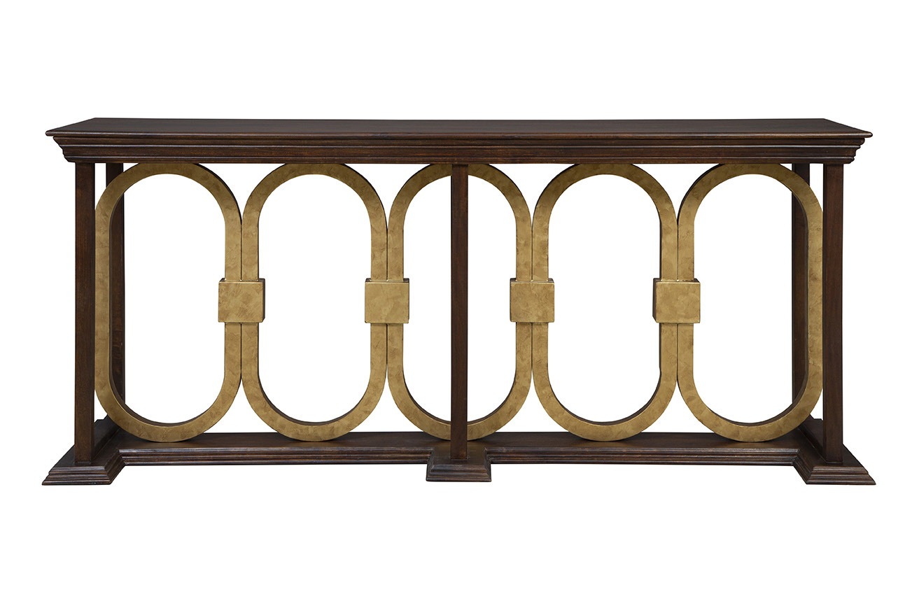 Introducing the Everly Console, a harmonious blend of traditional charm and contemporary elegance. The rich brown wood finish exudes a timeless appeal, while the golden ovals intricately bound together in the center add a touch of modern sophistication. Perfect for showcasing your favorite decor items, the Everly Console is a versatile and stylish addition to any space, combining classic warmth with a hint of contemporary flair.