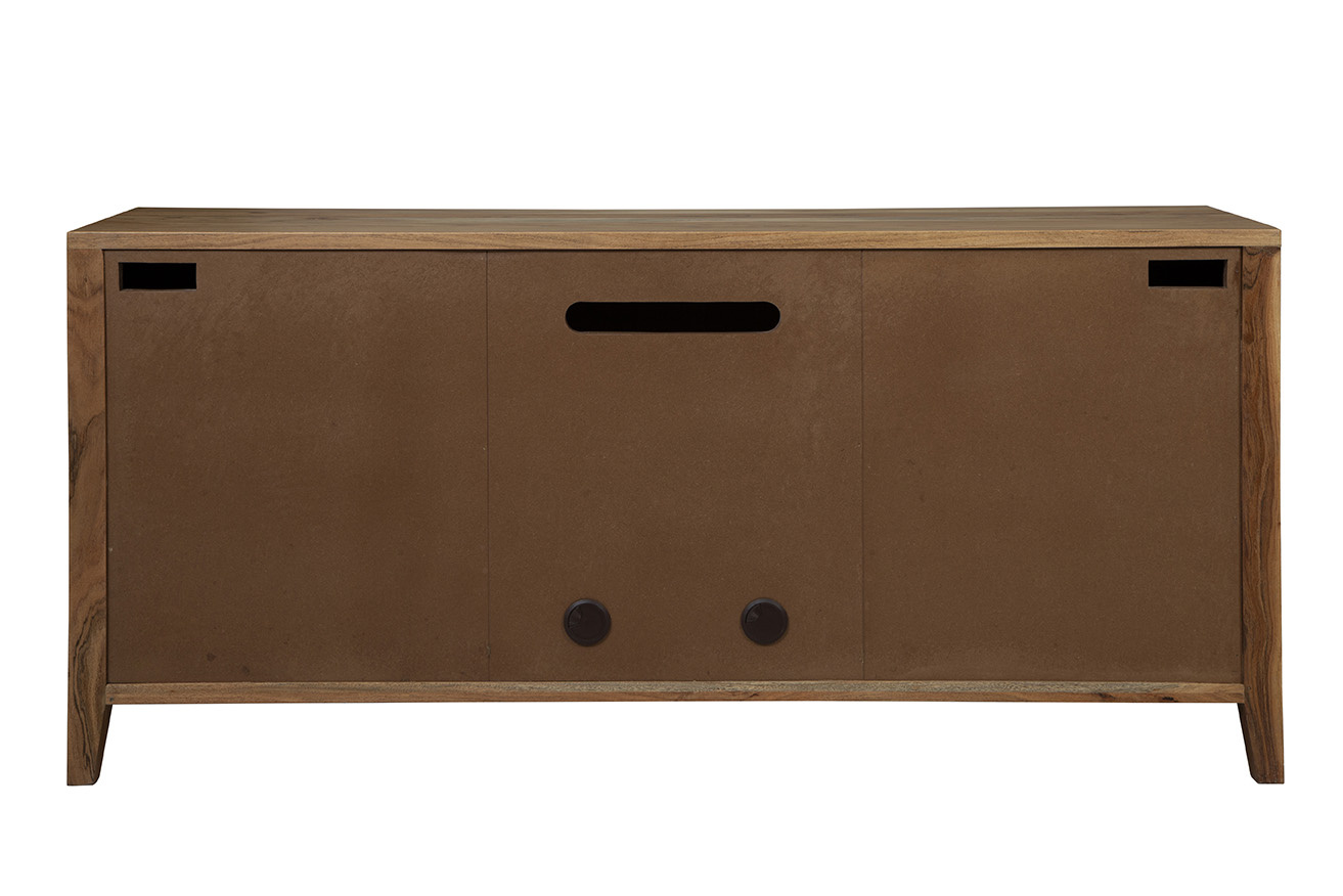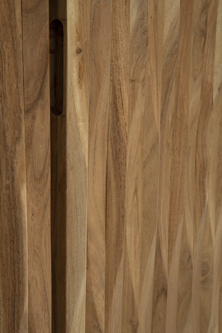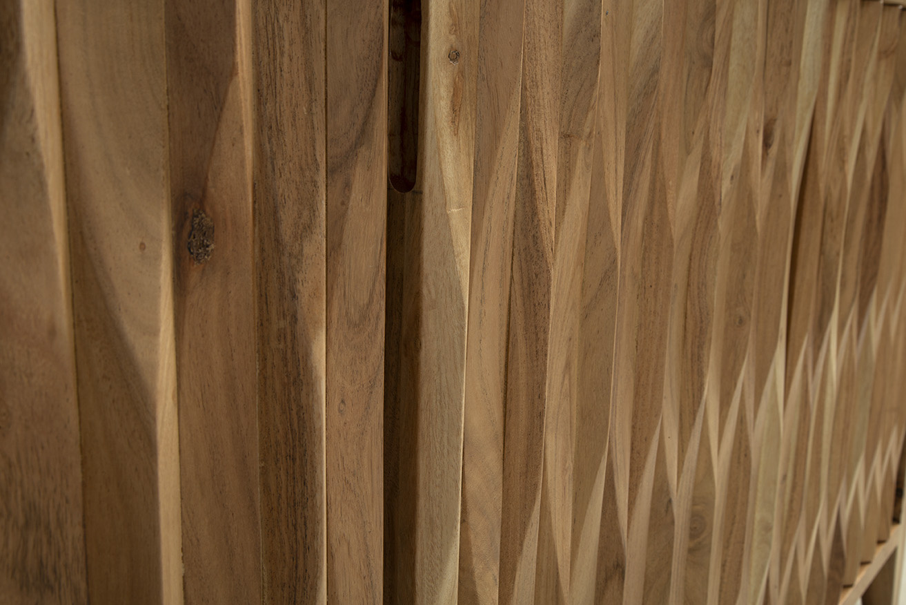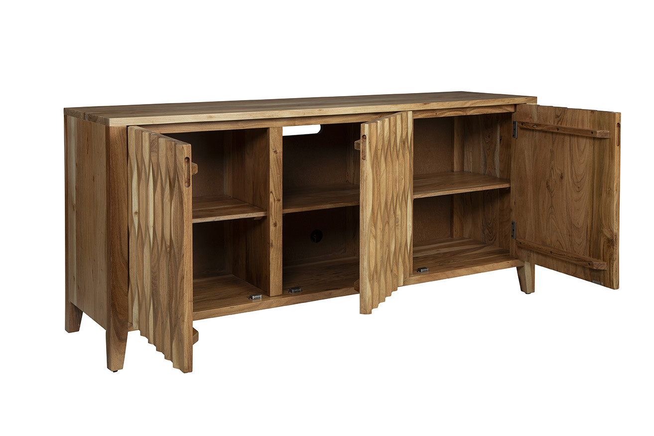 **Final Sale - All Items are sold as is, no returns unless damaged upon receipt. Introducing the Wintergreen Sideboard, a modern marvel crafted from solid wood with a light natural brown finish. Versatile enough to complement various interior styles, this sideboard exudes a contemporary vibe. Featuring three cabinet doors almost disguised by the rippled wood texture, the Wintergreen Sideboard opens to reveal separate storage compartments, providing a total of six storage cubes. Ideal for those seeking simple and organized hidden storage, this piece offers both style and functionality for neatly stowing away items while maintaining a sleek look in your space.