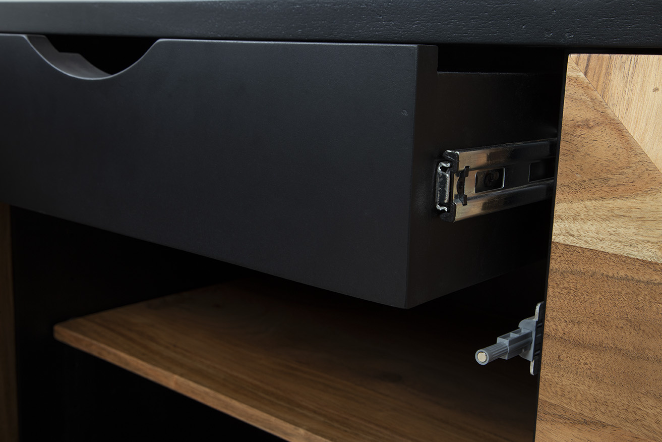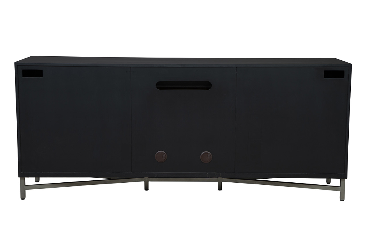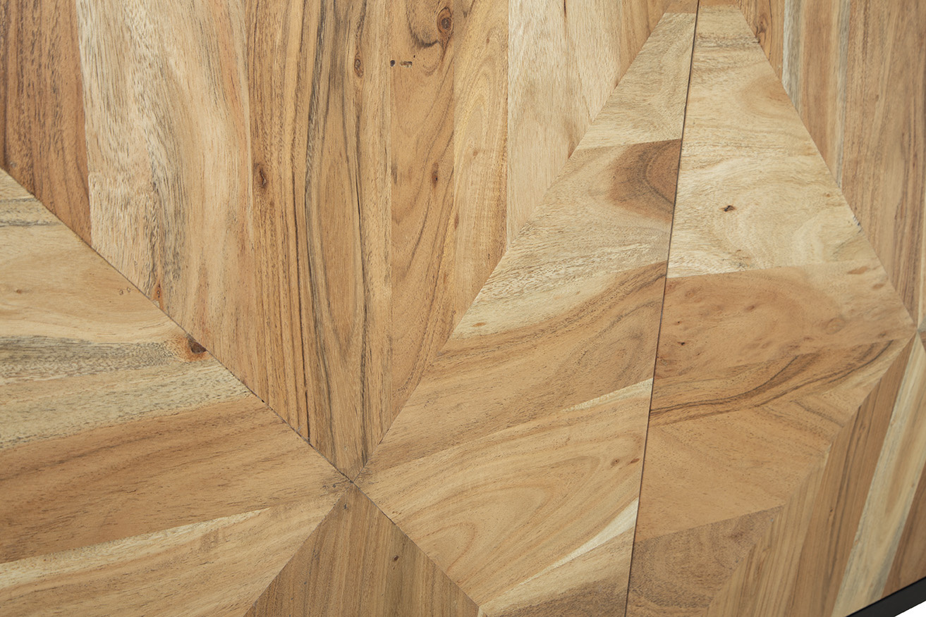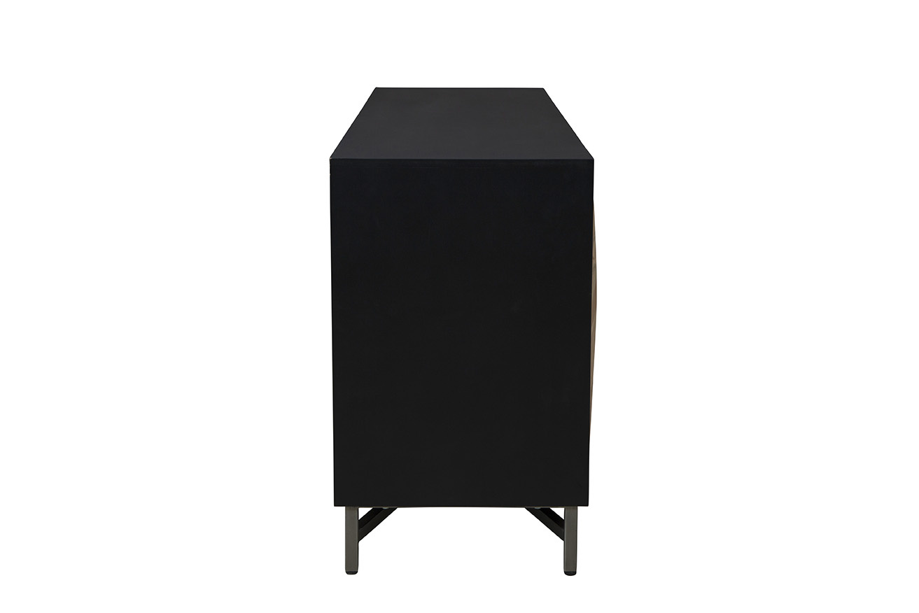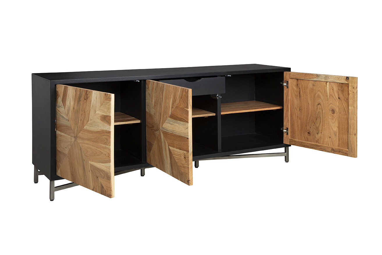 **Final Sale - All Items are sold as is, no returns unless damaged upon receipt. Introducing the Banks Sideboard, a striking modern furnishing crafted from solid wood with sleek metal legs. The bold black finish paired with light brown doors creates a visually captivating contrast, making this piece truly stand out. Featuring six internal cubes, a convenient middle drawer, and an inner shelf mirroring the outer doors' beauty, the Banks Sideboard provides ample storage space with style. The attention-grabbing triangular pattern on the console's doors adds a unique and eye-catching element to this contemporary statement piece.